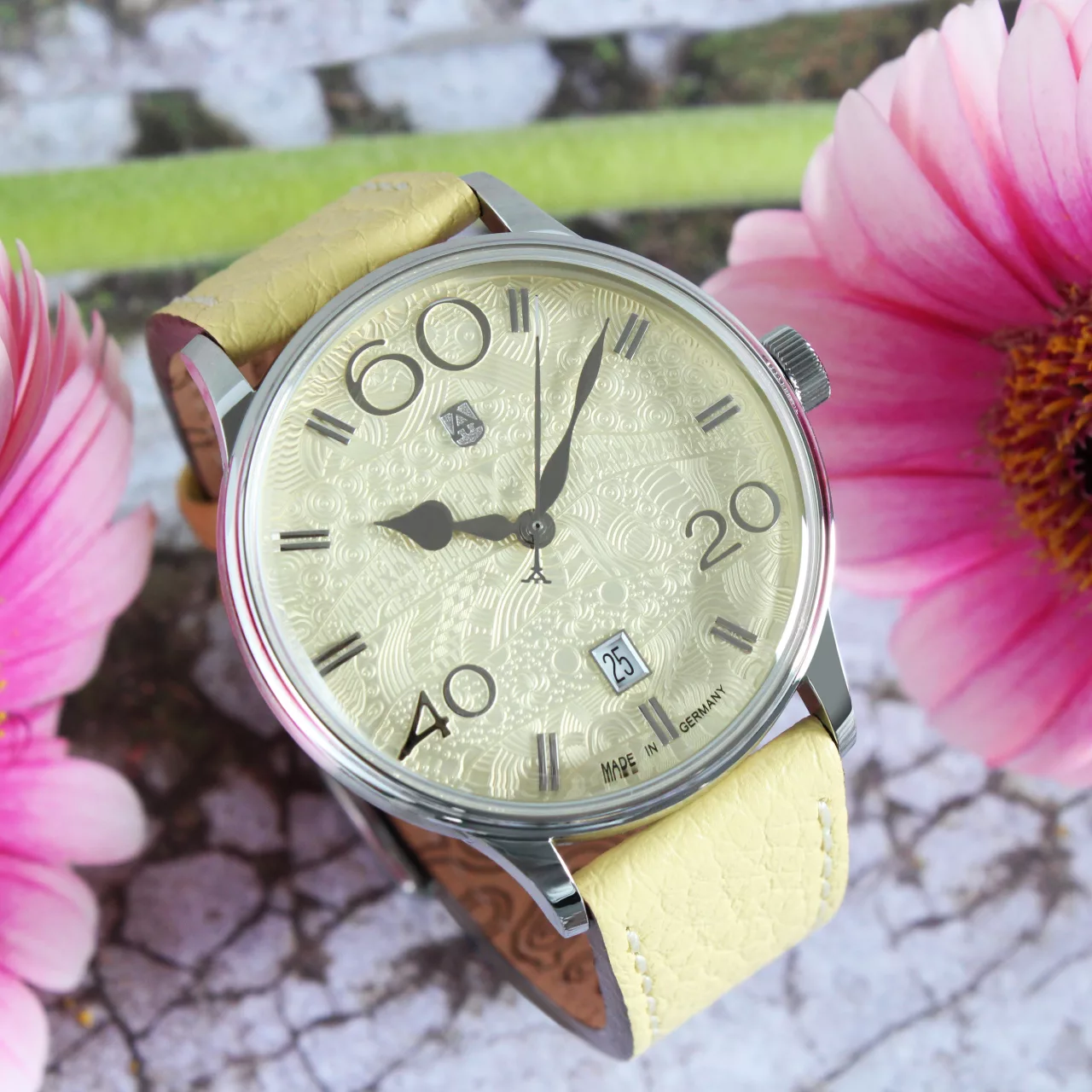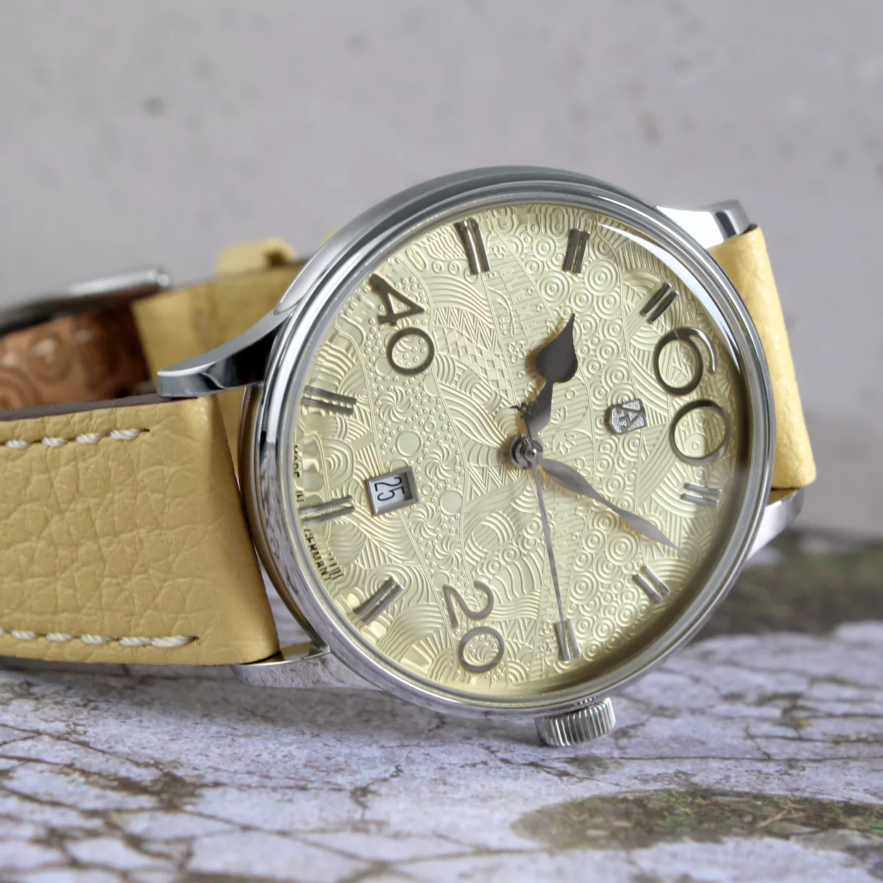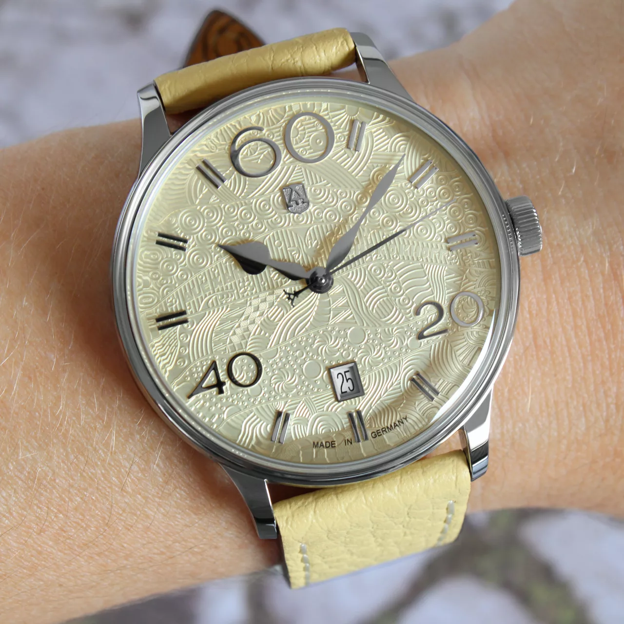 - Dial: Pastel yellow with avant-garde embossed pattern