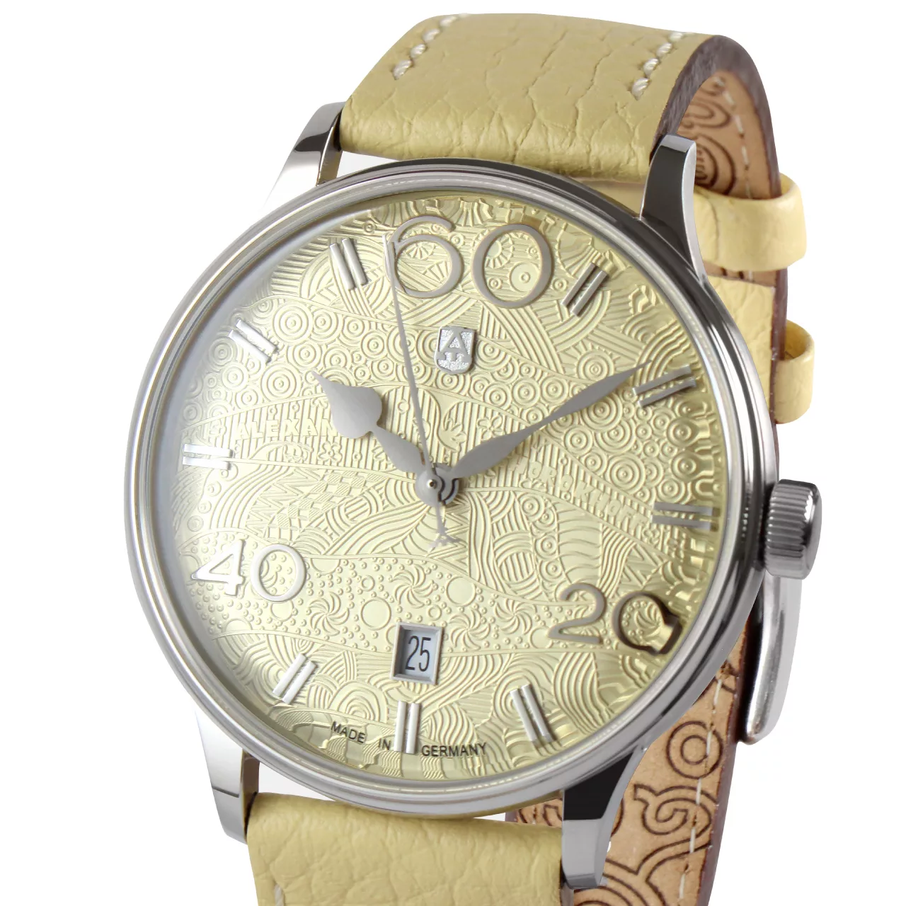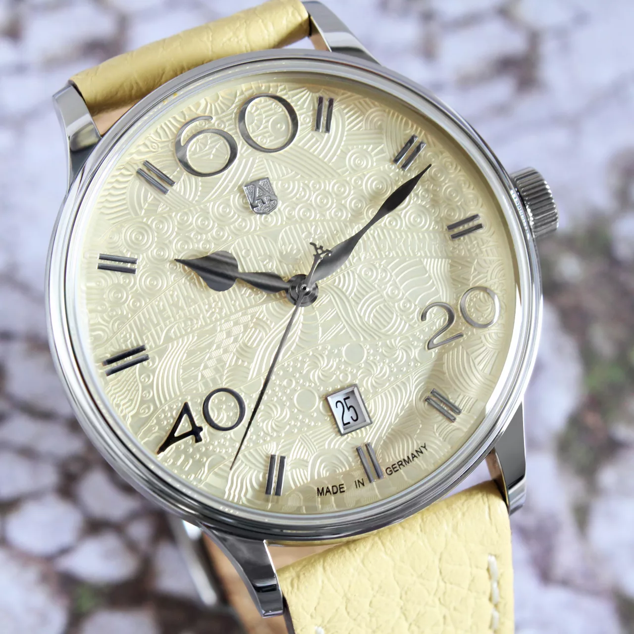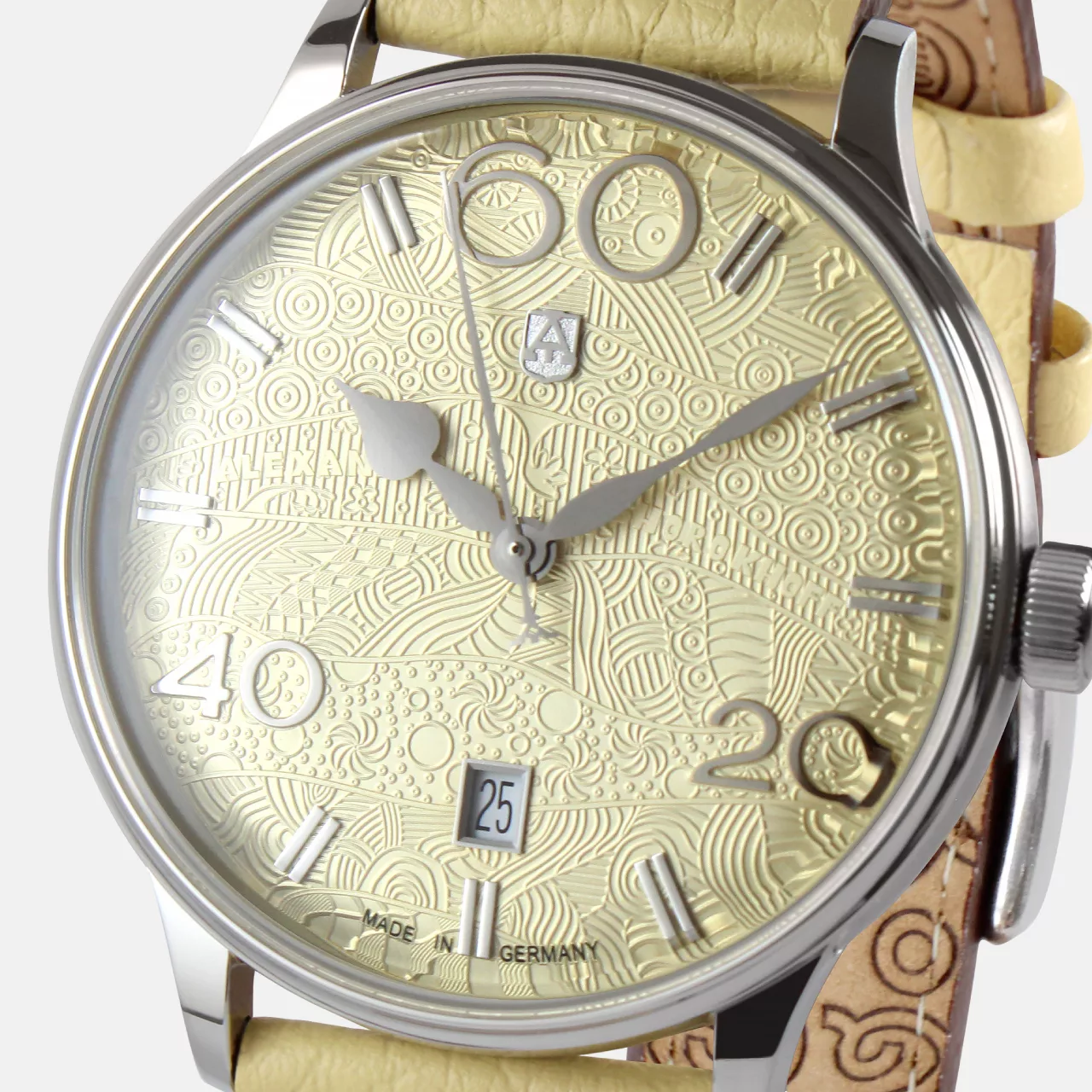 - Dial: Pastel yellow with avant-garde embossed pattern