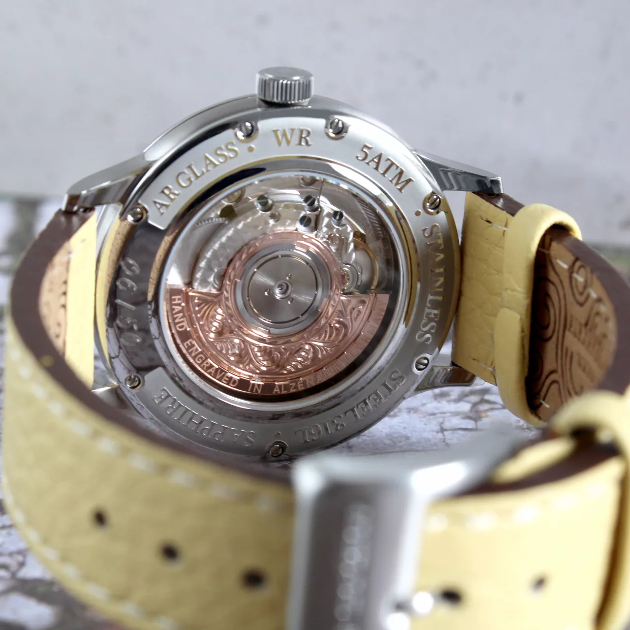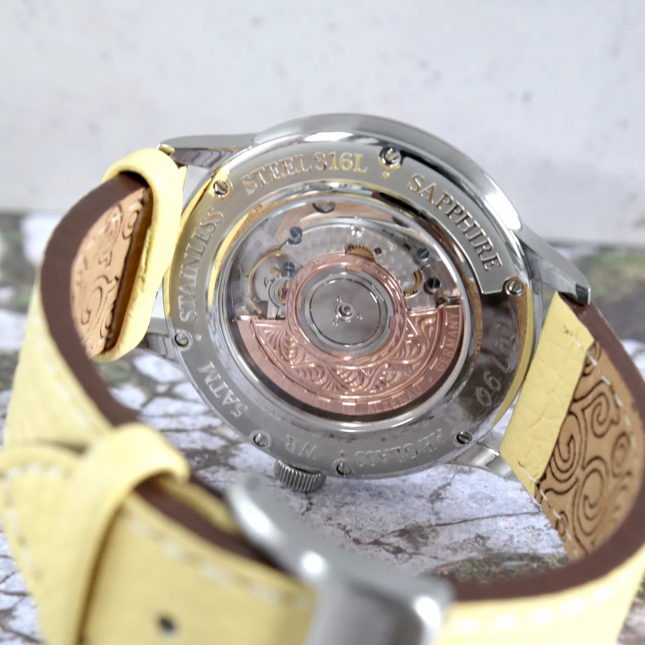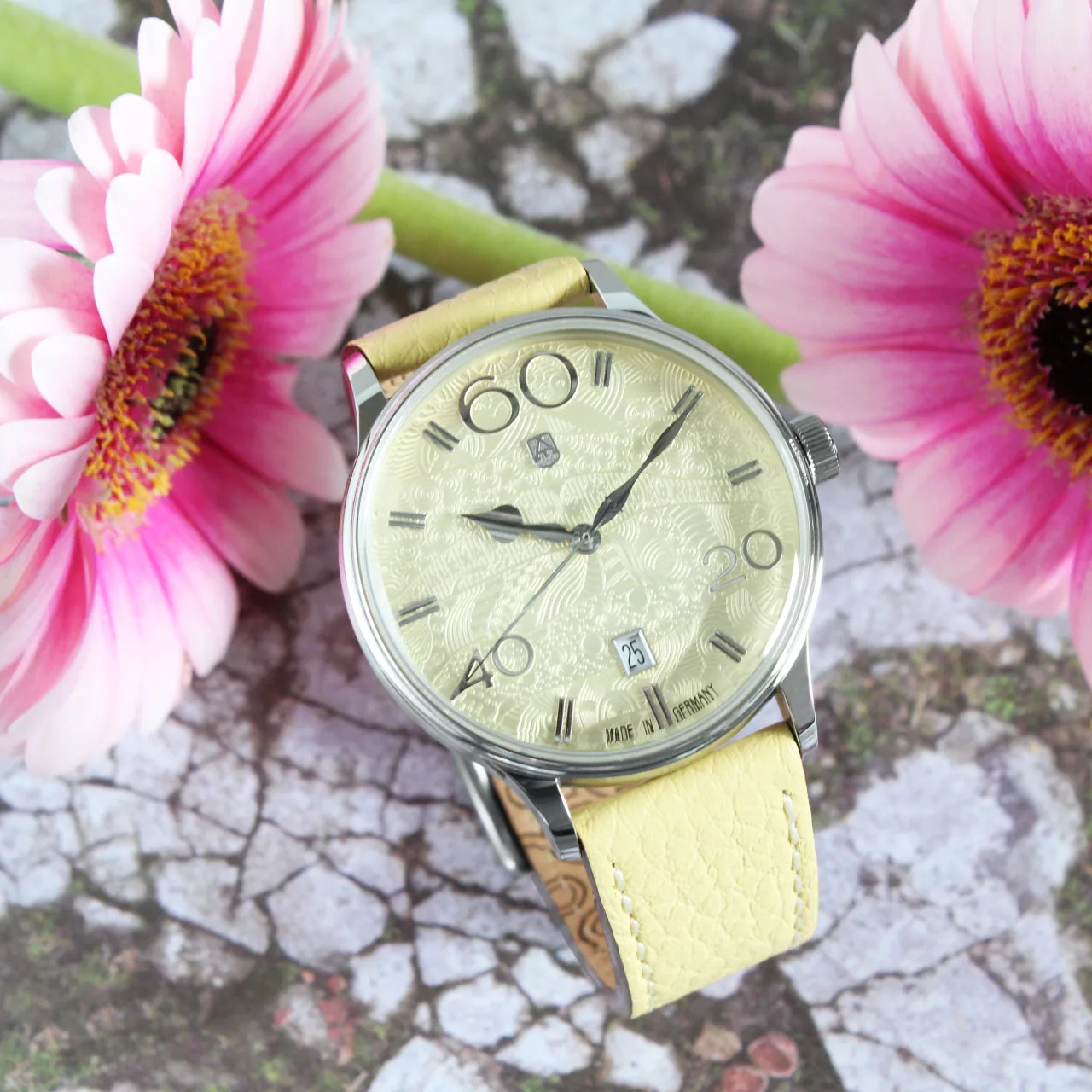 - Strap: Genuine pastel yellow calfskin strap with decorative stitching and engraved solid steel pin buckle