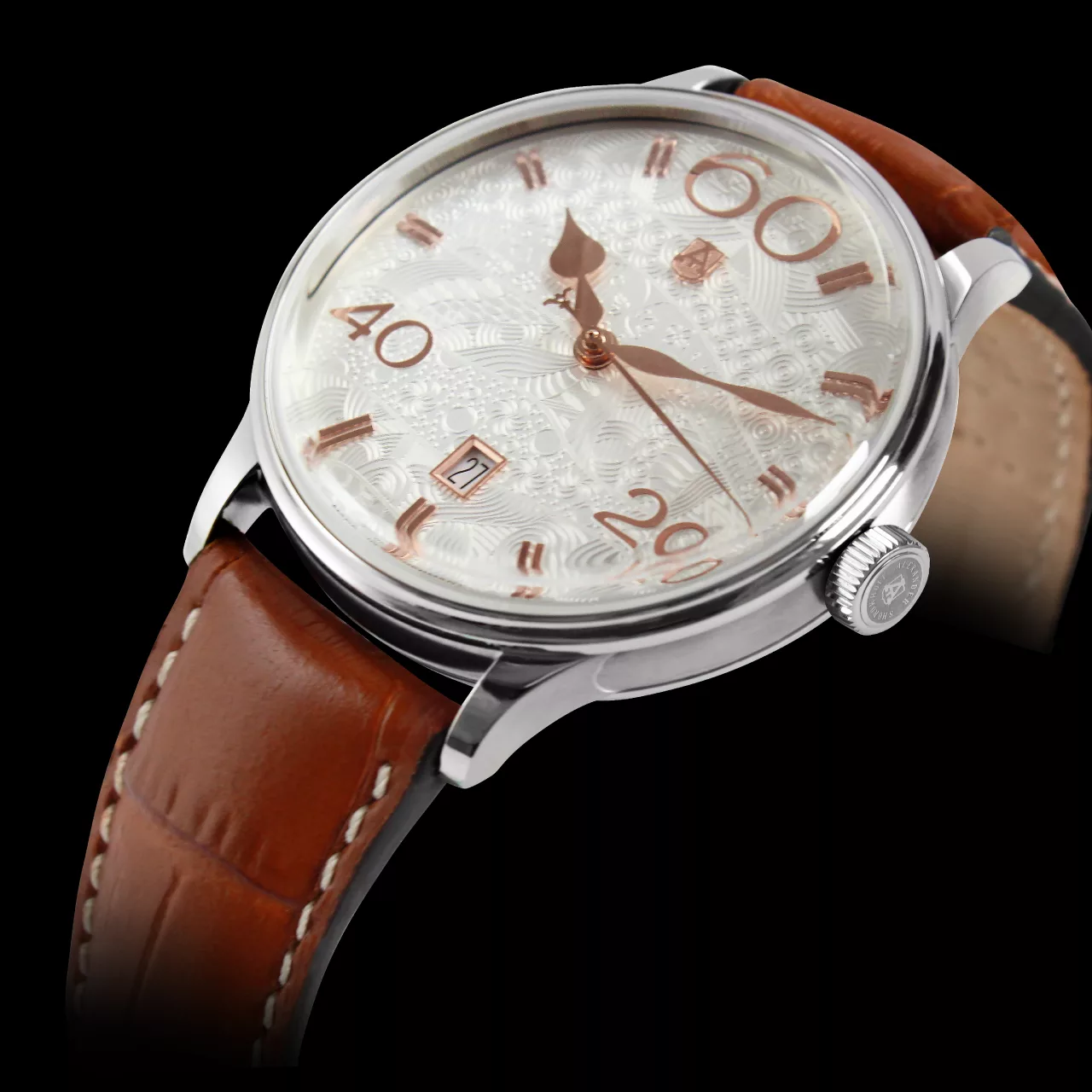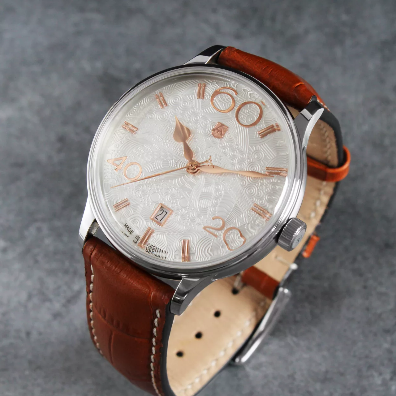 - Strap: Genuine brown leather strap with light decorative stitching and engraved solid steel pin buckle