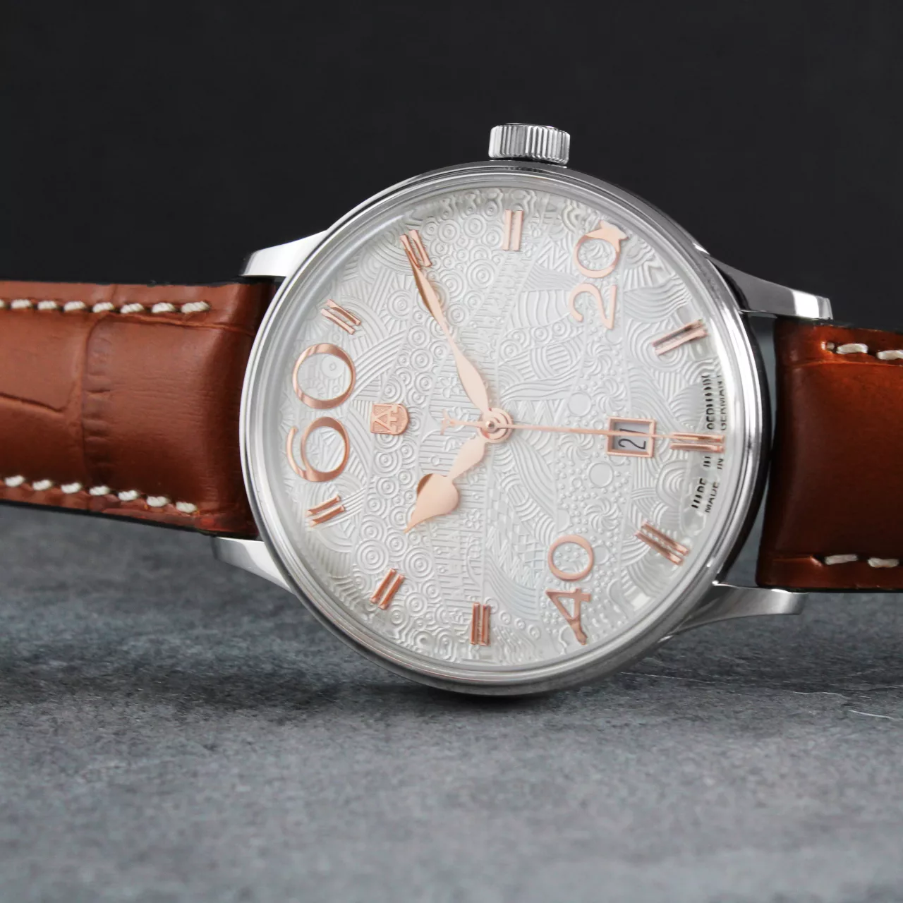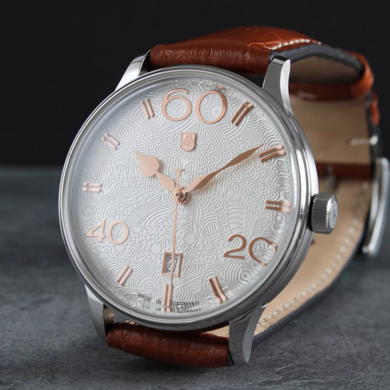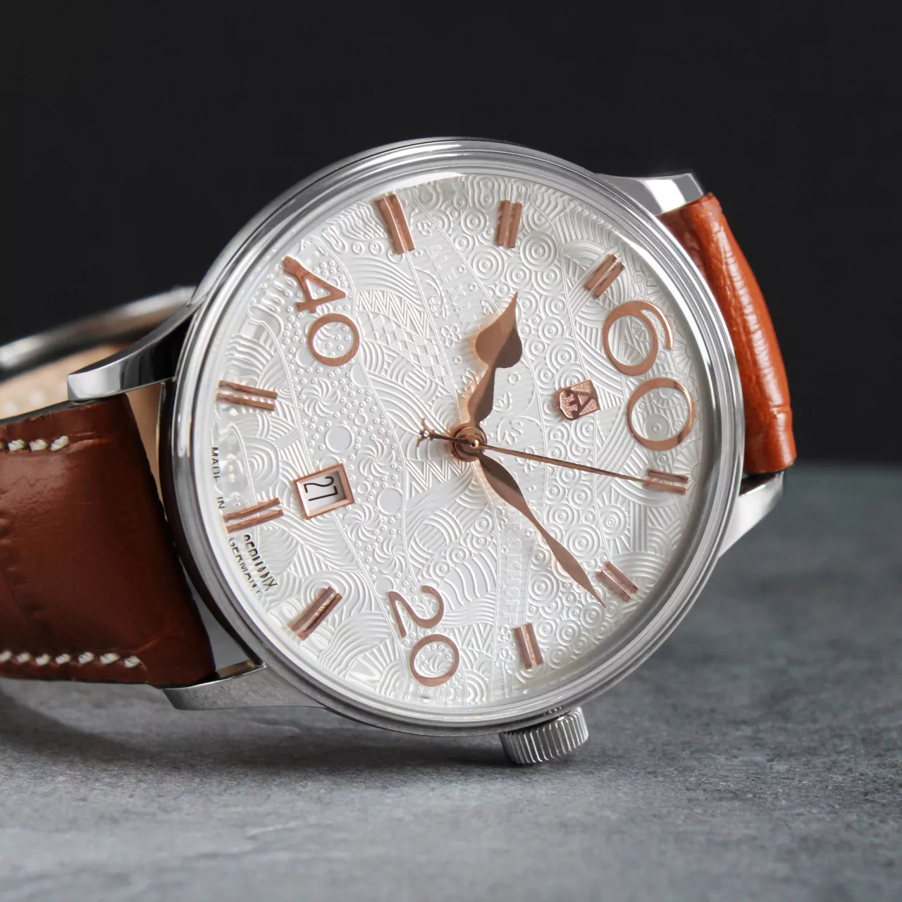 The most striking element is its dial, entirely adorned with an avant-garde embossed pattern that forms a bold and artistic visual composition. Large, iconic numerals at 60, 20, and 40 anchor the design, while the play of textures adds depth and a sense of movement. The dial is complemented by refined rose gold-coloured hands that balance elegance with readability.