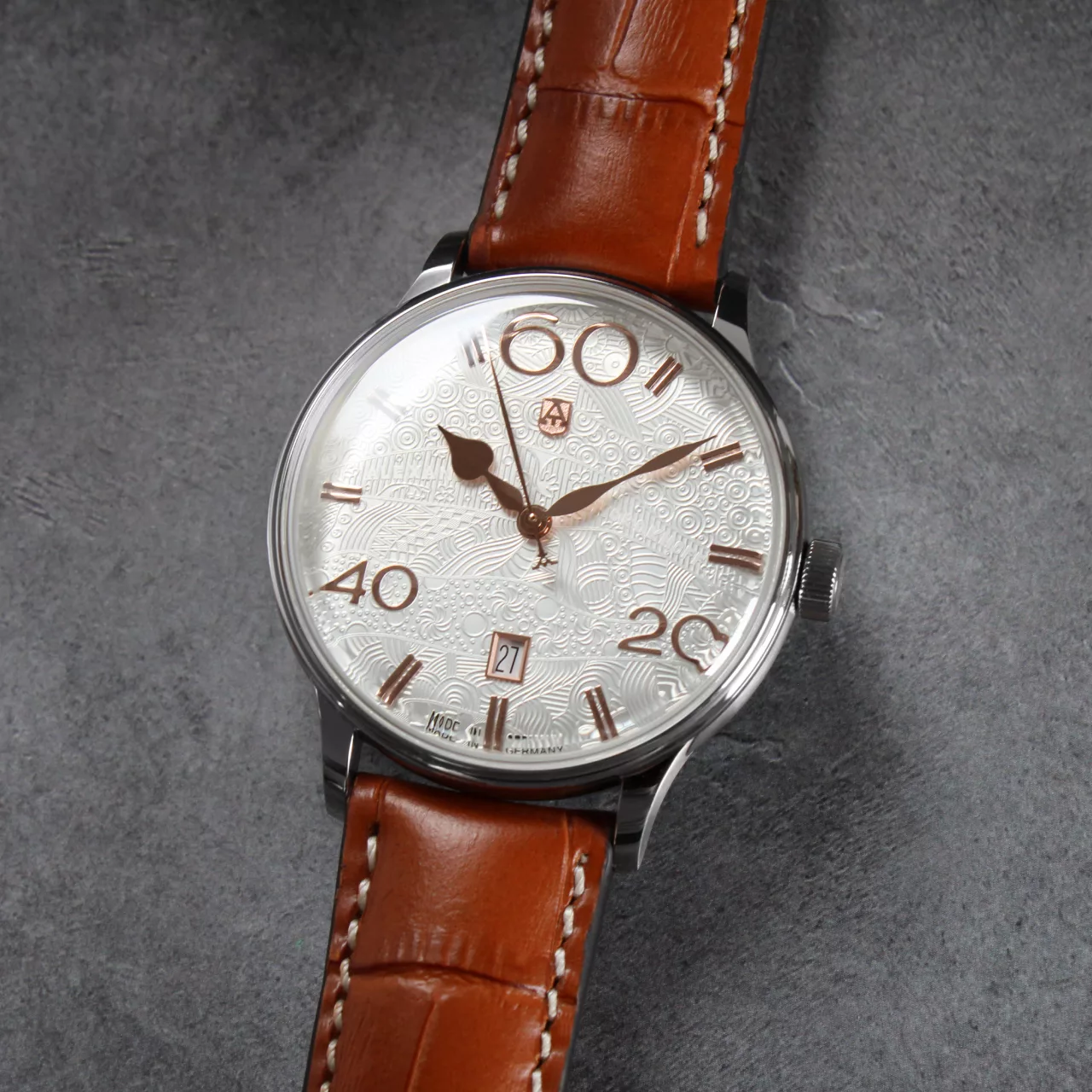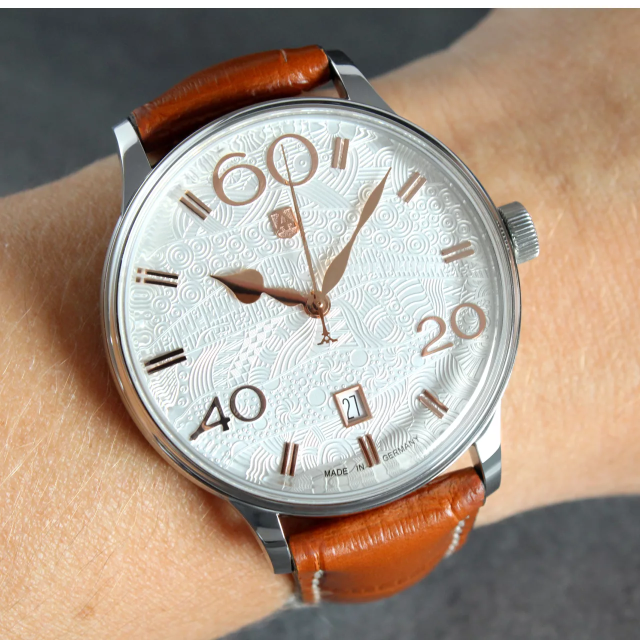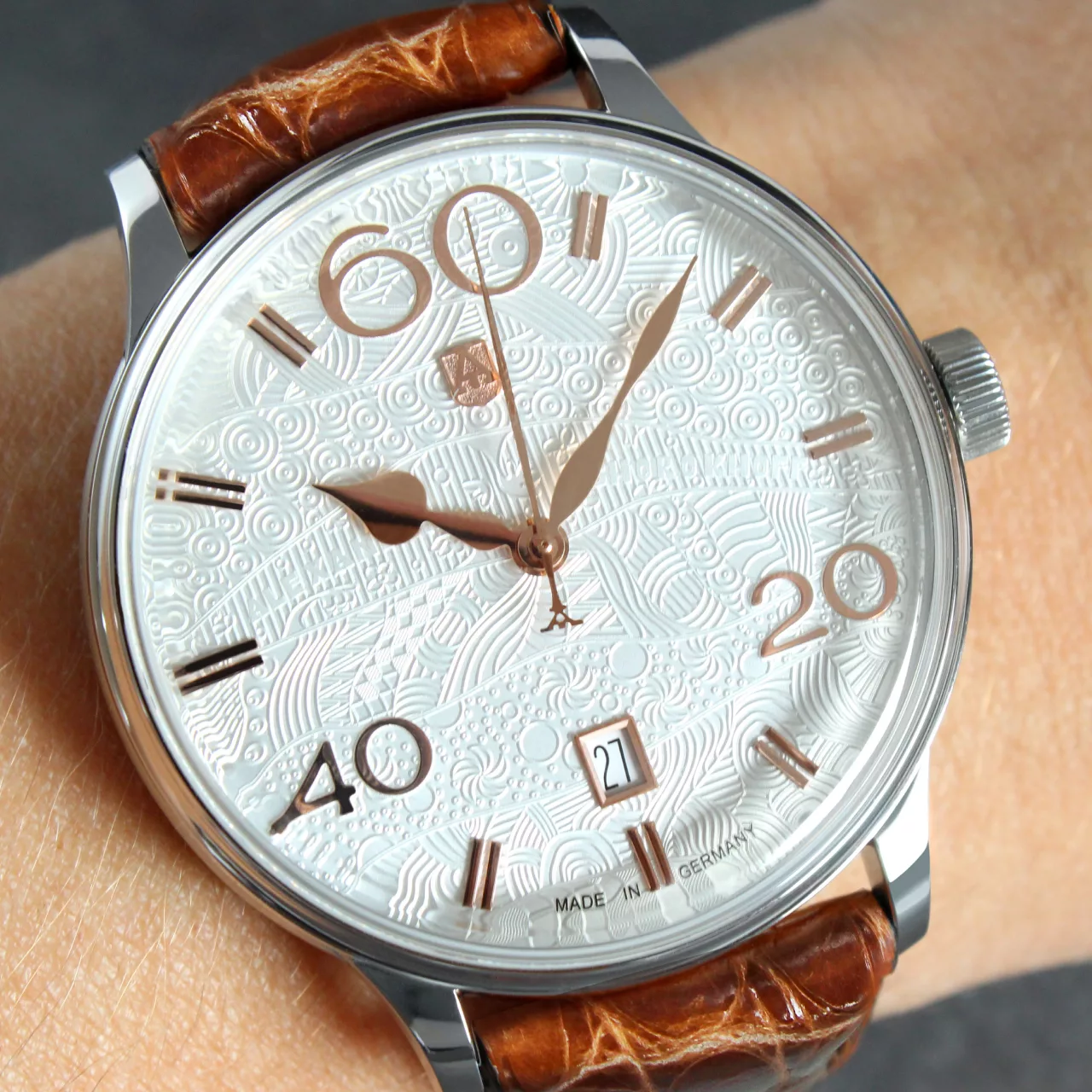 The most striking element is its dial, entirely adorned with an avant-garde embossed pattern that forms a bold and artistic visual composition. Large, iconic numerals at 60, 20, and 40 anchor the design, while the play of textures adds depth and a sense of movement. The dial is complemented by refined rose gold-coloured hands that balance elegance with readability.