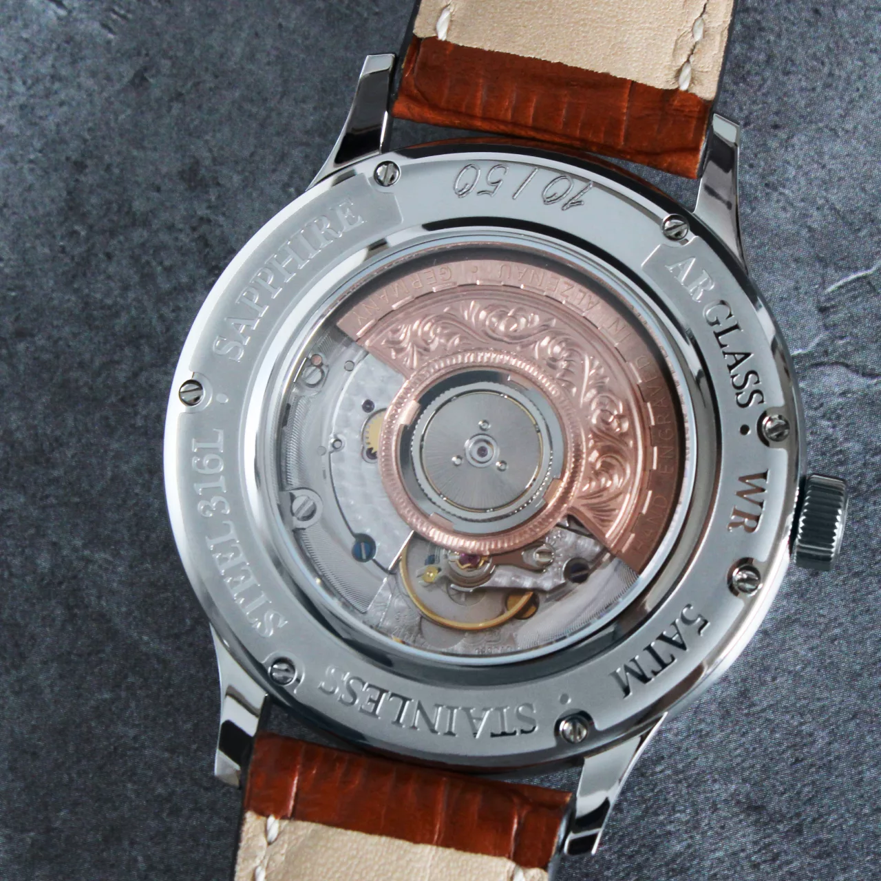 Paired with a high-quality brown leather strap featuring decorative stitching and a solid engraved pin buckle, the watch carries its avant-garde personality effortlessly. Limited to only 50 pieces worldwide, the Emotio Uno represents individuality and exclusivity at an appealing value.