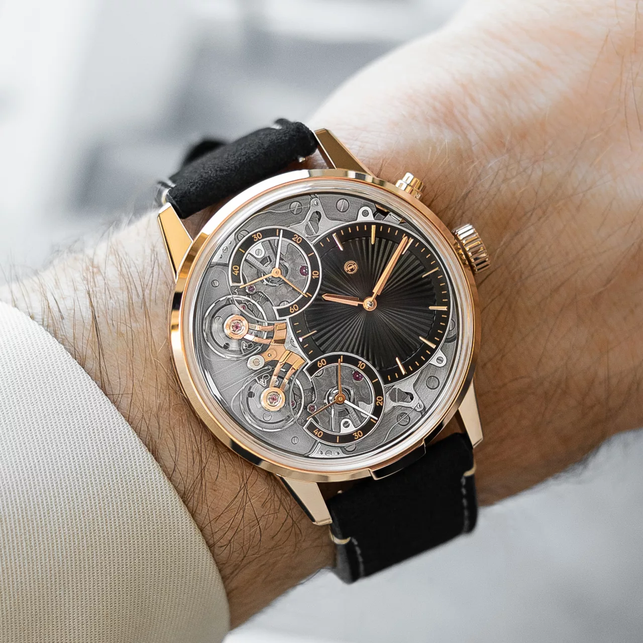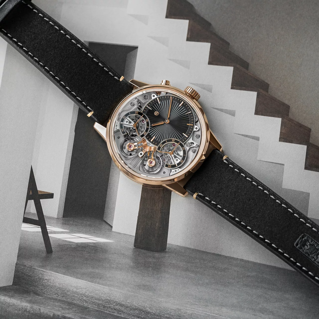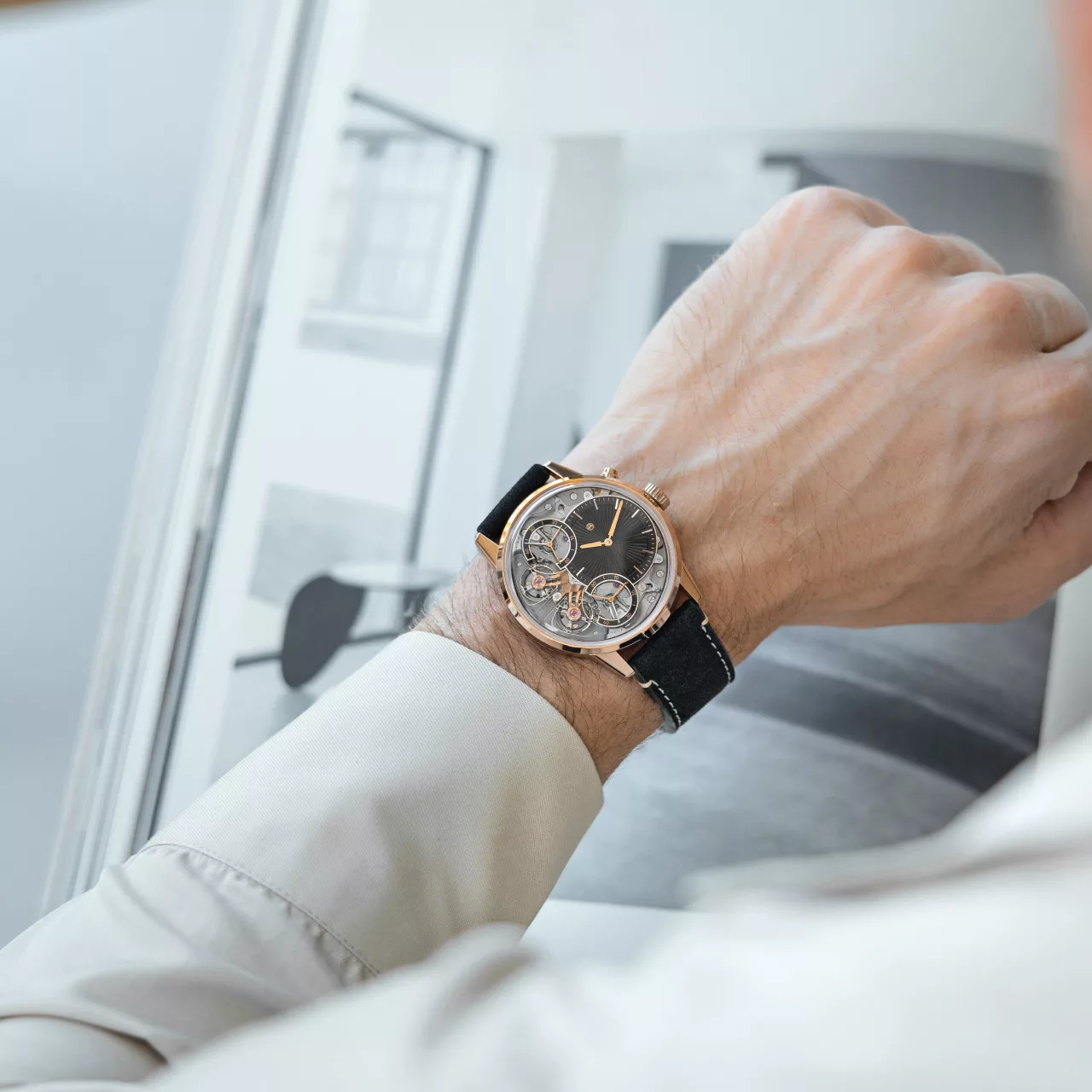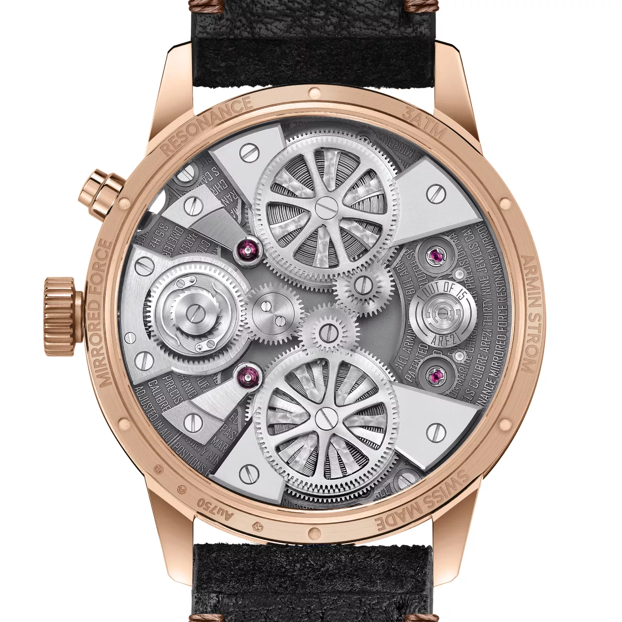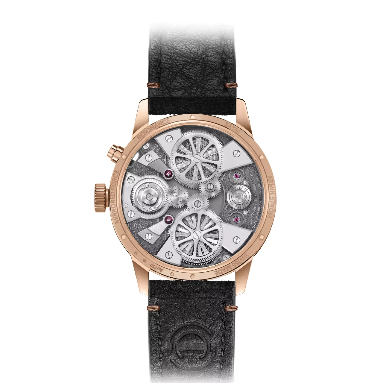 Armin Strom has enriched its renowned Mirrored Force Resonance collection with a striking new interpretation, presented for the first time in an 18K rose gold case. The warm tones of this precious metal, alternating between brushed and polished finishes, give the 43 mm case a distinguished presence on the wrist. Paired with a dark grey Alcantara strap, the design is both refined and contemporary, embodying the harmonious blend of traditional craftsmanship and modern innovation that defines the brand.