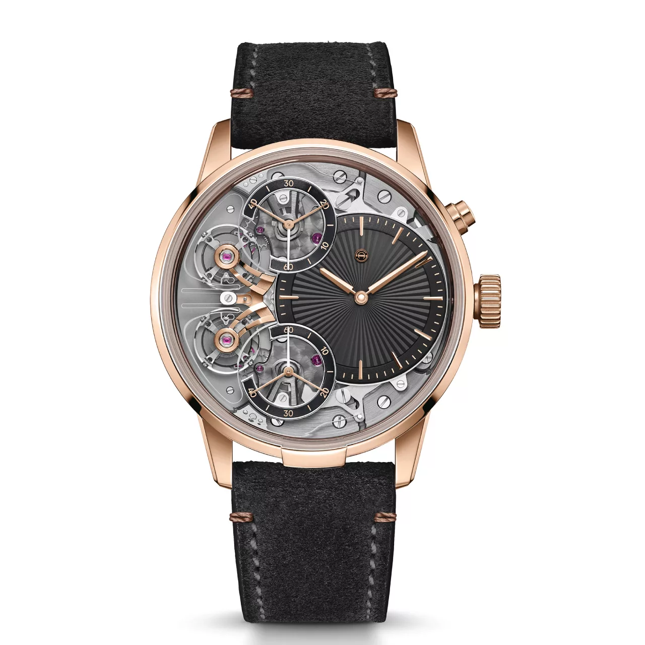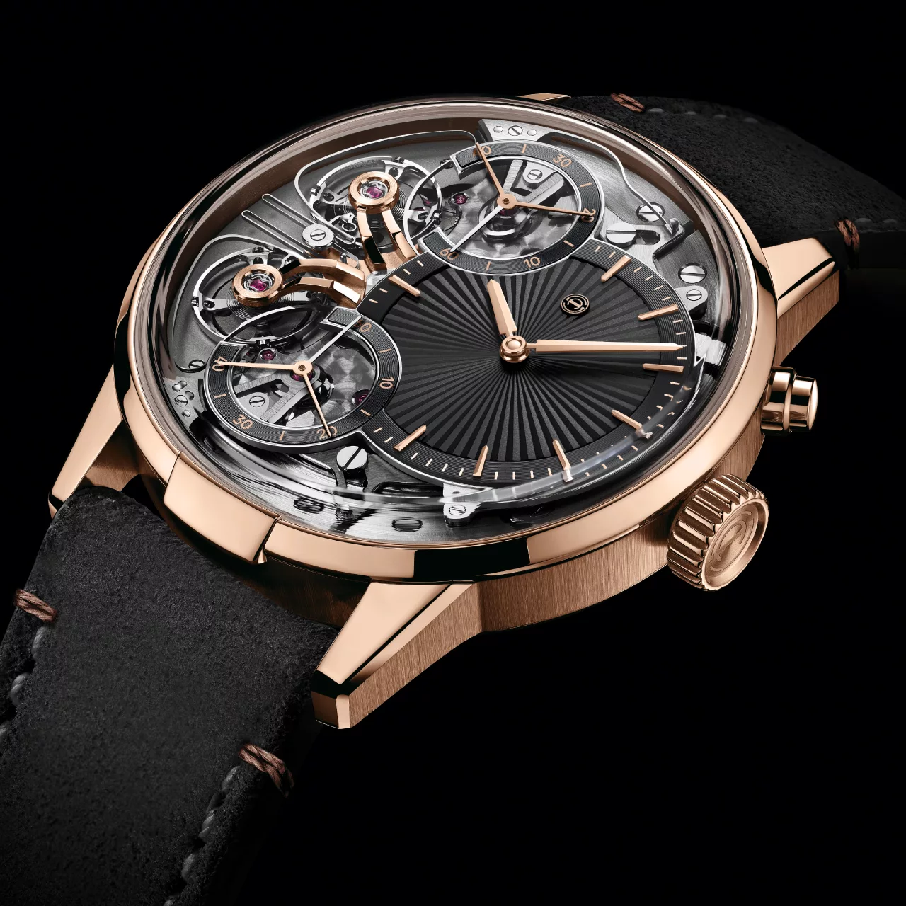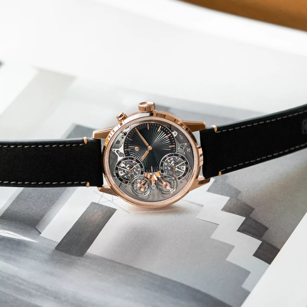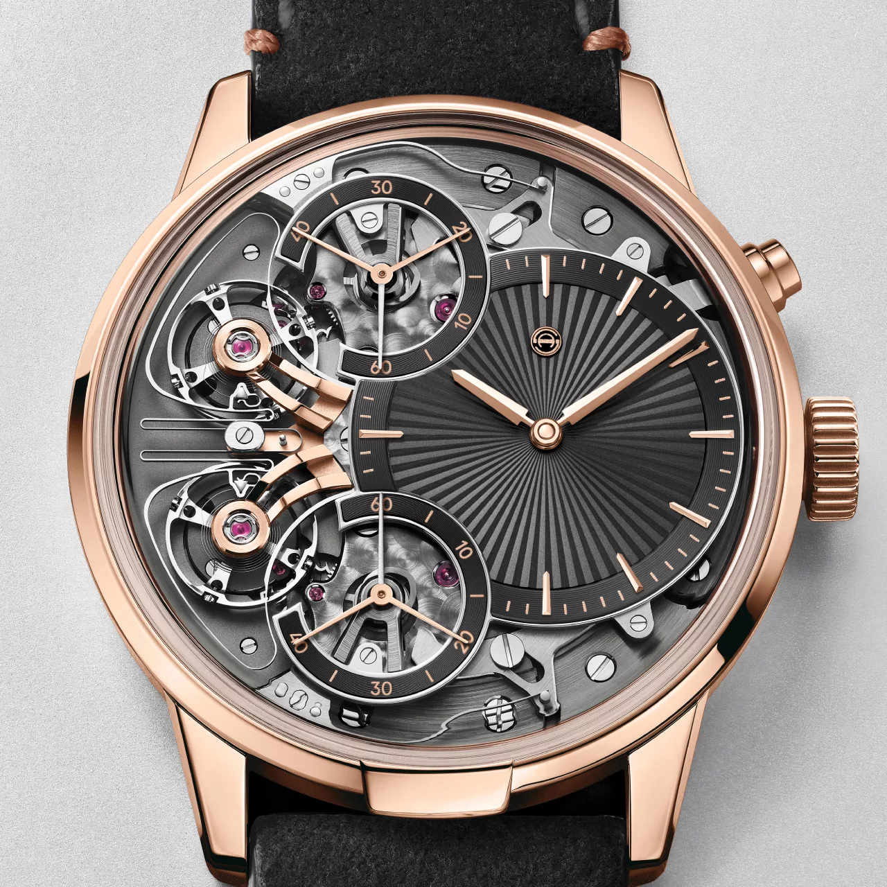 Armin Strom has enriched its renowned Mirrored Force Resonance collection with a striking new interpretation, presented for the first time in an 18K rose gold case. The warm tones of this precious metal, alternating between brushed and polished finishes, give the 43 mm case a distinguished presence on the wrist. Paired with a dark grey Alcantara strap, the design is both refined and contemporary, embodying the harmonious blend of traditional craftsmanship and modern innovation that defines the brand.