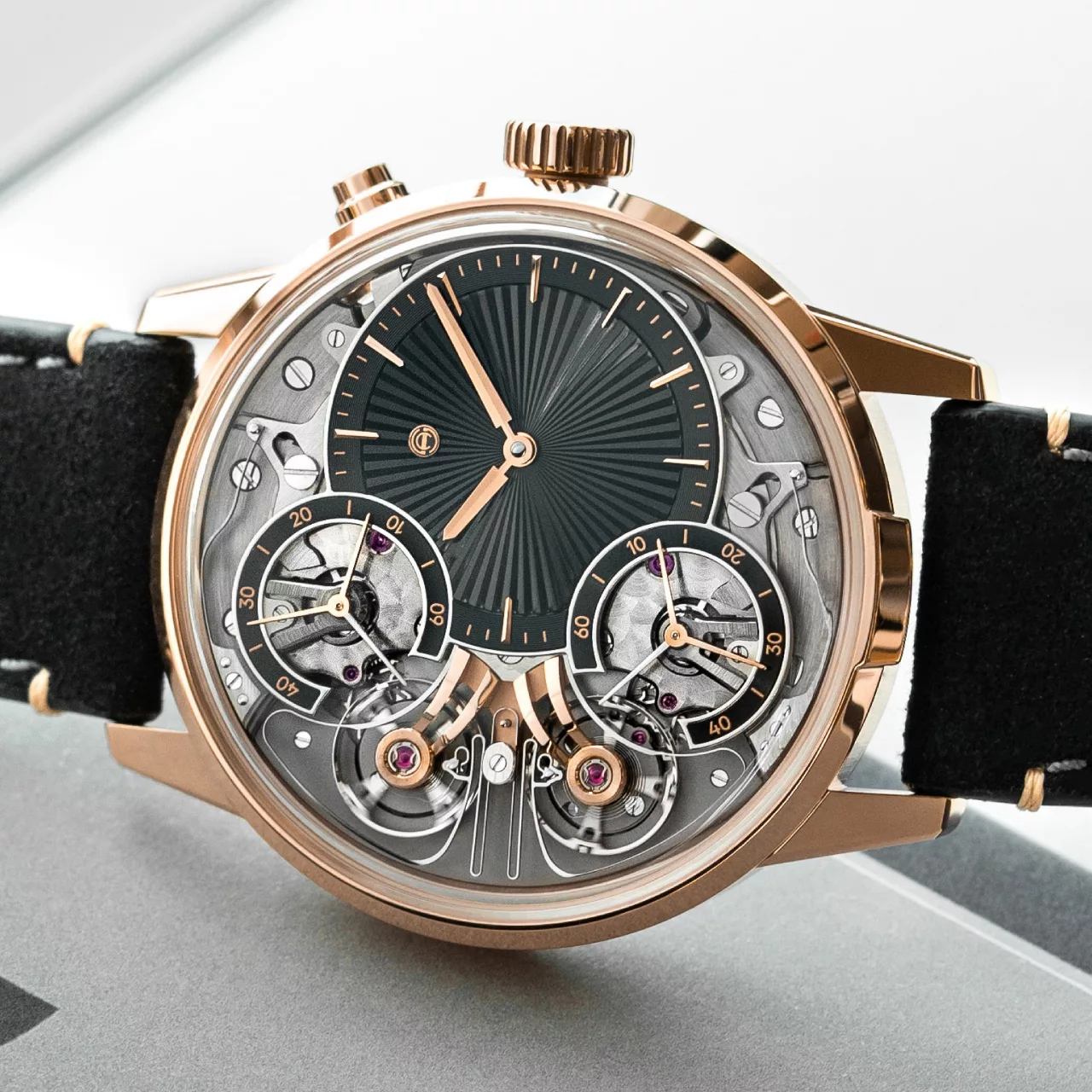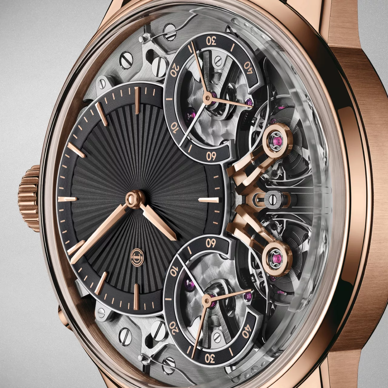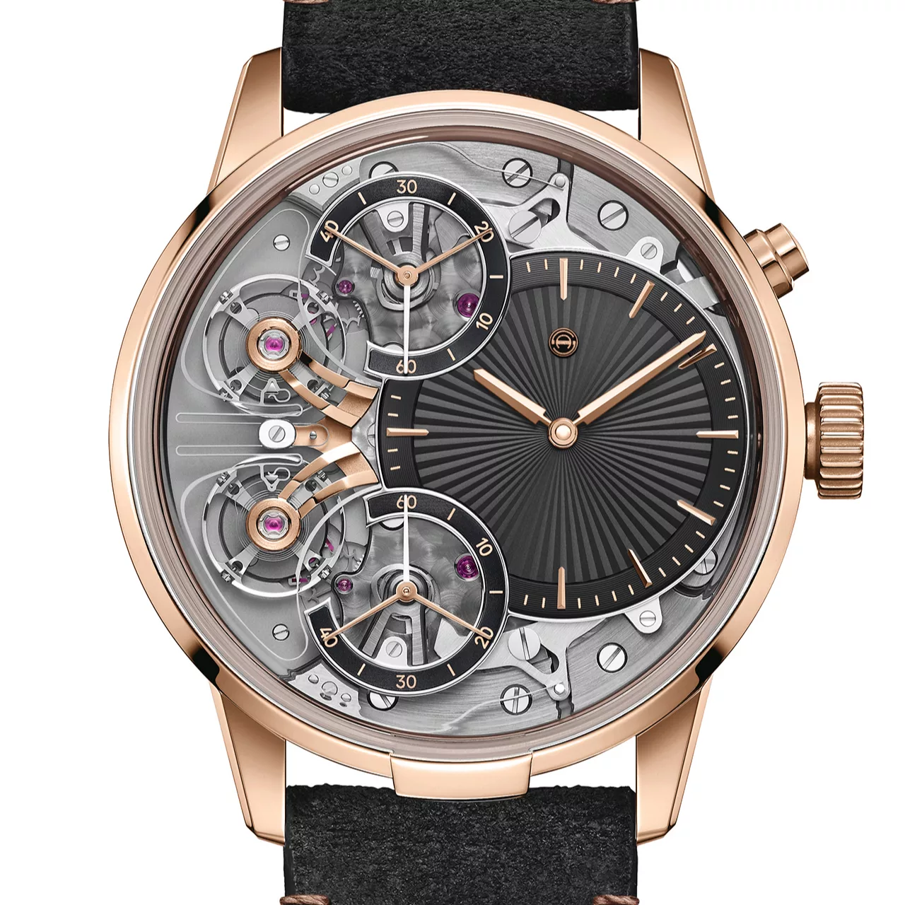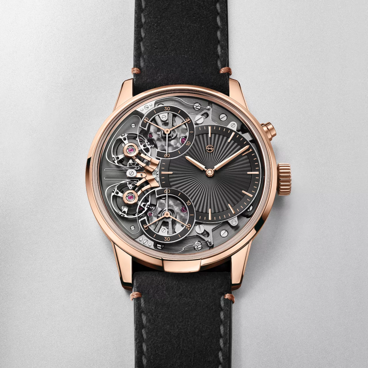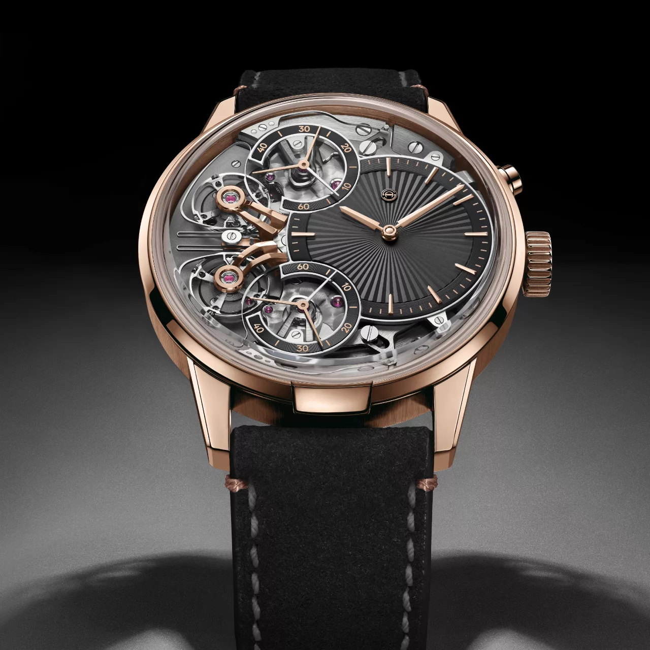 Armin Strom has enriched its renowned Mirrored Force Resonance collection with a striking new interpretation, presented for the first time in an 18K rose gold case. The warm tones of this precious metal, alternating between brushed and polished finishes, give the 43 mm case a distinguished presence on the wrist. Paired with a dark grey Alcantara strap, the design is both refined and contemporary, embodying the harmonious blend of traditional craftsmanship and modern innovation that defines the brand.