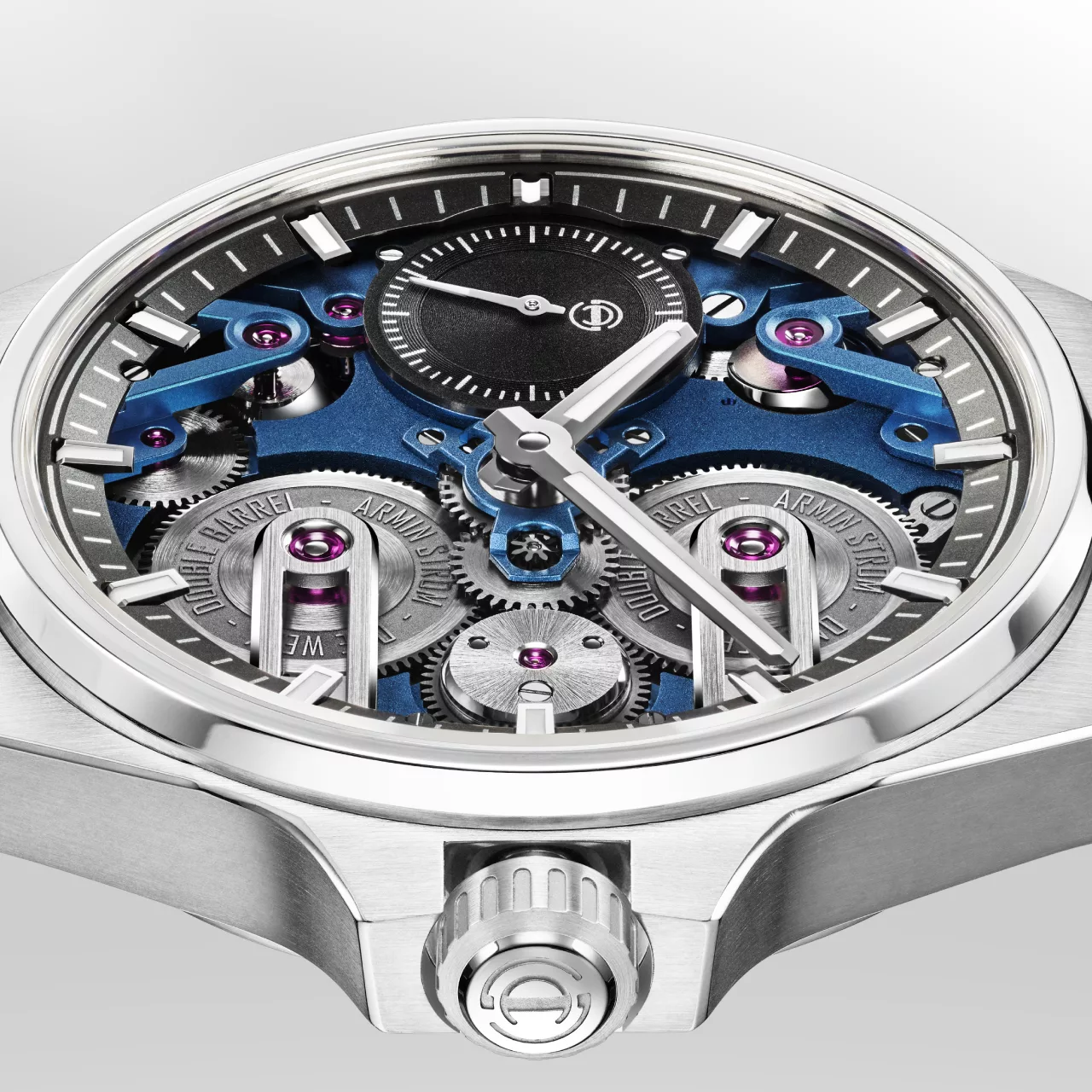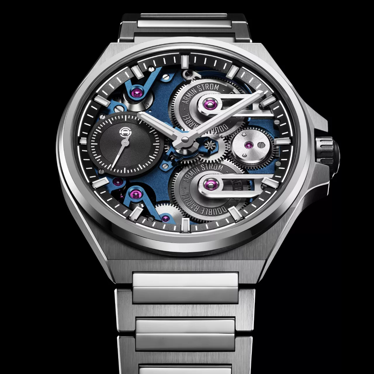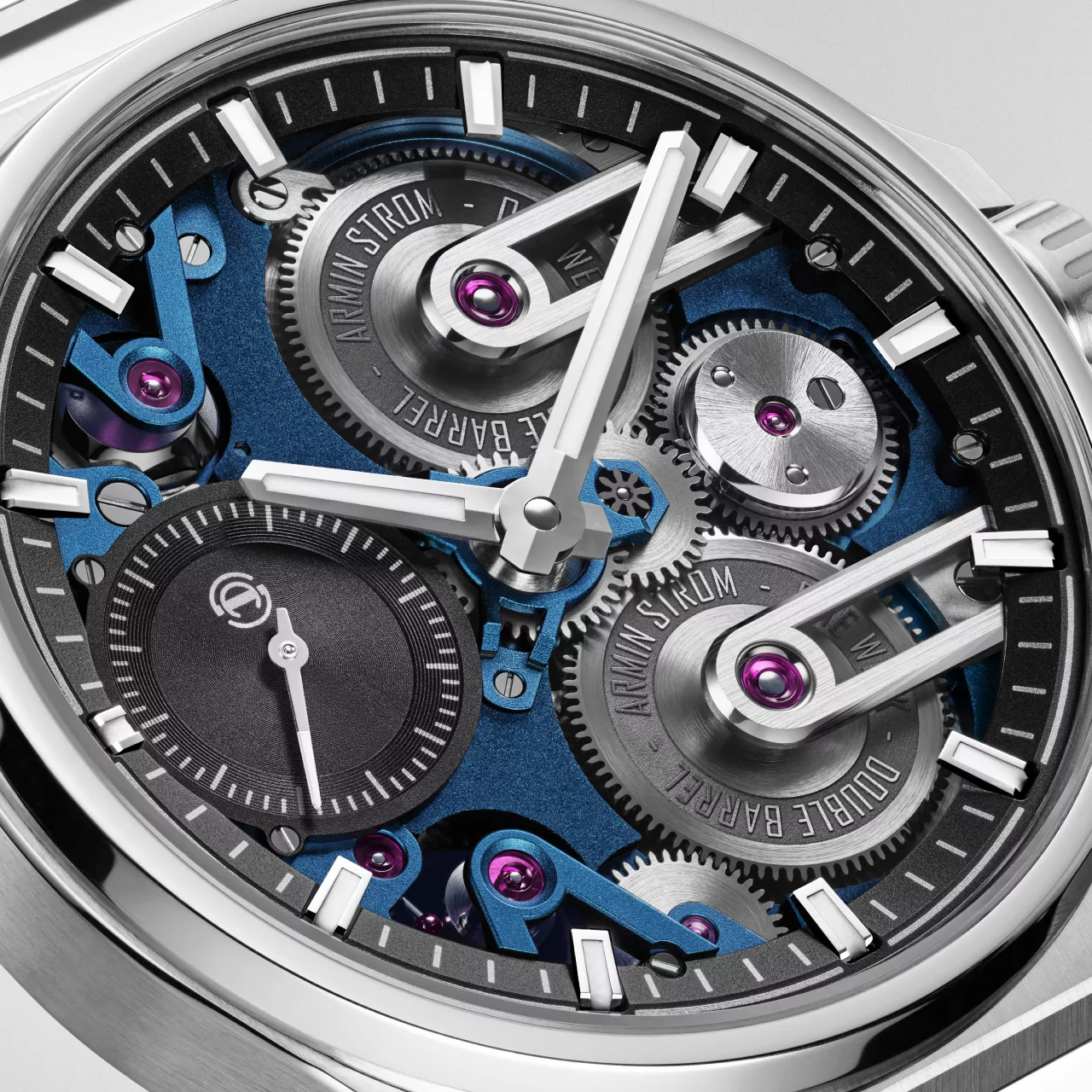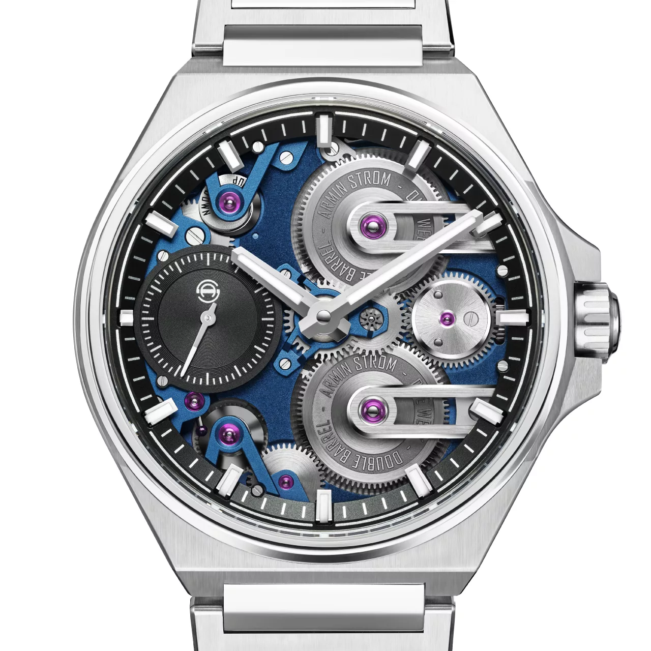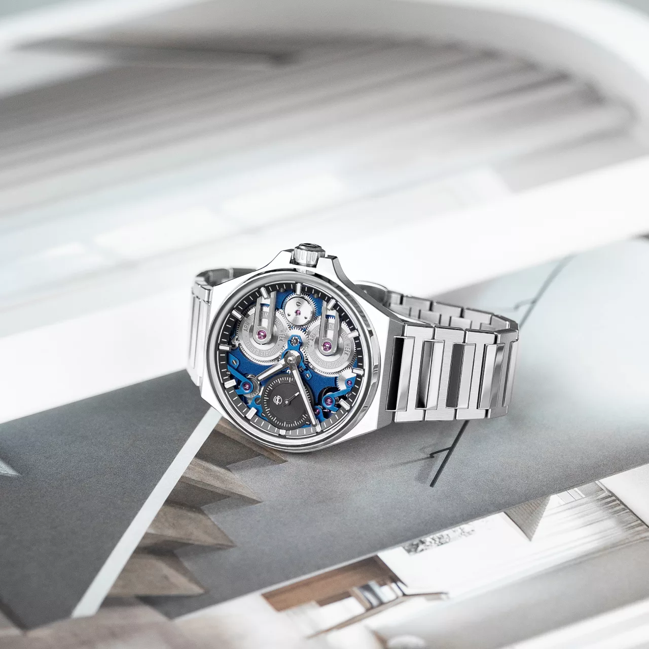 Encased in a 41 mm stainless steel case and fitted with an integrated bracelet, the One Week Manufacture Edition Blue embodies refined ergonomics and a cohesive design language. Contrasts of polished and satin-brushed surfaces highlight its geometry, while the deep hue of the movement provides a captivating play of light and depth. The result is a contemporary expression of traditional watchmaking infused with unmistakable Armin Strom character.