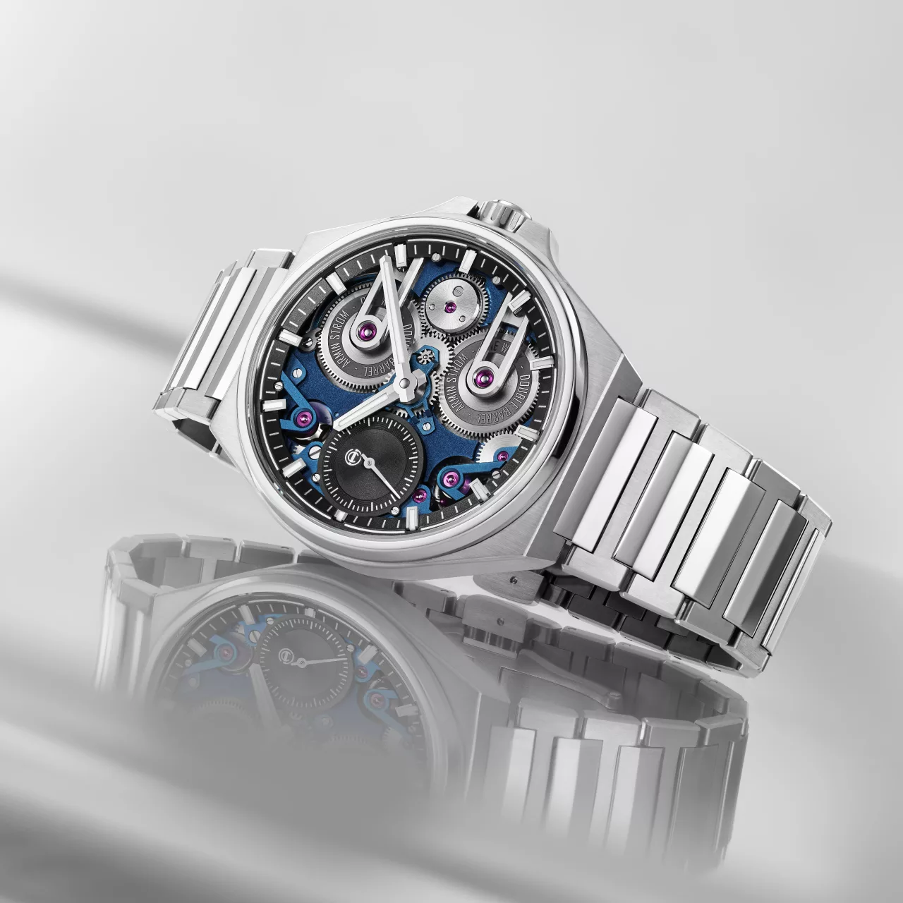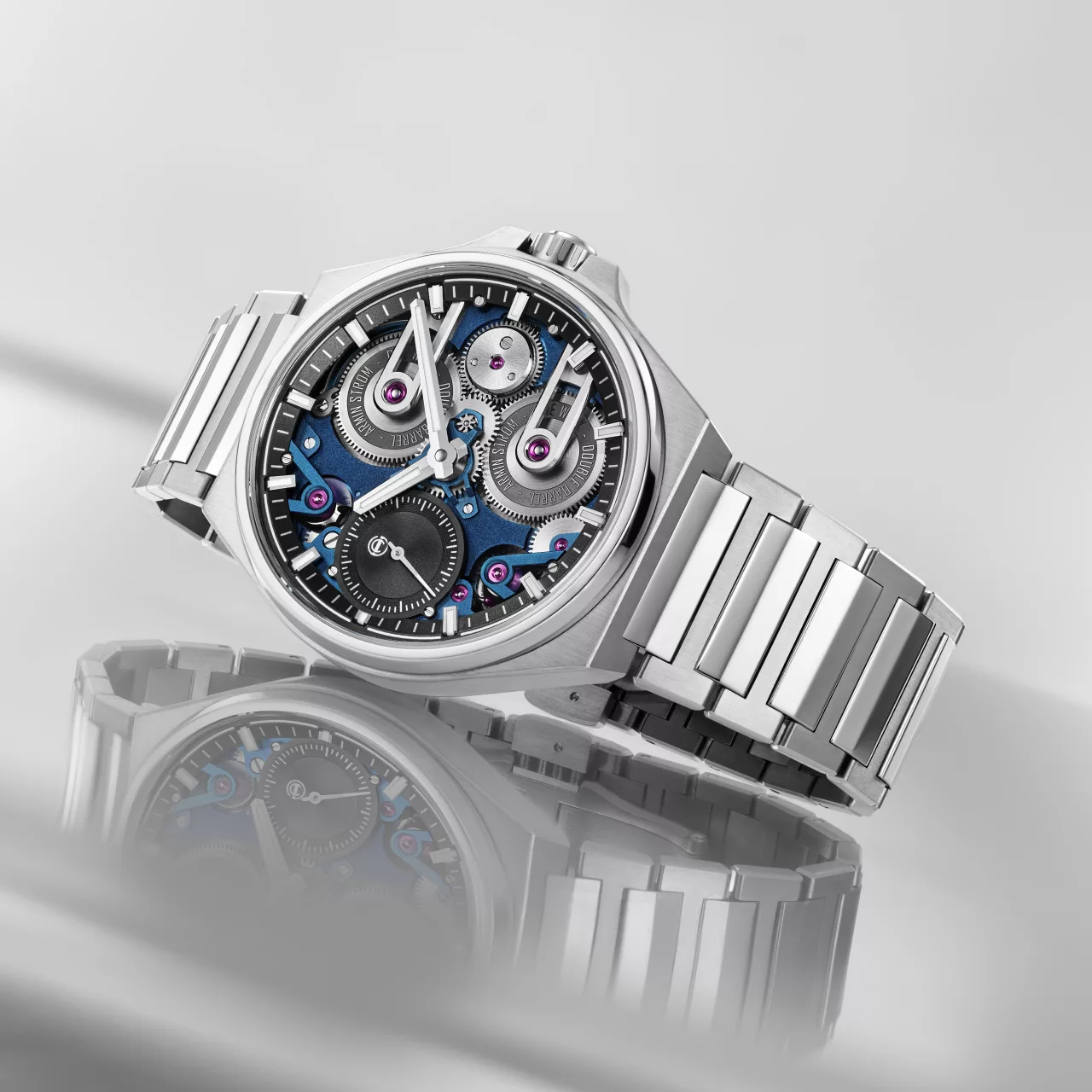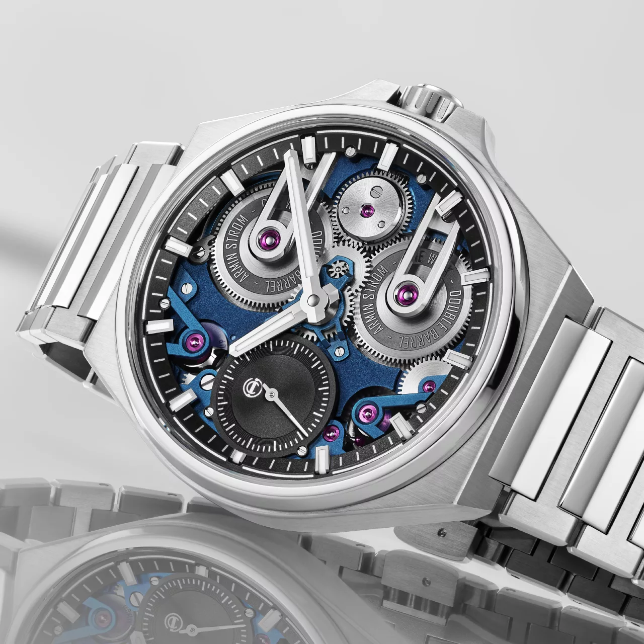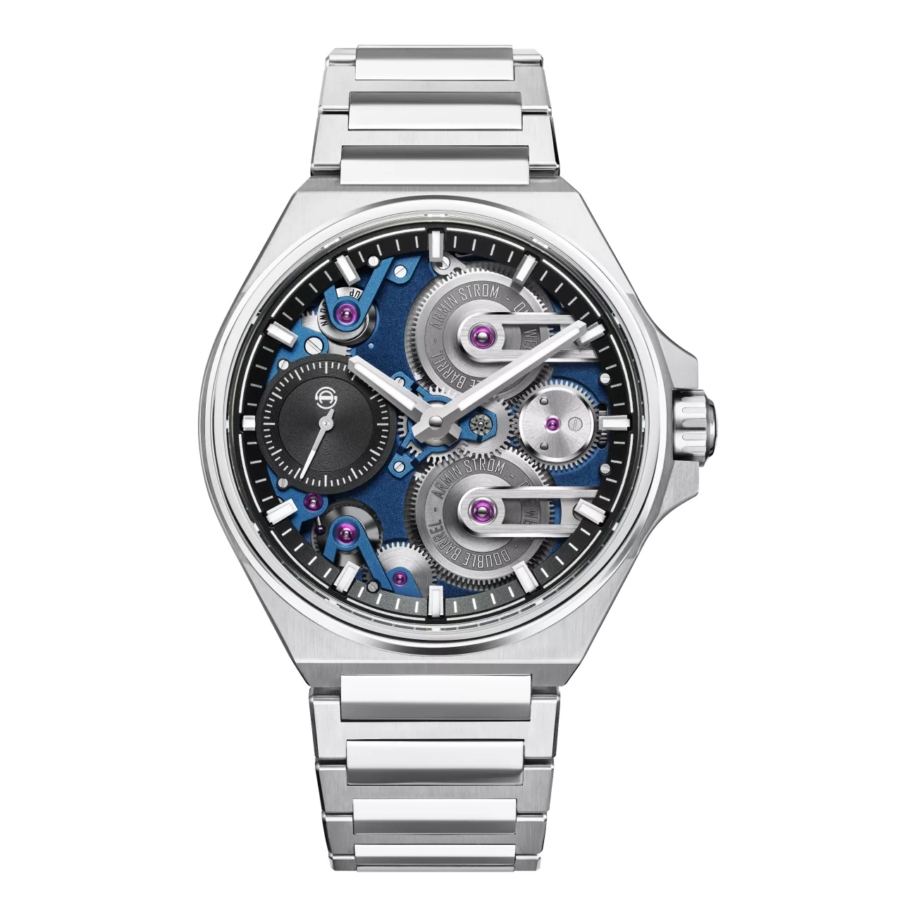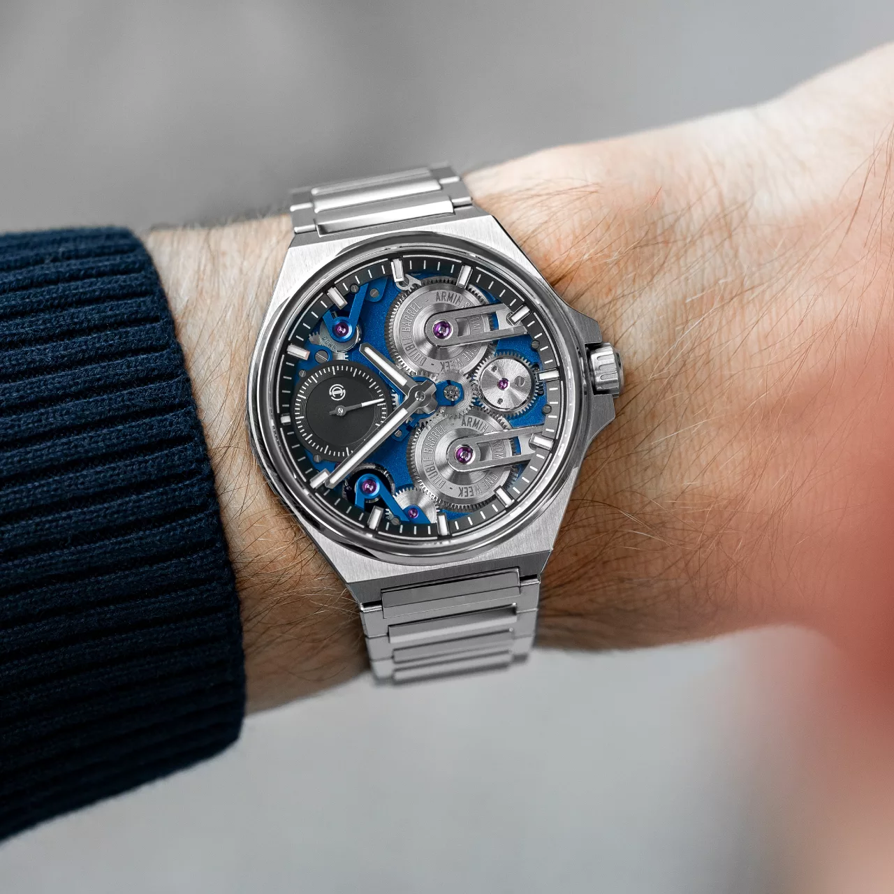 Encased in a 41 mm stainless steel case and fitted with an integrated bracelet, the One Week Manufacture Edition Blue embodies refined ergonomics and a cohesive design language. Contrasts of polished and satin-brushed surfaces highlight its geometry, while the deep hue of the movement provides a captivating play of light and depth. The result is a contemporary expression of traditional watchmaking infused with unmistakable Armin Strom character.