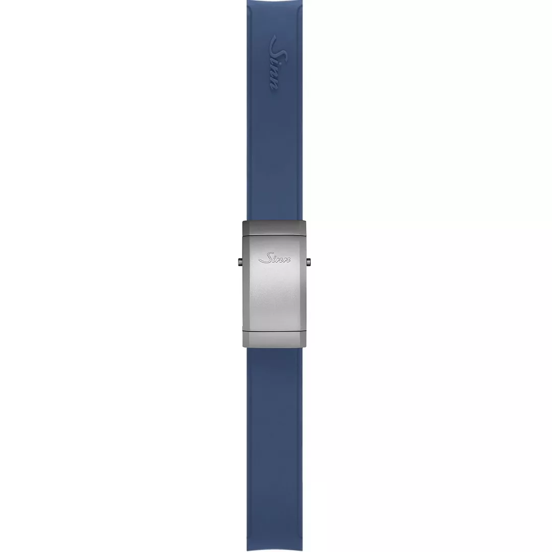 Robust, blue silicone band with integrated lug fixture fitted with steel deployment clasp with built-in diver’s extension offering approx. 10mm range.