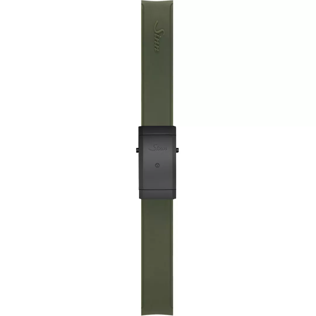 Robust, green silicone band with integrated lug fixture fitted with Sinn’s special Tegimented®, black hard coated steel deployment clasp with in-built diver extension.