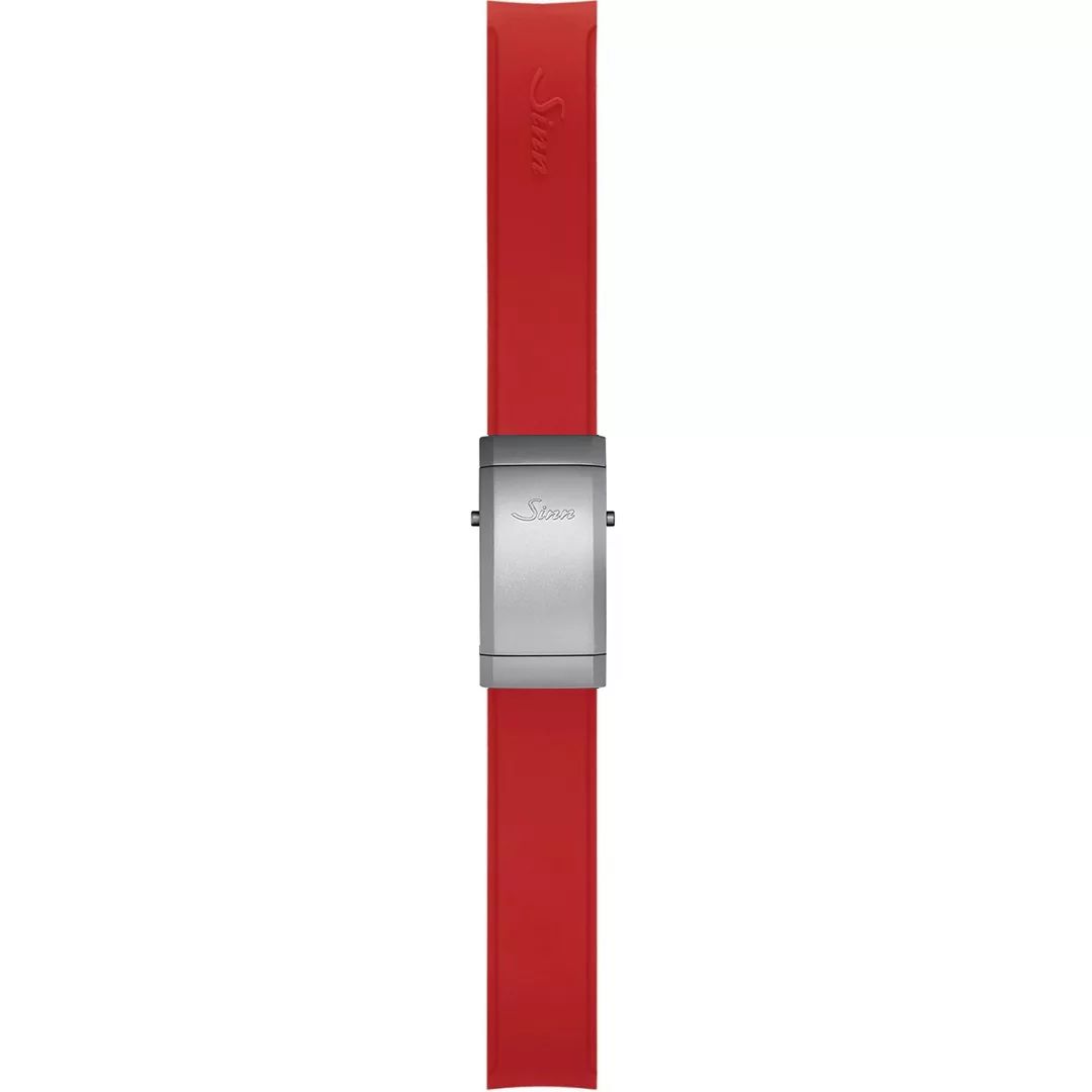 Robust, red silicone band with integrated lug fixture fitted with steel deployment clasp with built-in diver’s extension offering approx. 10mm range.