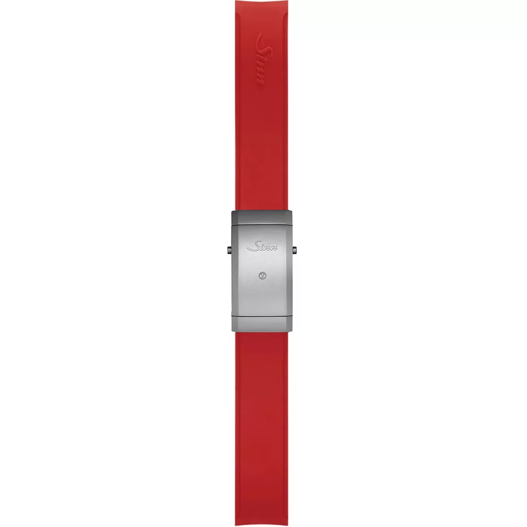 Robust, red silicone band with integrated lug fixture fitted with Sinn’s special tegiment hardened steel deployment clasp with built-in diver’s extension offering approx. 10mm range.