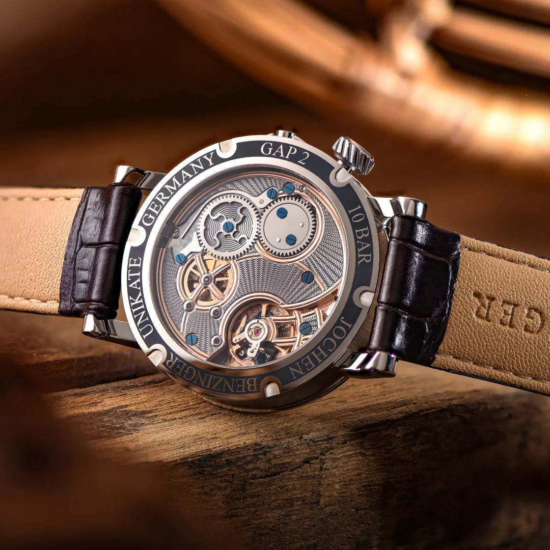 Skeletonising is a refinement method for giving a new, individual character to closed movements. Parts of the movement are removed by a goldsmith’s saw to reveal the direct view into and through the mechanical movement. The view of the movement is made possible by a sapphire crystal, exhibition case back in all models. The imbued creative energy of Jochen Benzinger is brought to the fore in his bespoke skeletonising creations. Each piece is skilfully crafted to highlight the beauty of the mechanical movement beating within – a pleasure to observe and a privilege to wear.