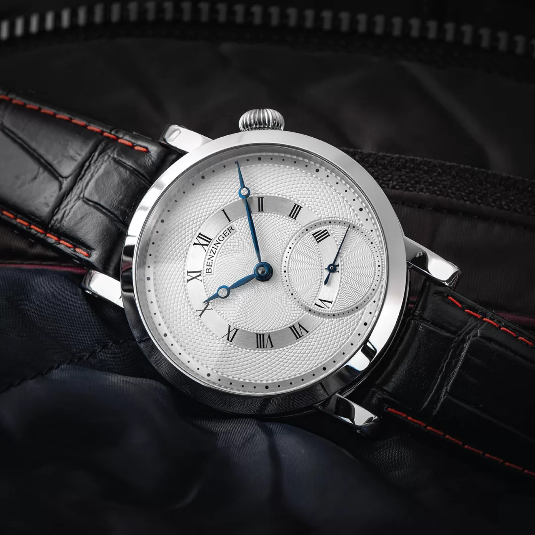 Benzinger’s Pure pieces feature a beautifully guilloched silver dial showcasing one of the most classic motives known as the barley/corn pattern. This elegant, soft pattern is further enhanced with a Breguet frost finish. The enclosed dial features Roman numerals and contrast markers to enhance legibility without compromising the streamlined design. The movement within this piece is completely ennobled, a treat for the wearer while the eye is calmed by the refined, symmetrical pattern of the dial. The overall effect is an exceptionally elegant timepiece whose style will never date.