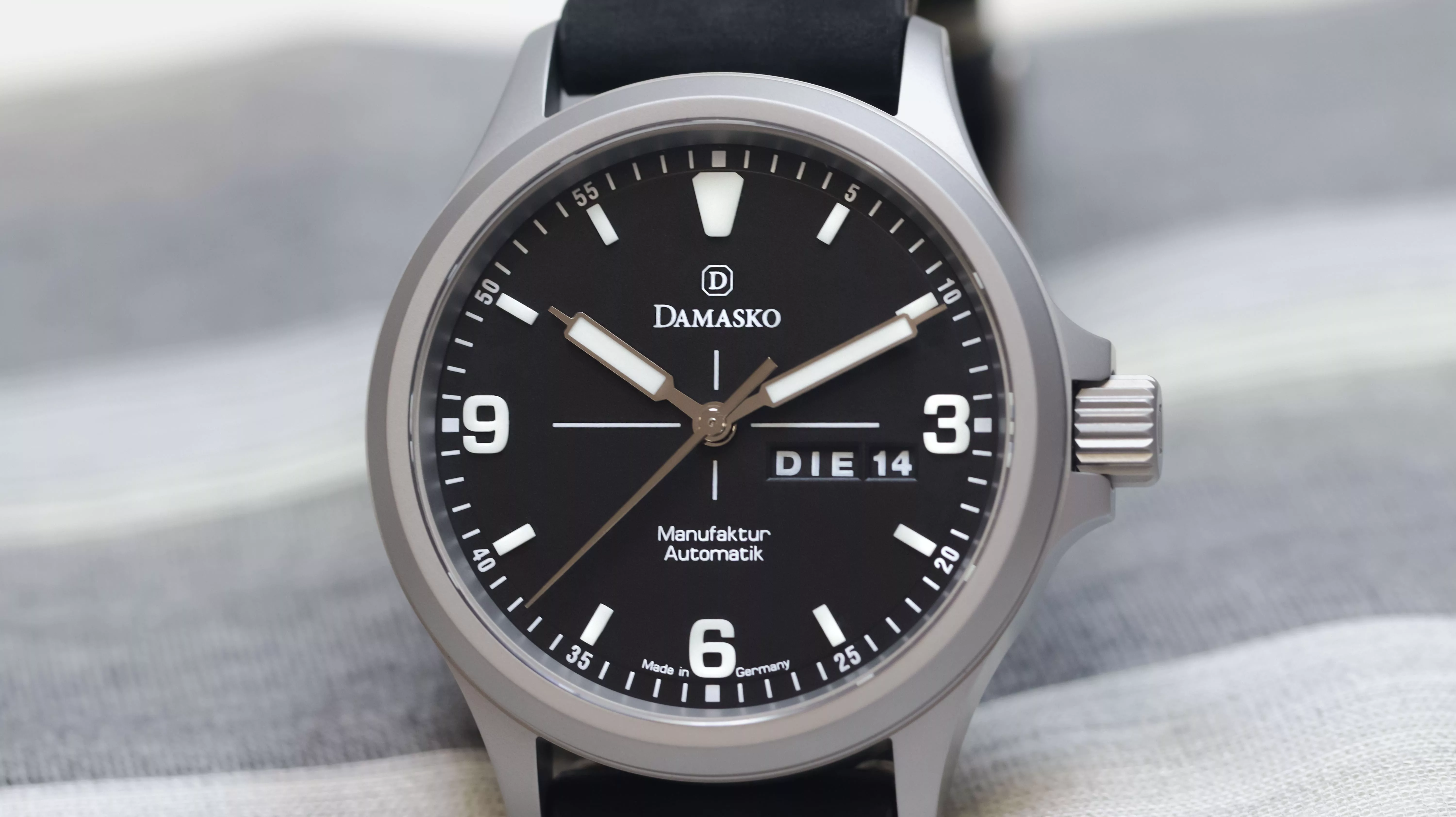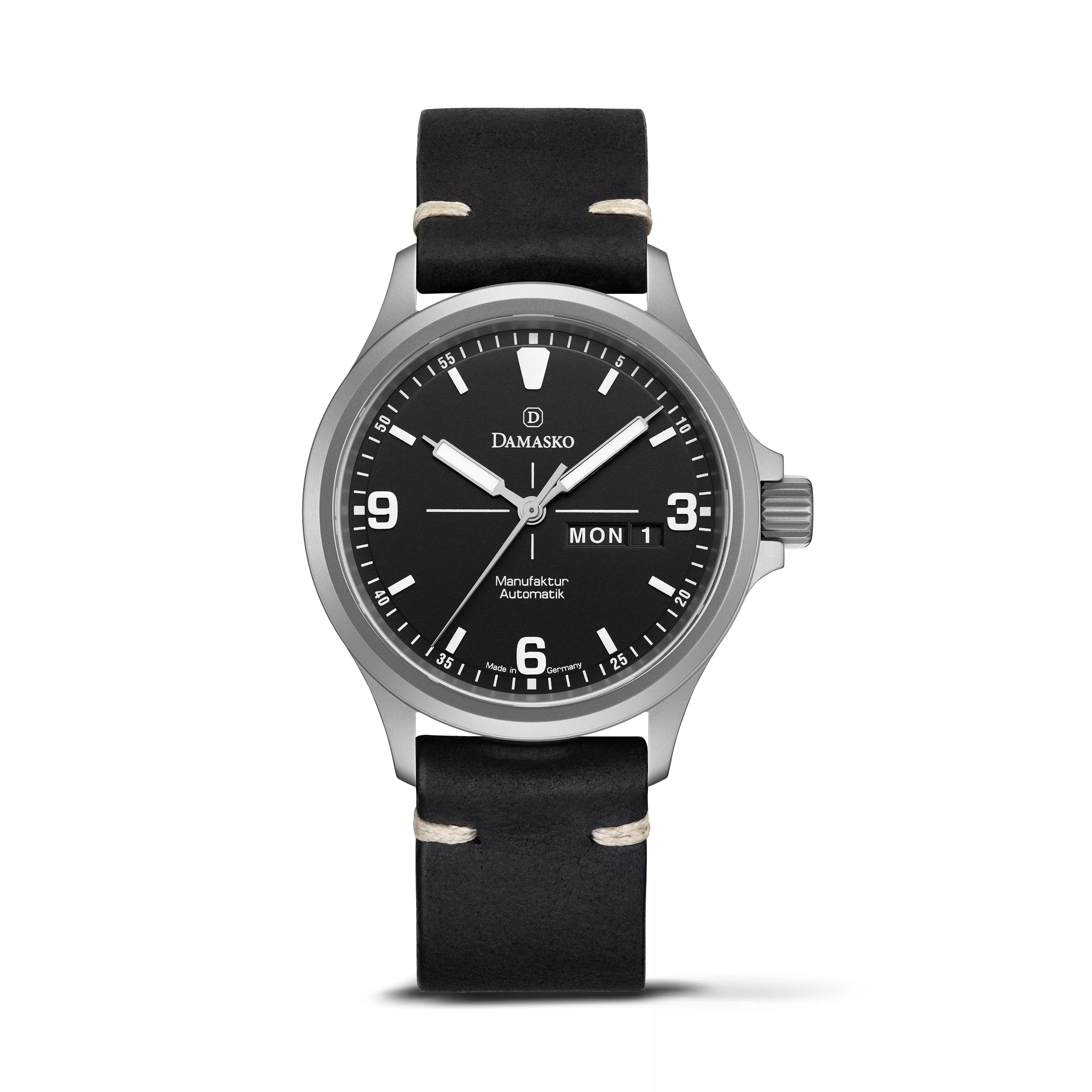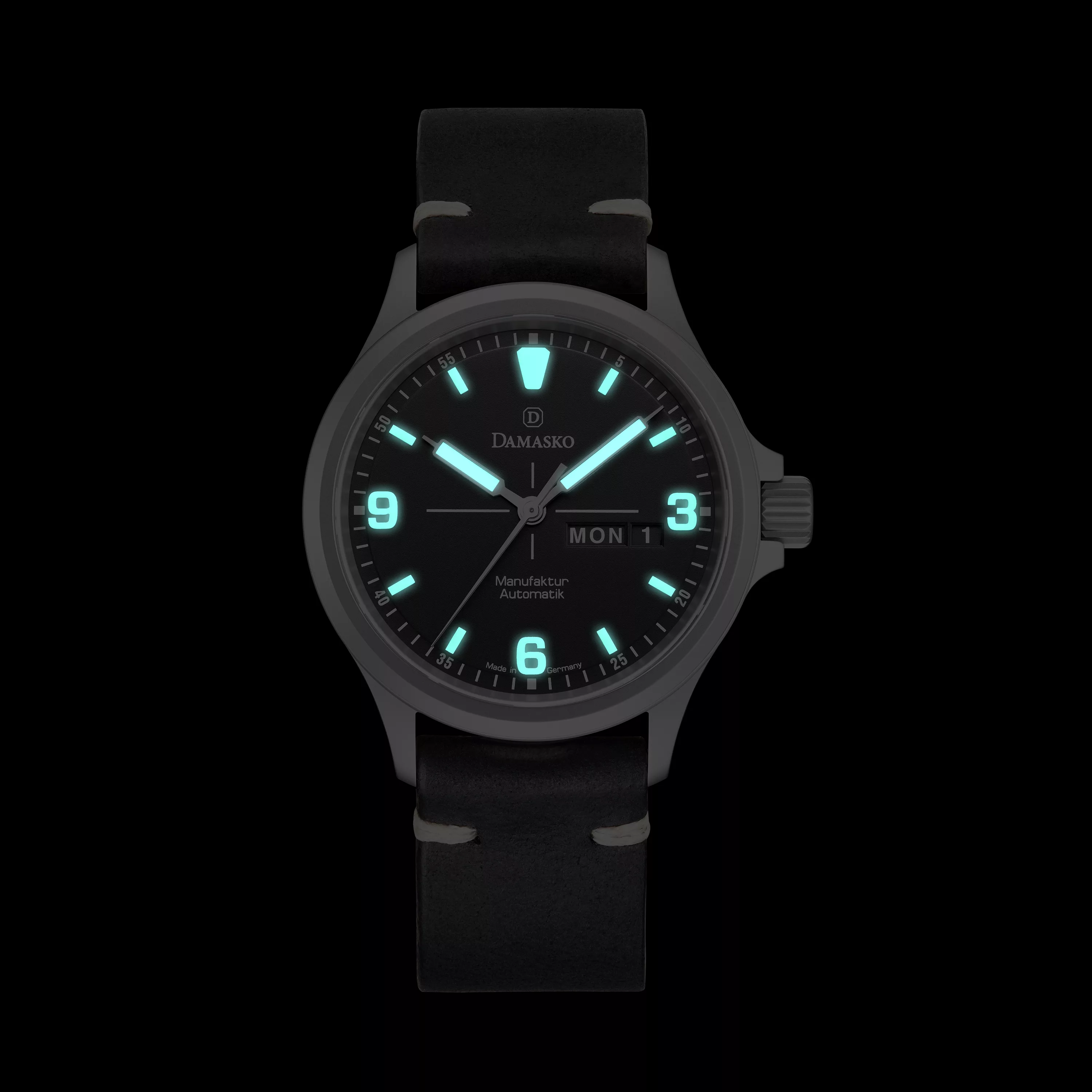 Constructed from Damasko’s patented ice-hardened stainless steel and treated with the ultra-durable black DAMEST coating, the entire case, case back and crown offer superior protection from scratches, corrosion, and impacts. The 40 mm case is bead-blasted for a refined, non-reflective finish, while the curved lugs and drilled holes ensure a snug and easy fit with strap changes.
