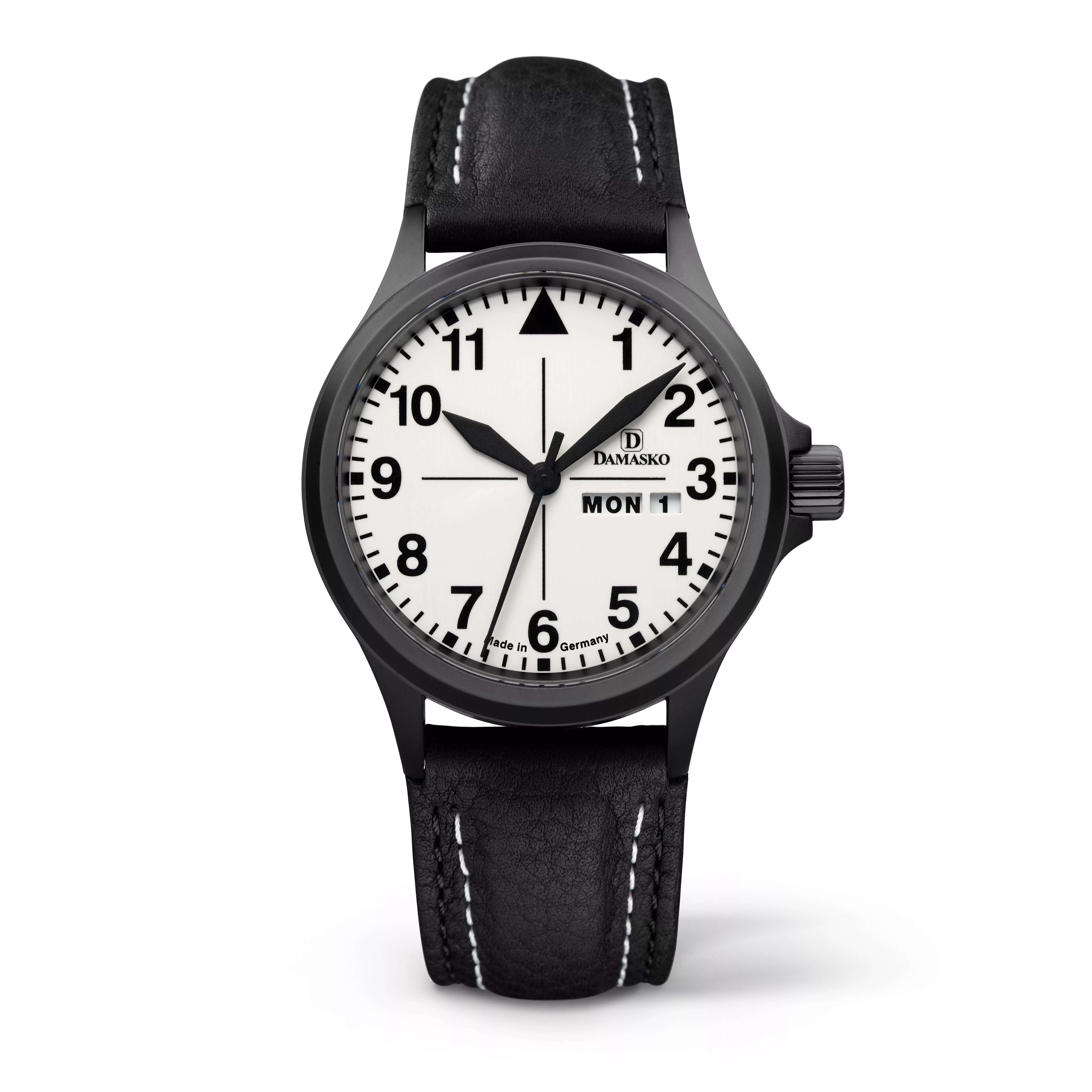 The DK37 Black measures 40 mm across and just 12.3 mm thick, with curved lugs and a lightweight profile (70g without strap) that ensures daily comfort. A double anti-reflective flat sapphire crystal enhances legibility, while Viton gaskets provide robust chemical resistance. The case is pressure-tested to 100 metres and fitted with Damasko’s patented screw-down crown system. Finished with a stitched black leather strap or an optional steel bracelet, the DK37 Black blends bold styling with professional-grade construction.
