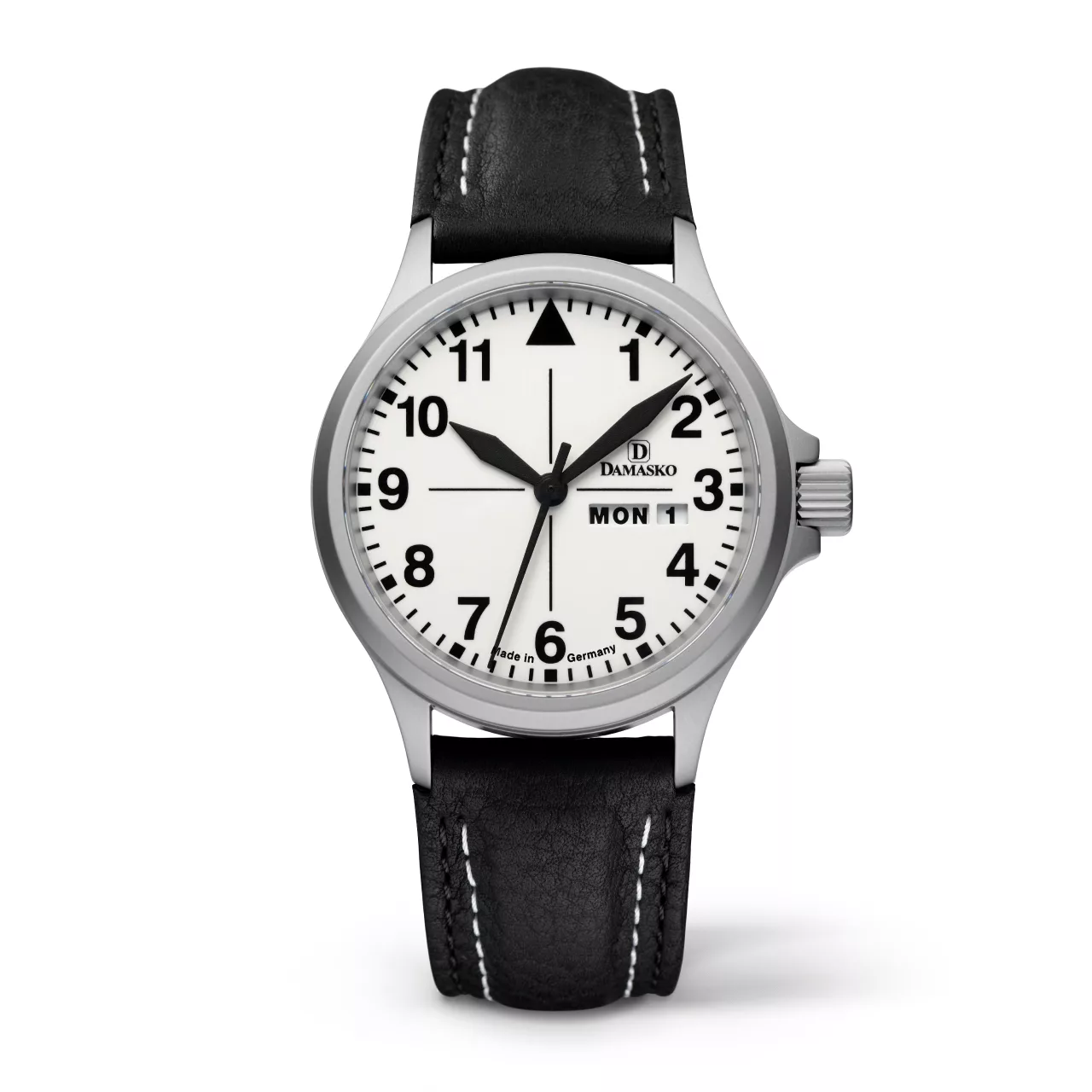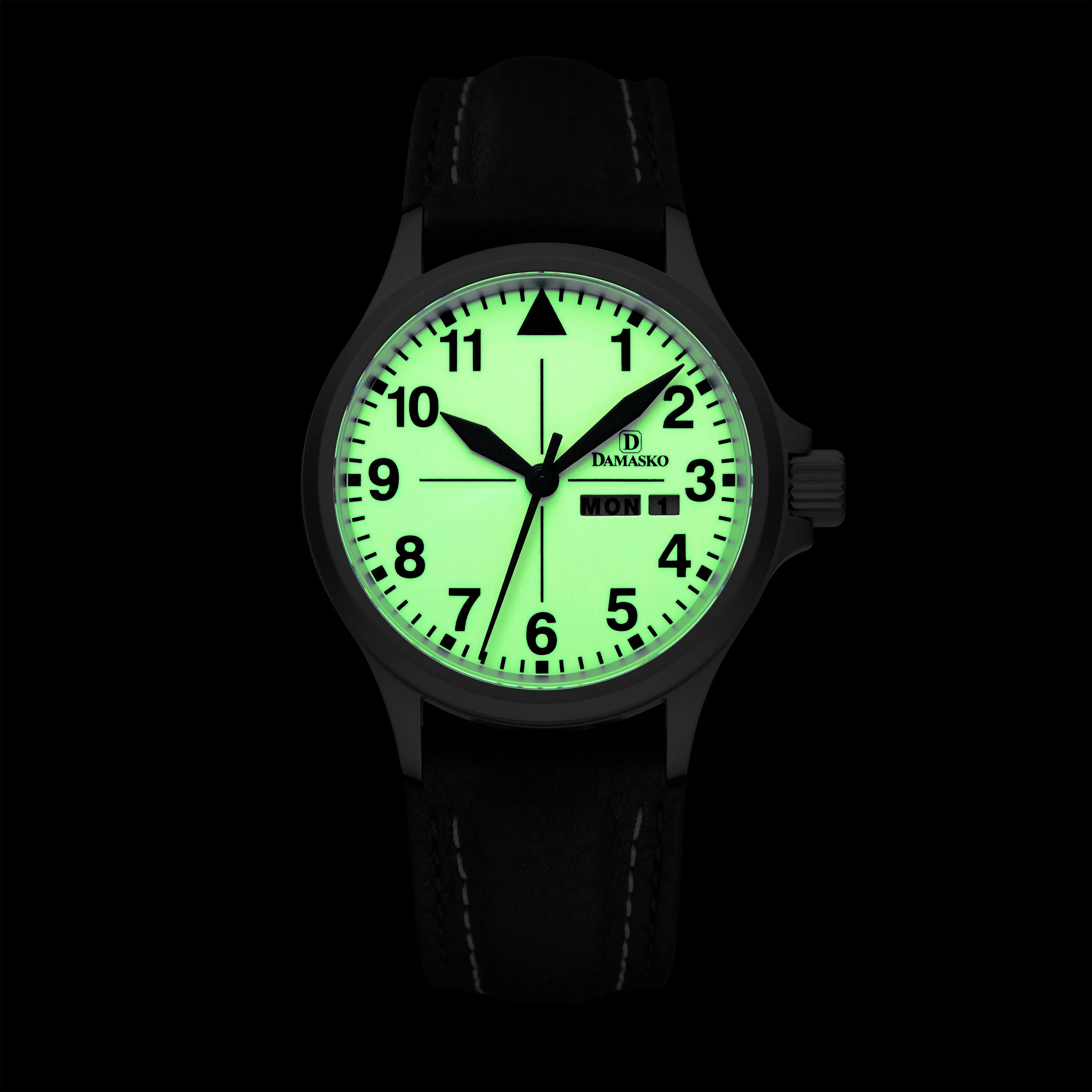 The Damasko DK37 stands out for its fully luminescent white dial, offering a rare combination of maximum readability, functional minimalism, and cutting-edge engineering. Entirely coated with Luminova C1 Grade X1, the dial glows powerfully in low light, while black-painted hour markers, sword hands, and a triangle at 12 o’clock provide high contrast legibility in all conditions. A balanced day-date display at 3 o’clock rounds off the functional yet stylish design.
