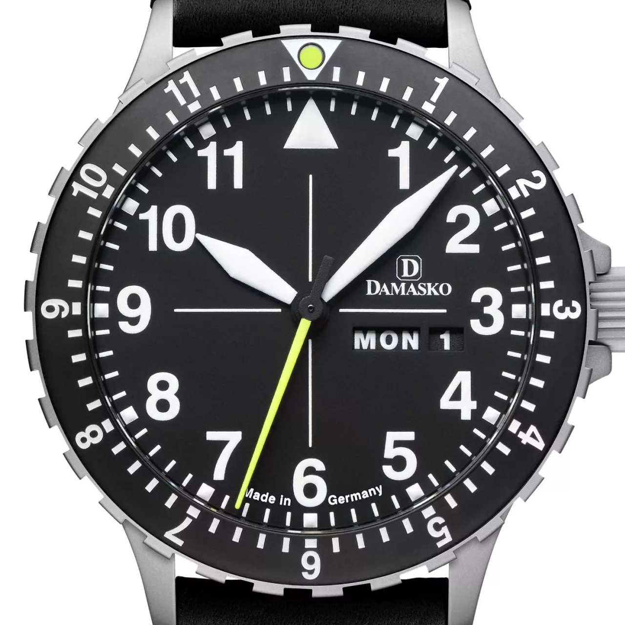 - Dial: Black dial with luminous indices and triangle at 12, yellow second hand, white luminescent-coated black hour and minute hands