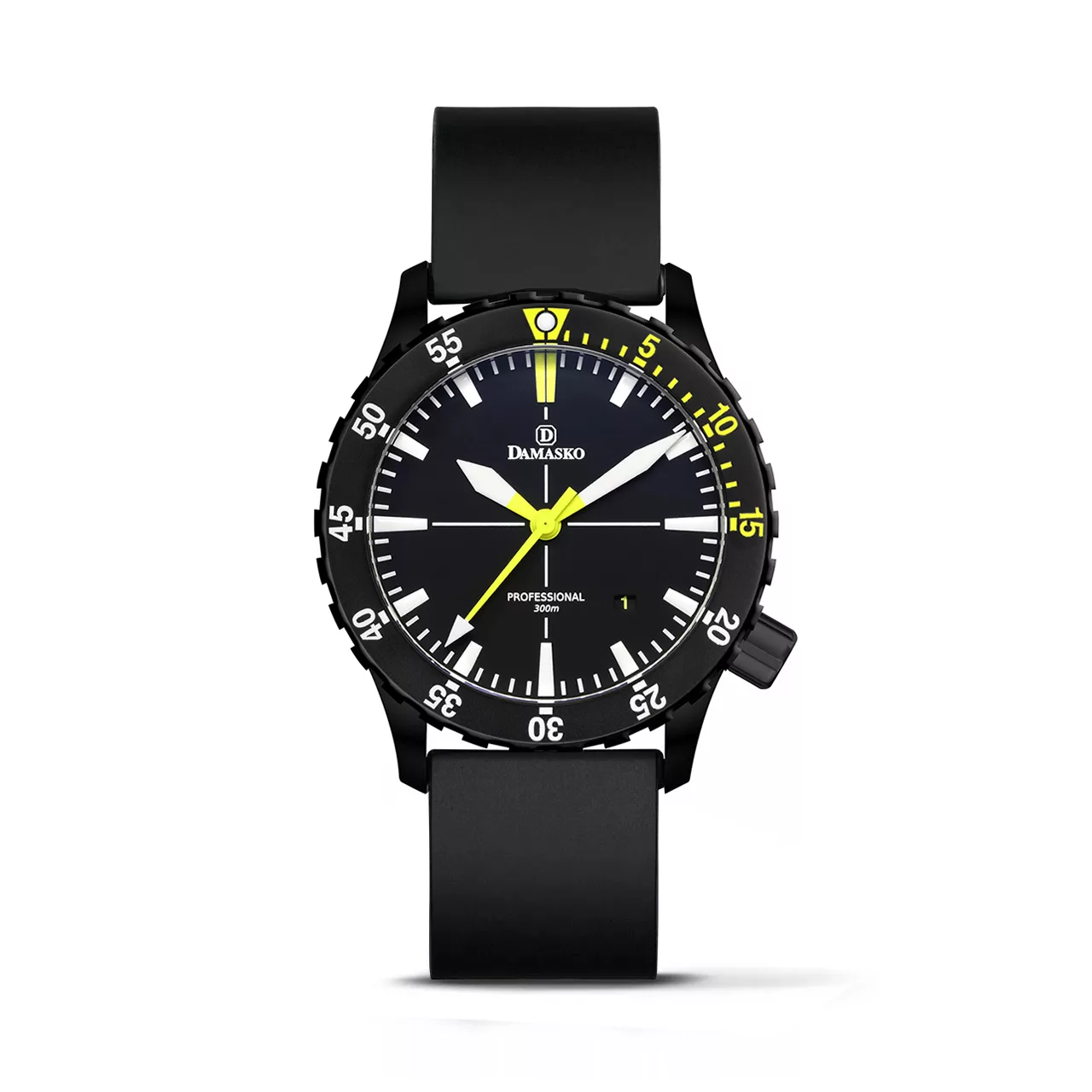 At its core is the DAMASKO A26-2 in-house movement, regulated in three positions for superior accuracy and reliability. This movement provides a 42-hour power reserve and includes a date function at the 4 o’clock position. The double-domed sapphire crystal, with an anti-reflective coating on both sides, ensures clear legibility of the matte black dial, white minute markers, and the vibrant neon-yellow seconds hand. Designed and hand-assembled in Germany, the DSub10 Black stands out for its performance and bold style—backed by cutting-edge watchmaking technology.