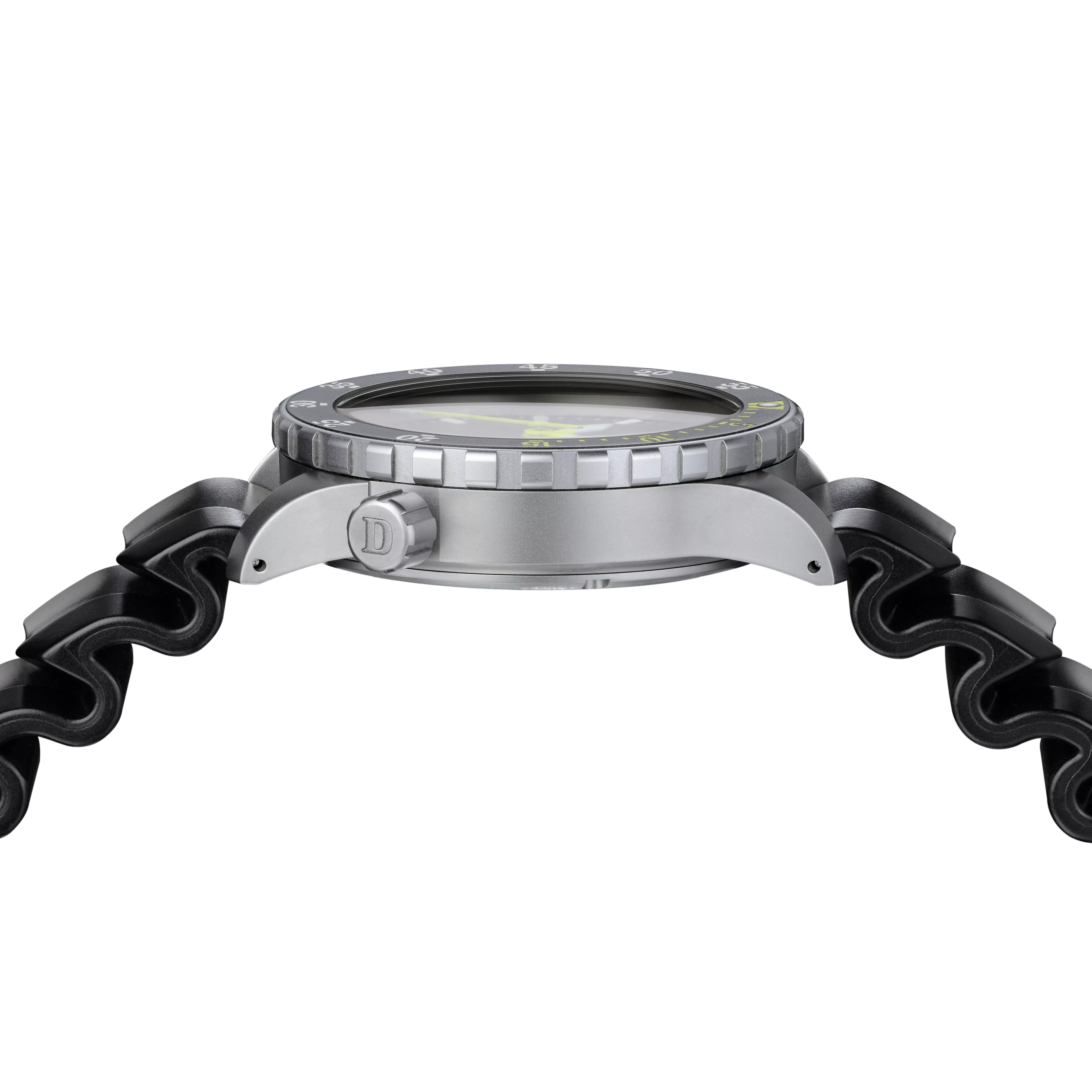 A double-domed sapphire crystal with anti-reflective coating on both sides ensures high readability in all lighting conditions. The matte dial is accented with trapezoid-shaped markers and white indices coated with Luminova C1 Grade X1. The sword-style hands are also treated for strong luminosity, with the second hand painted in high-visibility neon yellow. A date display is placed at 4 o’clock and colour matched for subtle integration.