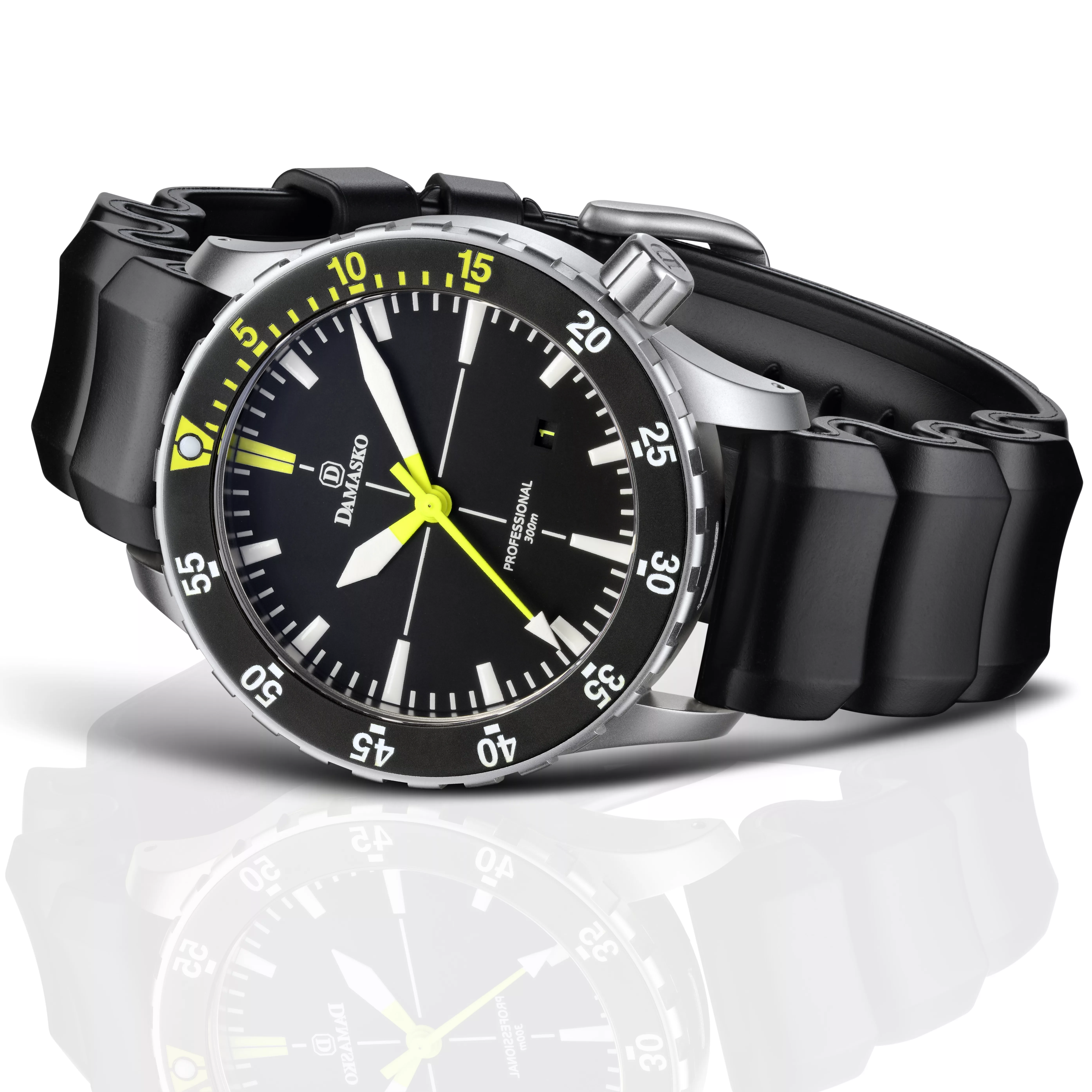 The DSub10 is water resistant to 300 meters and includes drilled lugs, Viton gaskets, and Damasko’s signature triple-sealed crown system. It is offered with a comfortable, high-durability “Wave” black rubber strap with bead-blasted pin buckle.