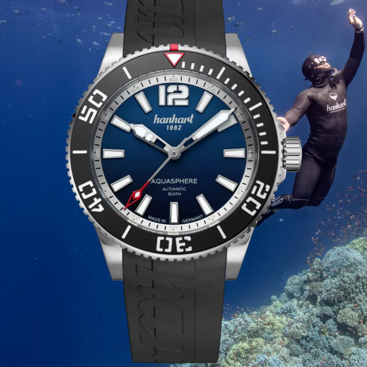 As with all Hanhart watches, the Aquasphere Ocean Fade reflects the brand’s long-standing heritage in tool watchmaking, dating back to 1882. Designed, produced and assembled in Gütenbach in the Black Forest, this watch is built to withstand extremes while offering timeless appeal.