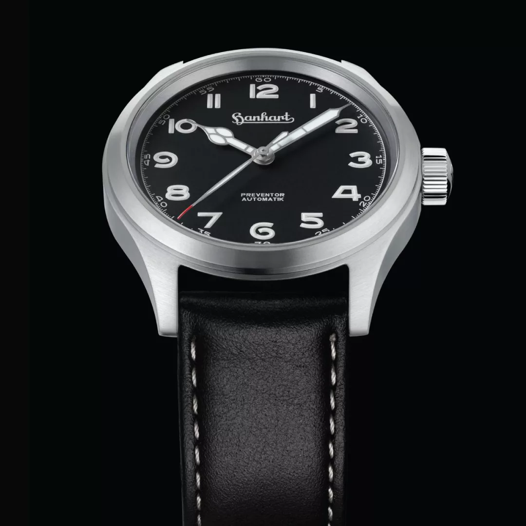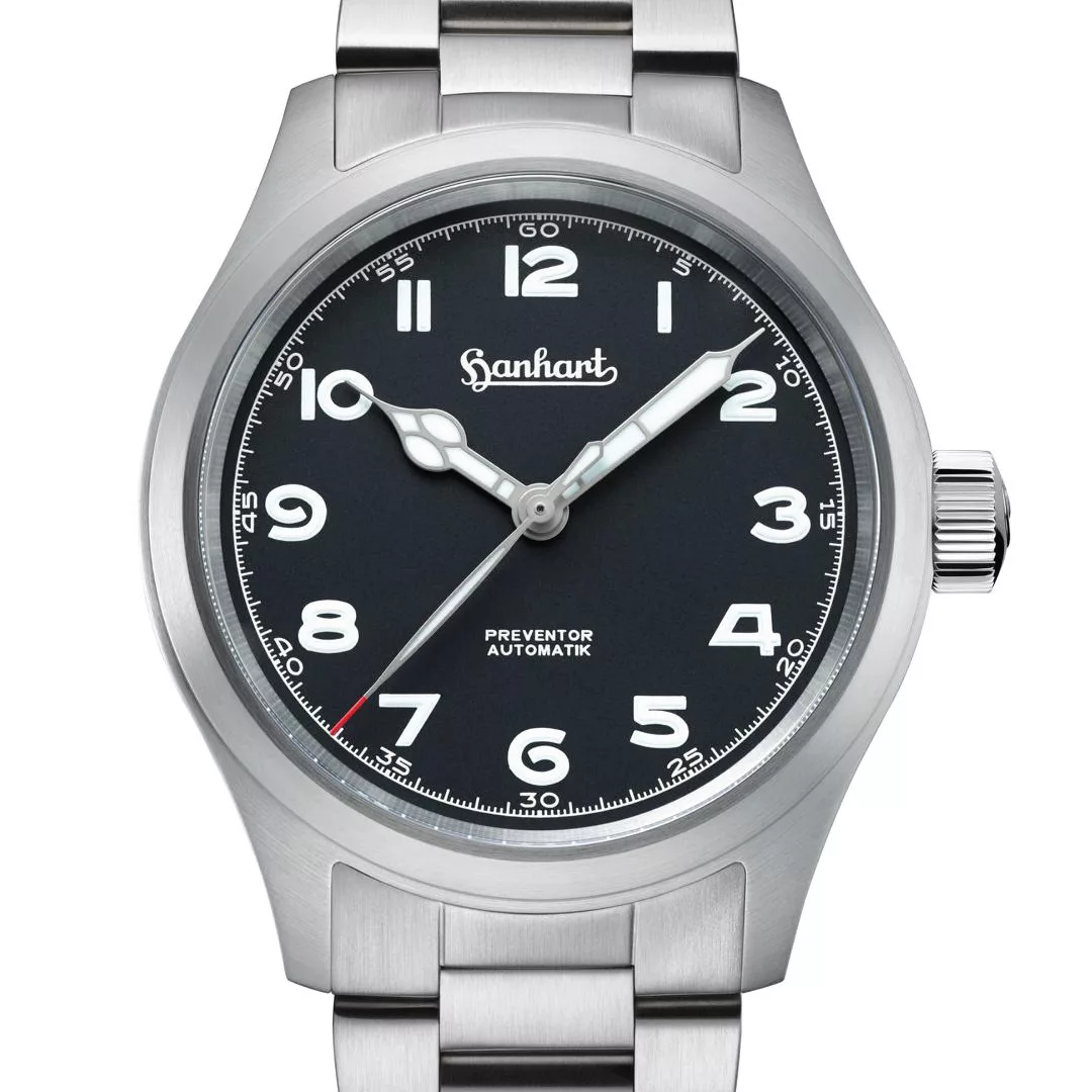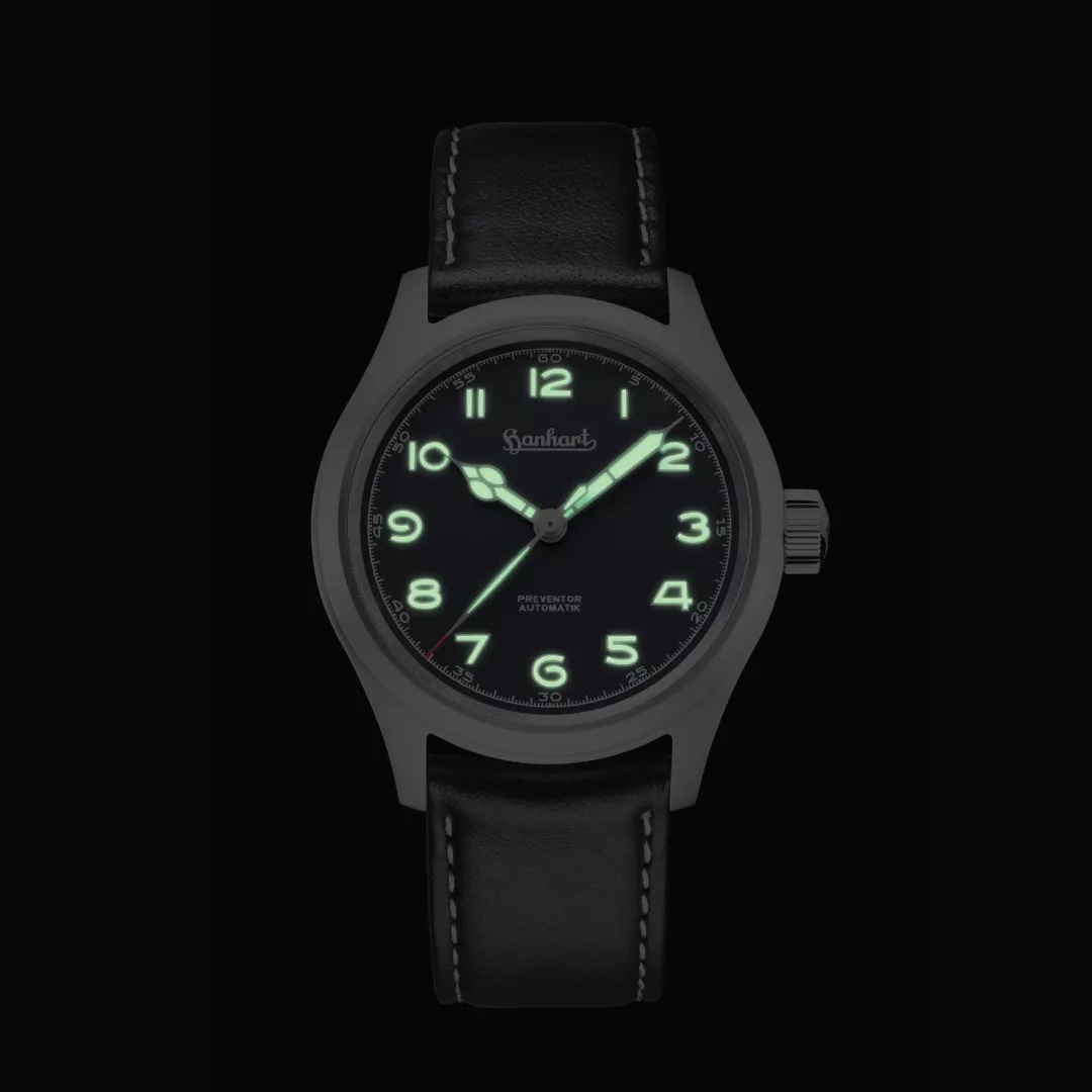 Timeless Hanhart Design: The Preventor HD12 impresses with its clearly designed dial, available in either black or blue. It has three central hands, with the second hand featuring a distinctive red tip that enables precise reading. The minute and second hands are curved at the end to avoid parallax errors. Both the numerals and hands are coated with SuperLuminova® C1, which enhances luminosity and ensures optimum legibility at all times. The dial also bears the historic Hanhart logo to emphasise the brand’s heritage in timekeeping.