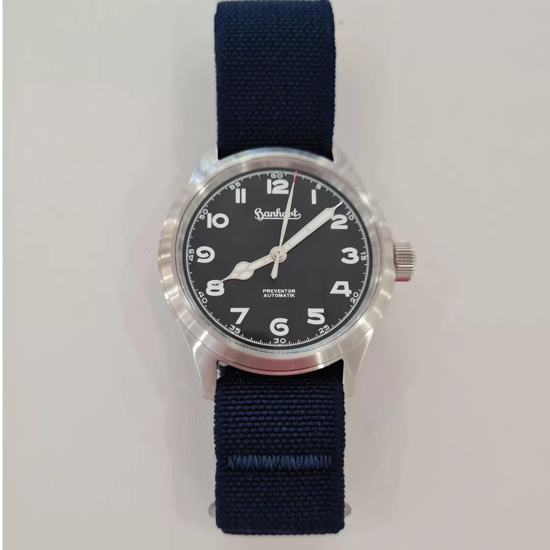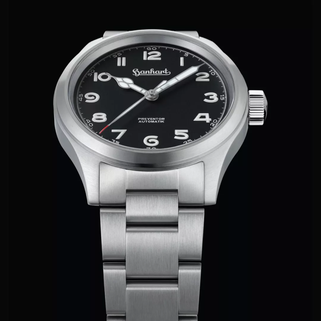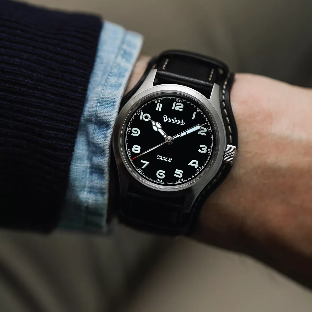 Timeless Hanhart Design: The Preventor HD12 impresses with its clearly designed dial, available in either black or blue. It has three central hands, with the second hand featuring a distinctive red tip that enables precise reading. The minute and second hands are curved at the end to avoid parallax errors. Both the numerals and hands are coated with SuperLuminova® C1, which enhances luminosity and ensures optimum legibility at all times. The dial also bears the historic Hanhart logo to emphasise the brand’s heritage in timekeeping.