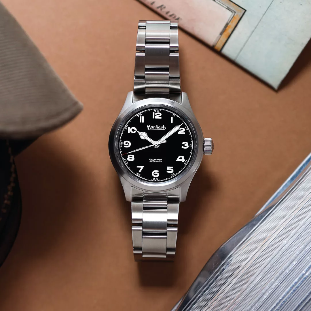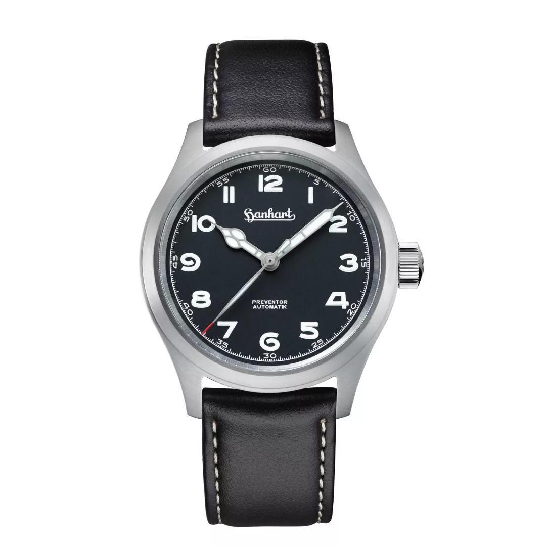 The Preventor HD12 presents a 3-hand model with central seconds in a compact case diameter of 39 mm. With water resistance of 15 ATM (150 m) and a screw-down crown, the Preventor HD12 watch is the perfect everyday companion.