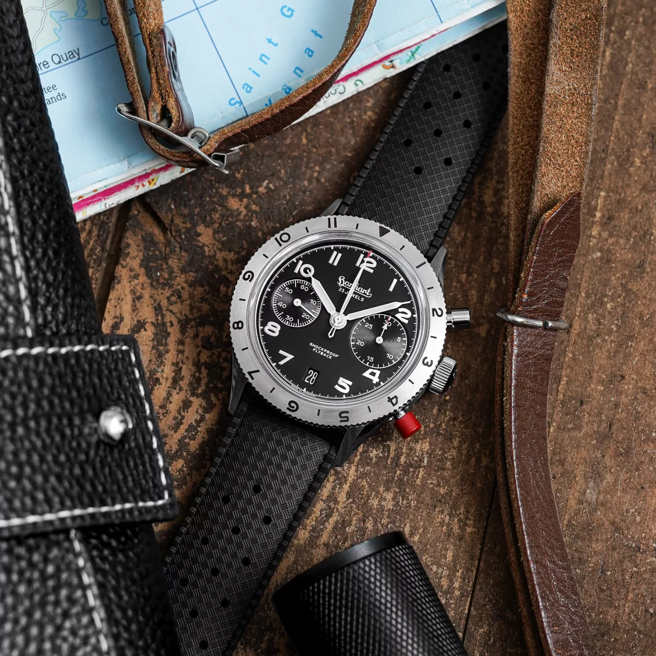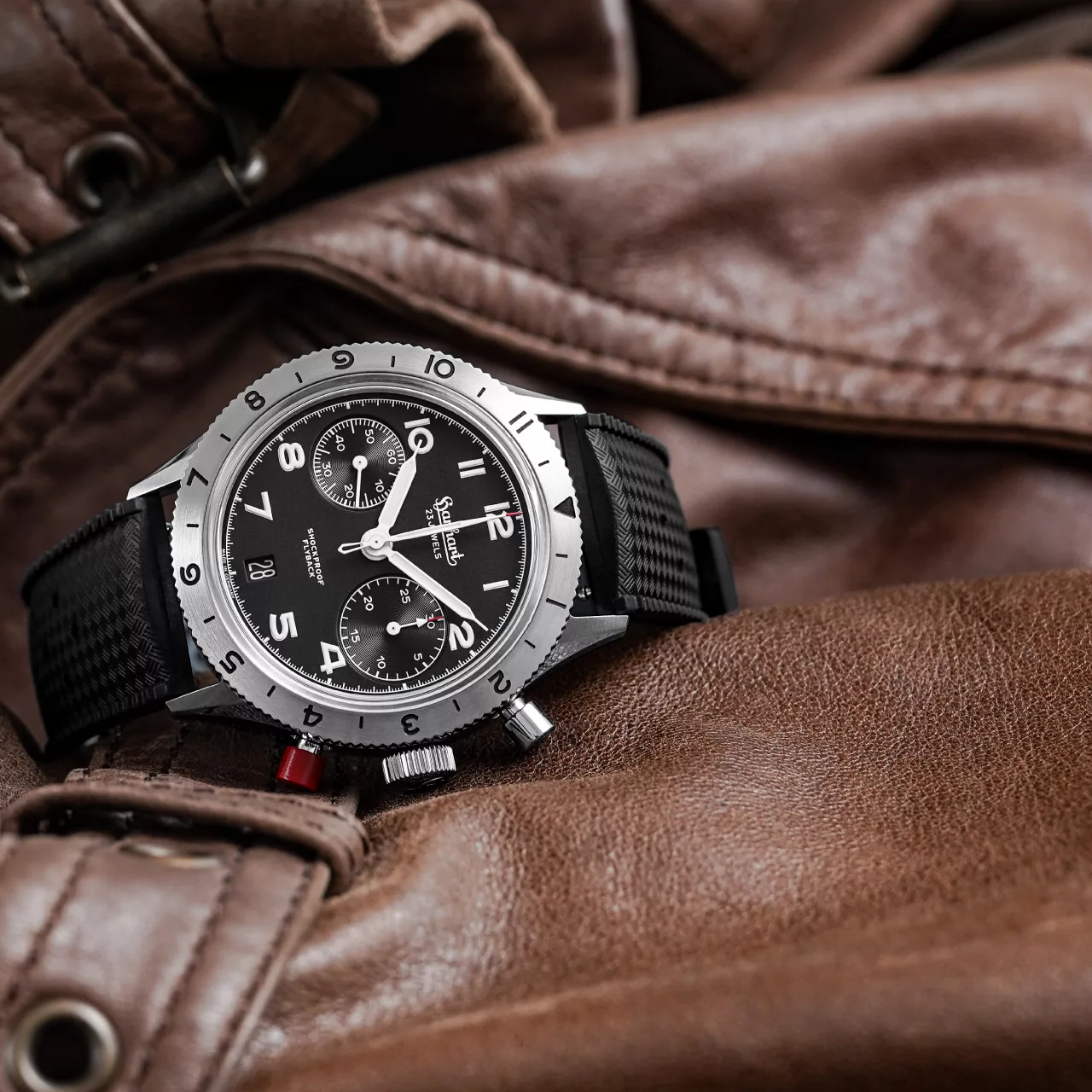 A number of distinctive design details give the Red Lion Mk II its own identity. Chief among them is the red HyCeram pusher, a feature with strong ties to Hanhart’s heritage. Practical in purpose yet meaningful in history, it reflects the brand’s long standing role in aviation timing instruments. HyCeram combines ceramic hard wearing qualities with the resilience of a polymer matrix, offering durability and vivid colour stability.