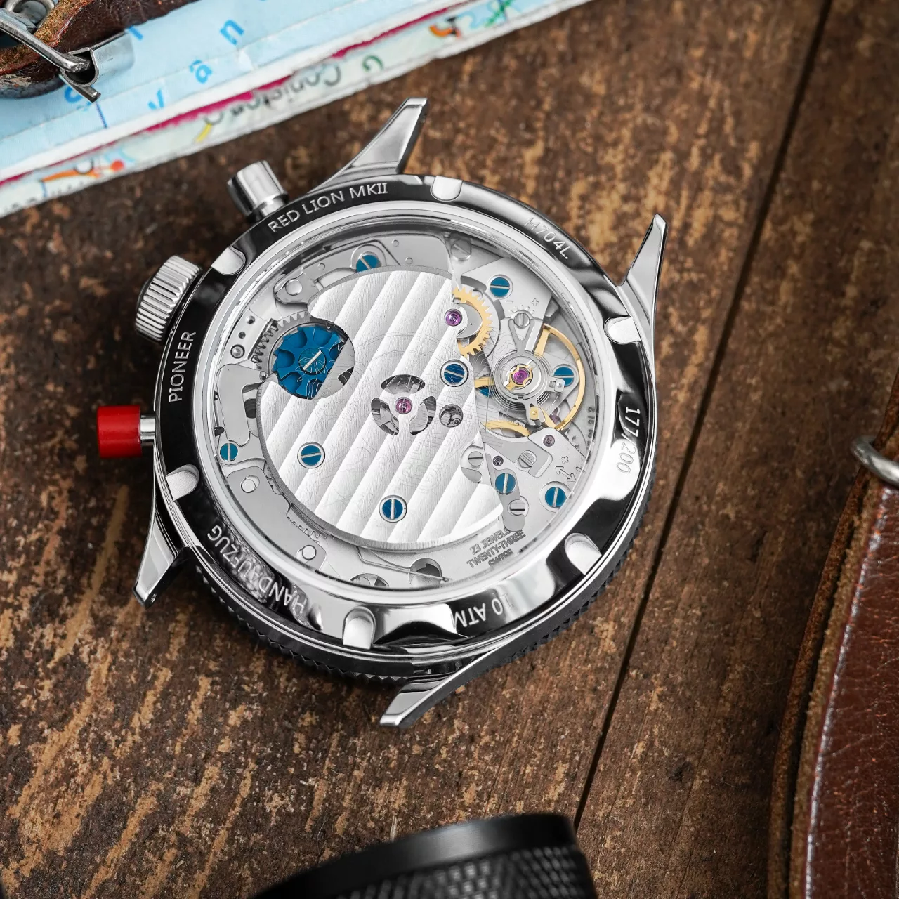 Measuring 39 mm in diameter with a height of 13.6 mm and a 46 mm lug to lug, the stainless steel case offers balanced proportions suitable for daily wear. The surfaces move between satin and polished finishing, creating a tool driven profile with refined detailing. A bidirectional 12 hour bezel with 24 precise clicks offers intuitive GMT light capability. By rotating the bezel to match the time difference, a second time zone can be tracked at a glance without the need for an additional hand. This functionality, executed with practicality in mind, makes the Red Lion Mk II an ideal companion for pilots, travellers and those navigating between locations.