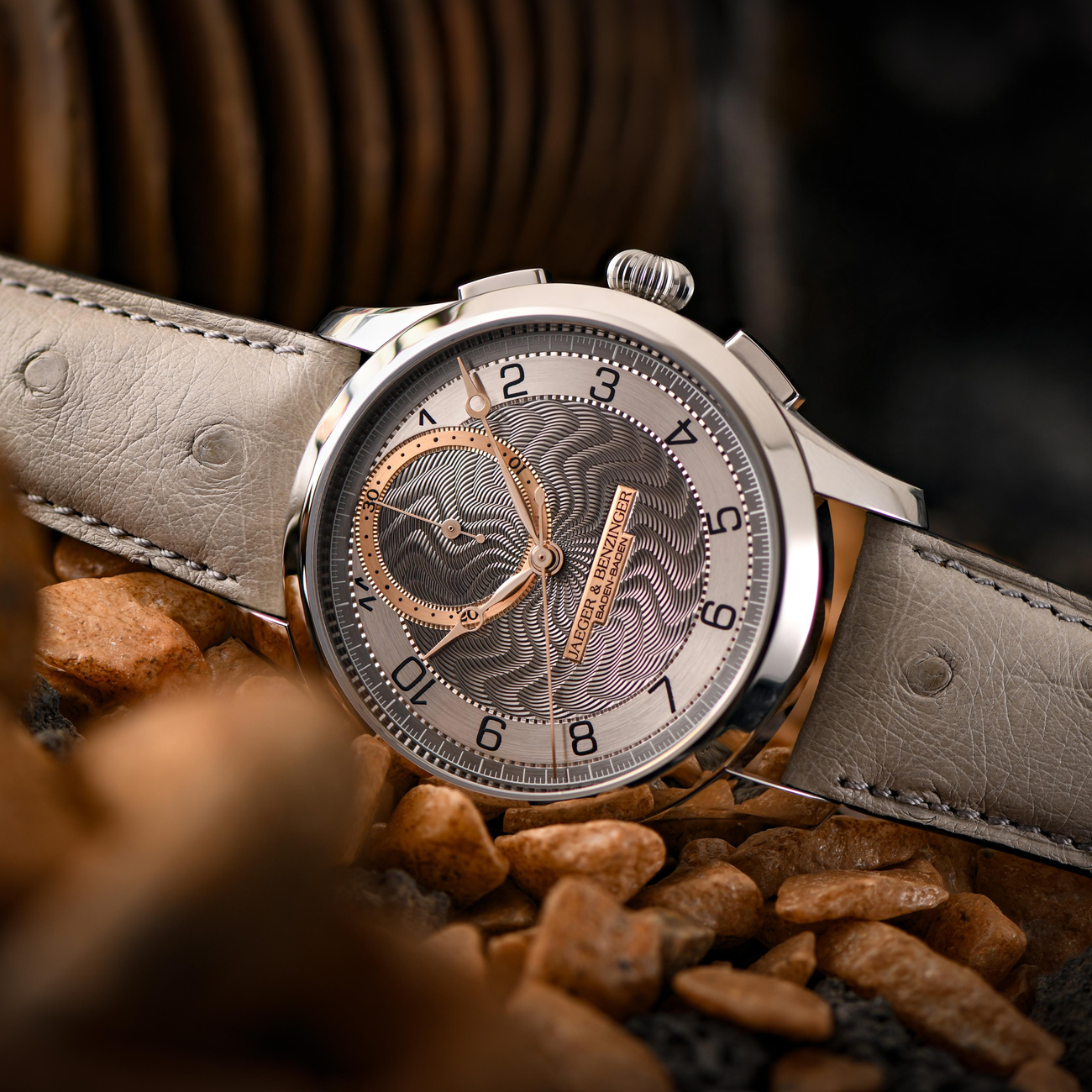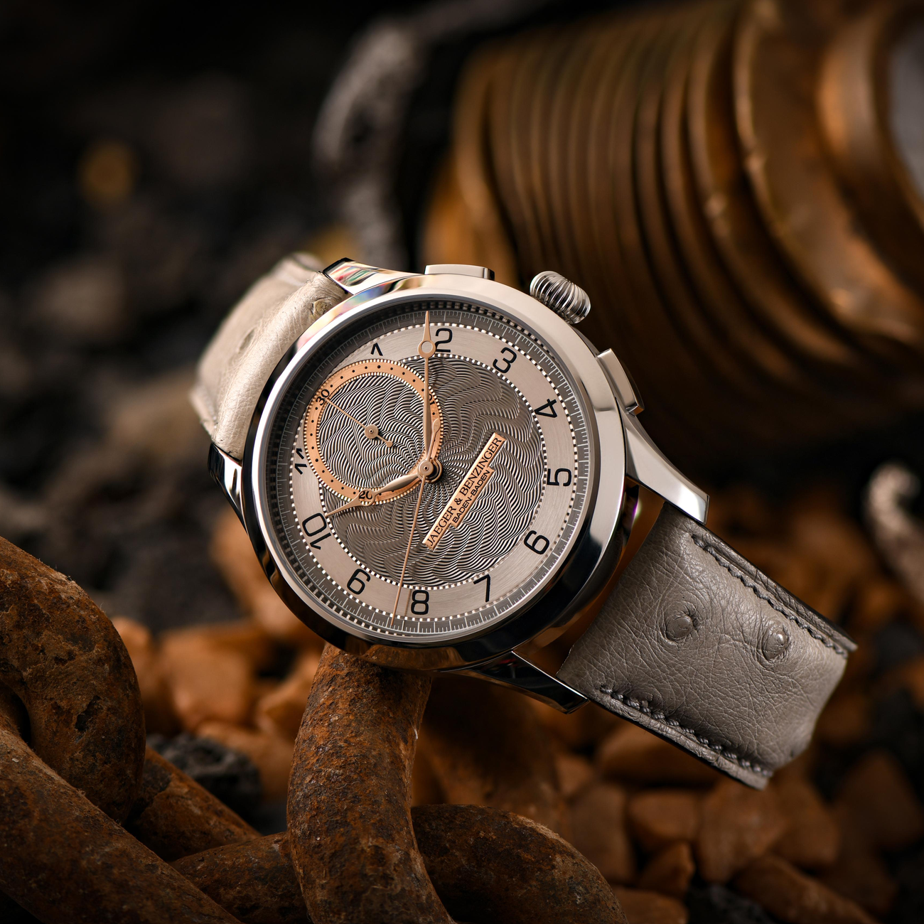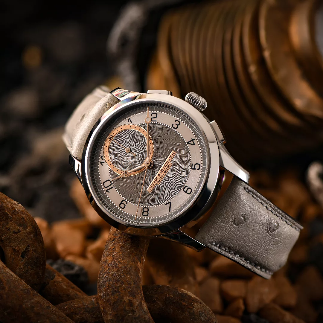 Chronograph functionality is presented in a minimalist configuration, featuring central chronograph seconds and a 30-minute register positioned at 12 o’clock. This layout preserves balance and legibility while maintaining the visual purity that defines Jaeger & Benzinger watches. The chronograph pushers are discreetly integrated into the case, offering smooth operation without compromising the watch’s classical profile.