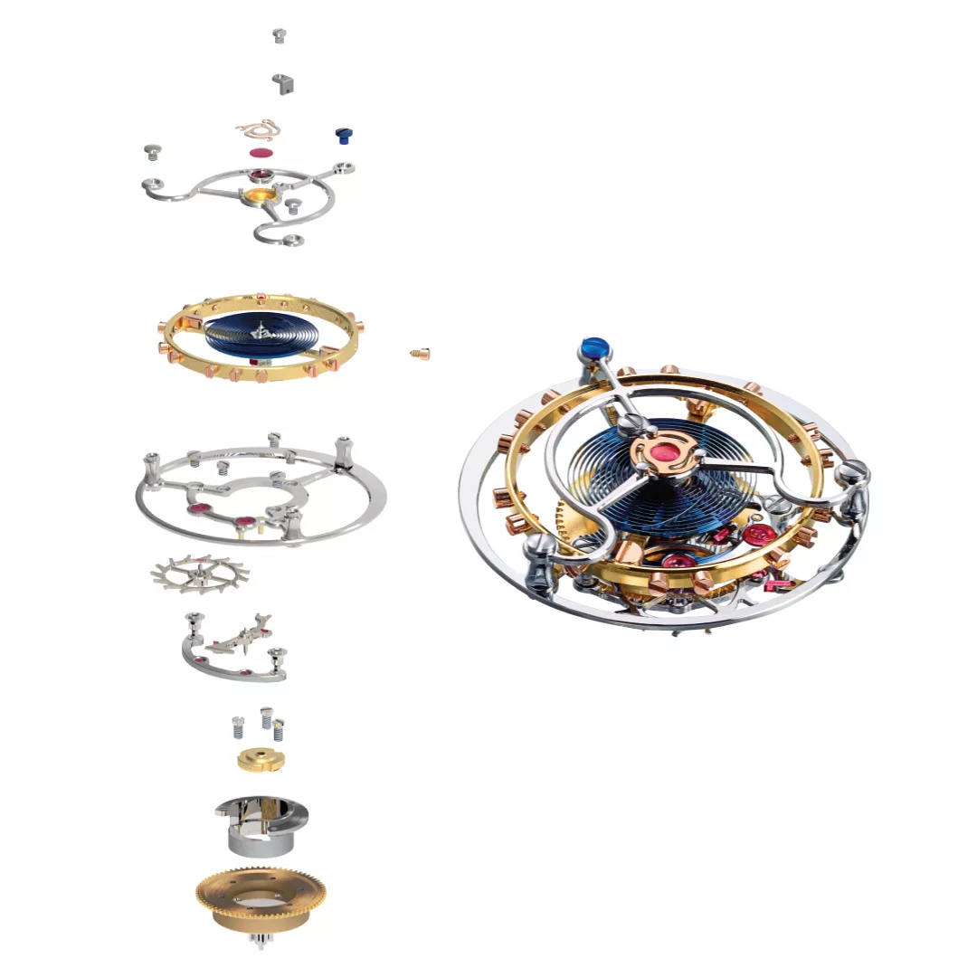 Flying minute tourbillon: single-sided carriage, delicate cage, three-arm gold shock absorber spring, fixed seconds wheel, two chaton-set brilliant-cut diamonds frame the inscription.