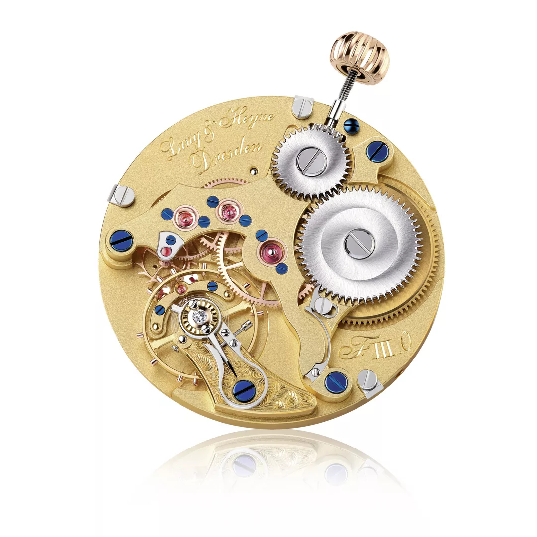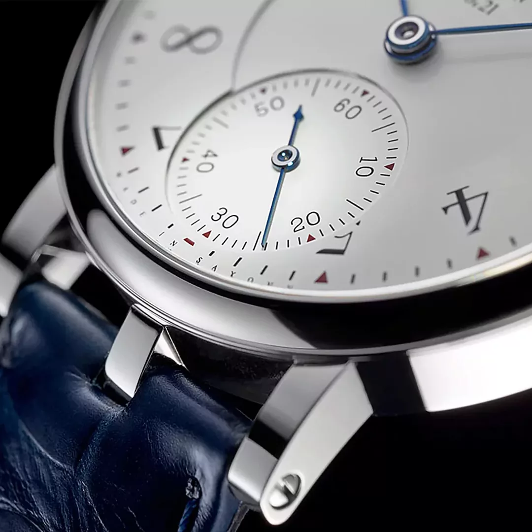 Reflecting the piety of its namesake, the Friedrich II timepiece is reduced to the essentials. The double-sunk dial is made of bright white lacquer and the chamfers are diamond-polished and rhodium-plated for finesse. The concentric Art Deco numerals and oversized, eccentric second give Freidrich II a fresh, uncomplicated style. Because the movement is inserted into the case from the front side, it is possible to adopt a larger dial, further enhancing the openness of this model.