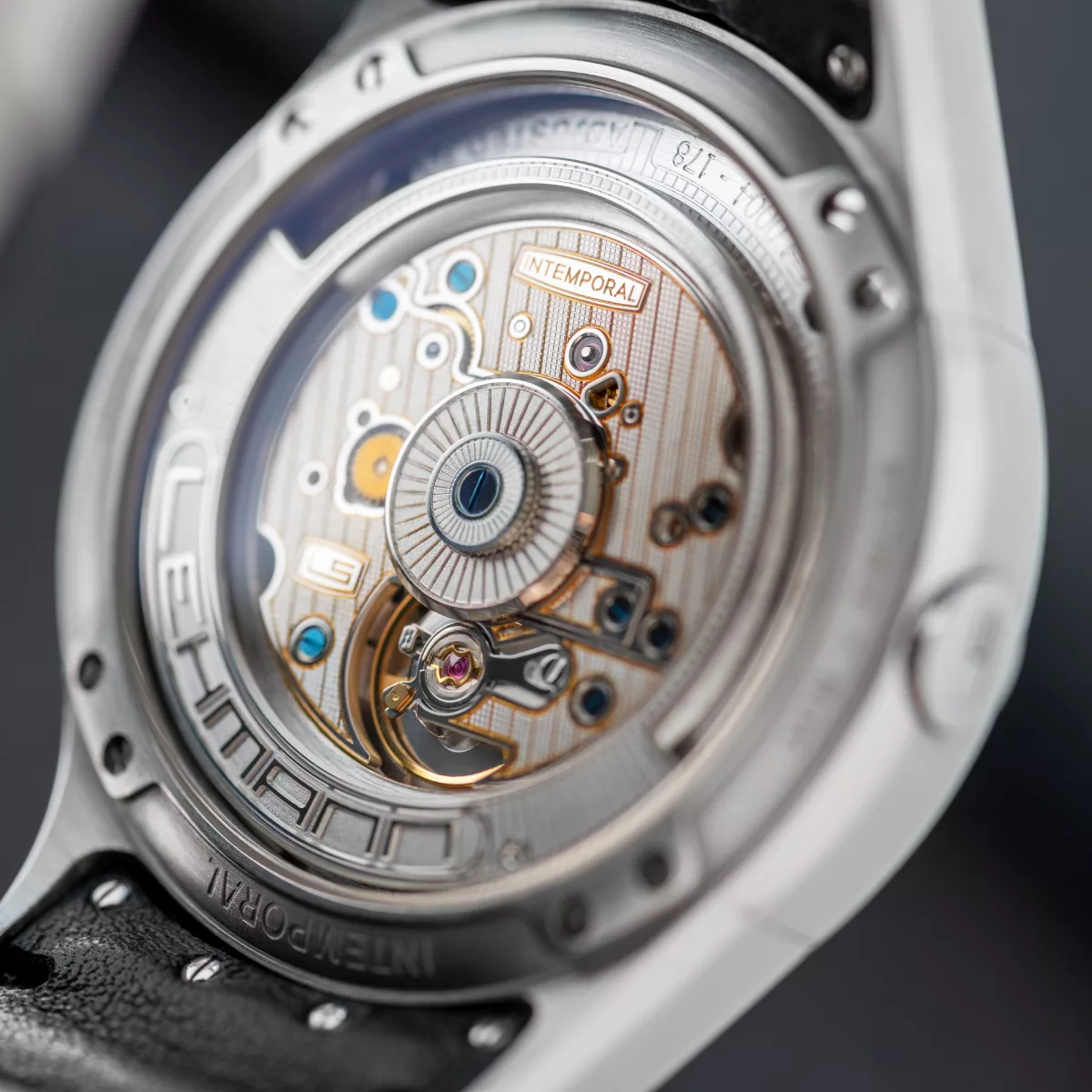 The finely engraved dial is divided in two sections. The date is read from a small date window which moves clockwise over a fixed date disc. That gives this Intemporal model a somewhat different face.