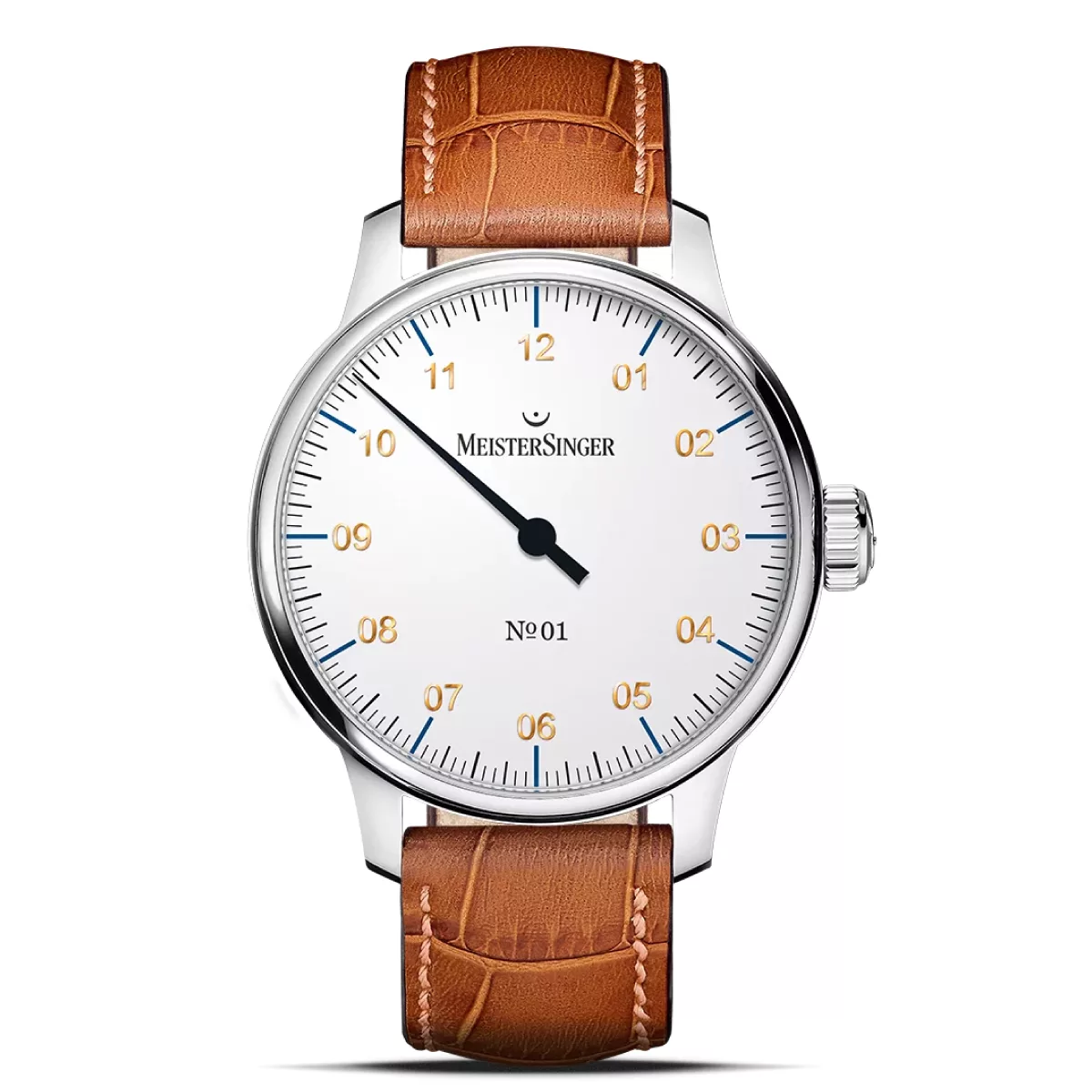 The №01 displays all the design details that characterize the entire MeisterSinger collection to this day: The functional typography with its continuous double-digit hour numerals from 01 to 12, the circumferential line structure, and the fine, needle-shaped hour hand. A watch cannot be designed more clearly, simply, and discreetly than that. In this version, it has a glossy white dial with gold hour markers and blue and black contrasting indices.