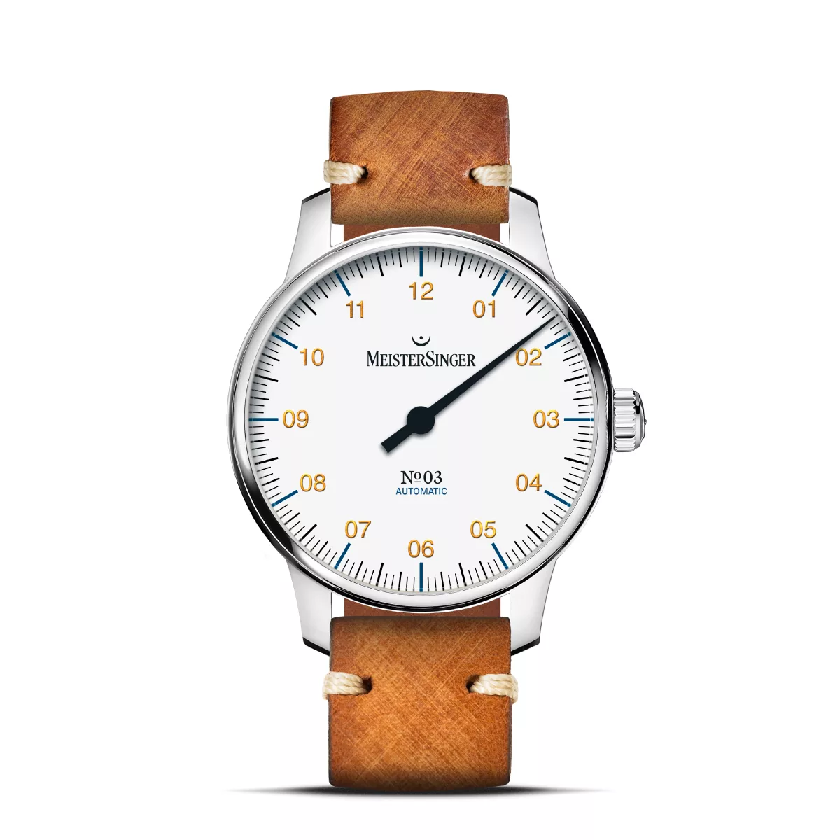 The MeisterSinger No03 – White is a refined interpretation of the brand’s iconic single-hand timekeeping philosophy. As the sister of the original MeisterSinger â„–01, this model maintains all the design details that define the collection: