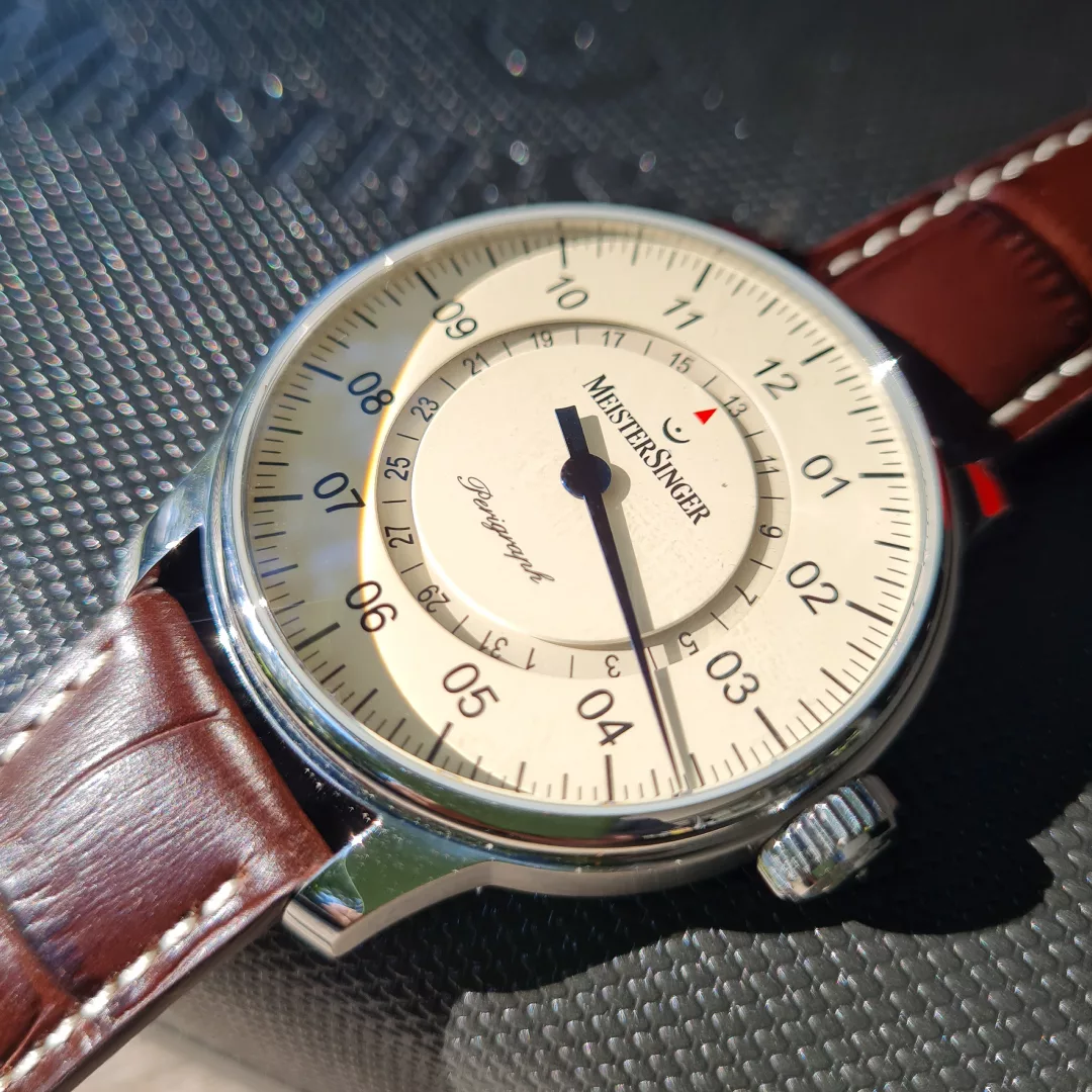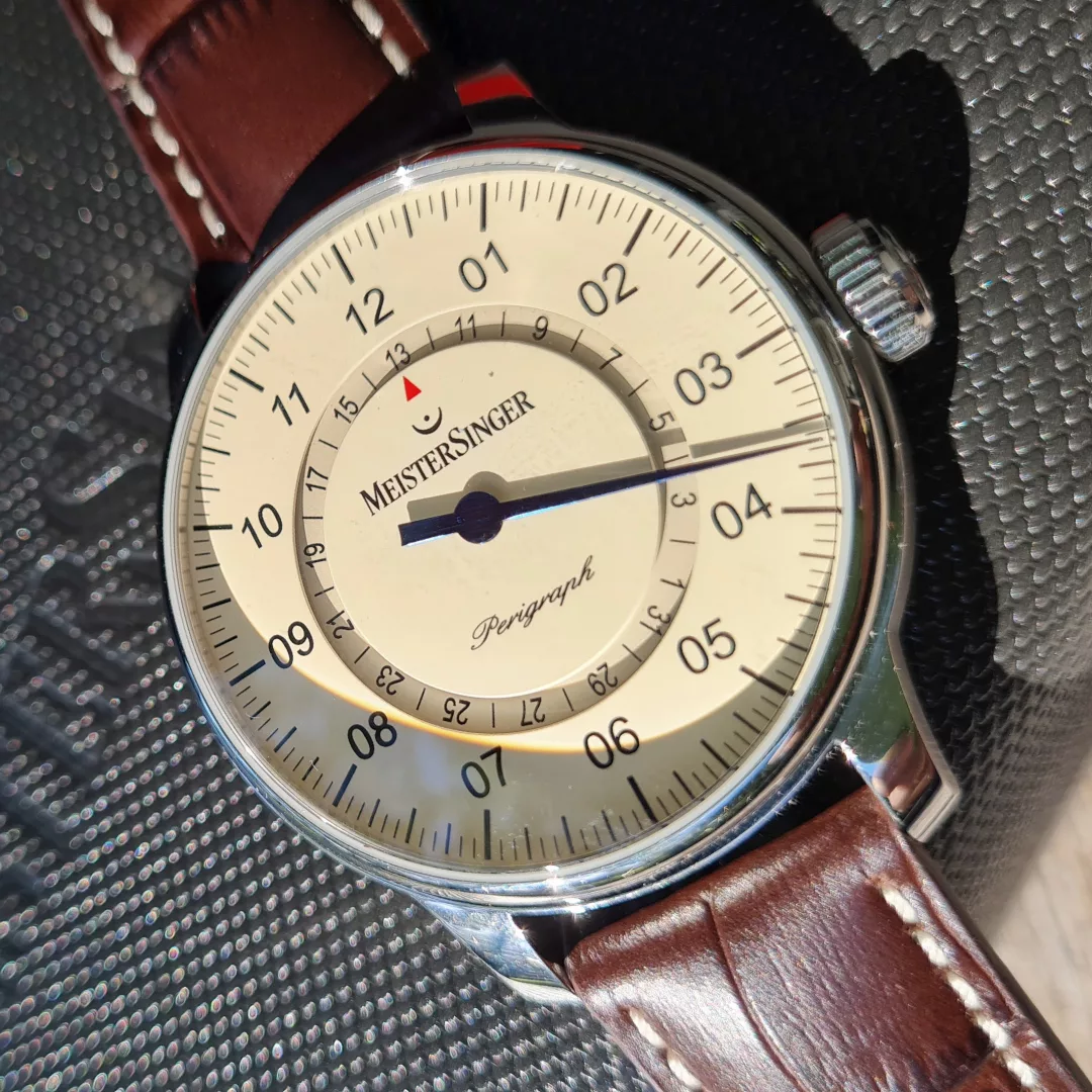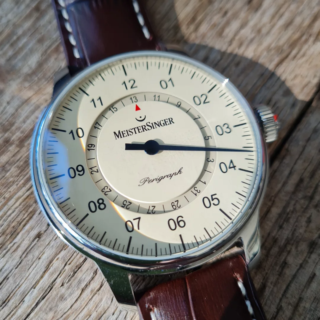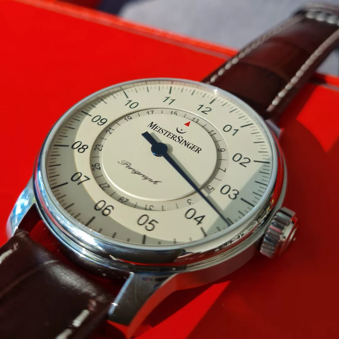 The Perigraph has long been considered a genuine classic of the MeisterSinger collection and shows no signs of fatigue, even after 20 years. The Perigraph’s unusual way of displaying the date earned it the prestigious Red Dot Design Award.