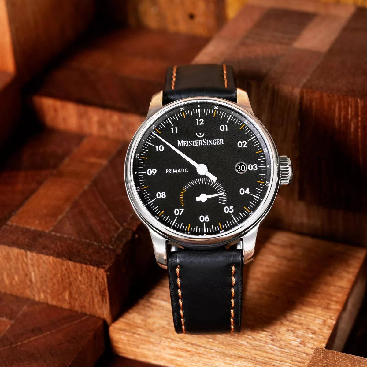 Designed with a jet black dial, the Primatic Black features white contrasts, with cognac-colored markers providing subtle highlights at the half-hours. The outer ring of the dial gives its face a certain depth and a particularly elegant character. The typical MeisterSinger circular date window is located adjacent to 3 o’clock, while its bezel is silver-plated and highly polished. The appealing scale of the power reserve indicator is located in the lower half of the dial.