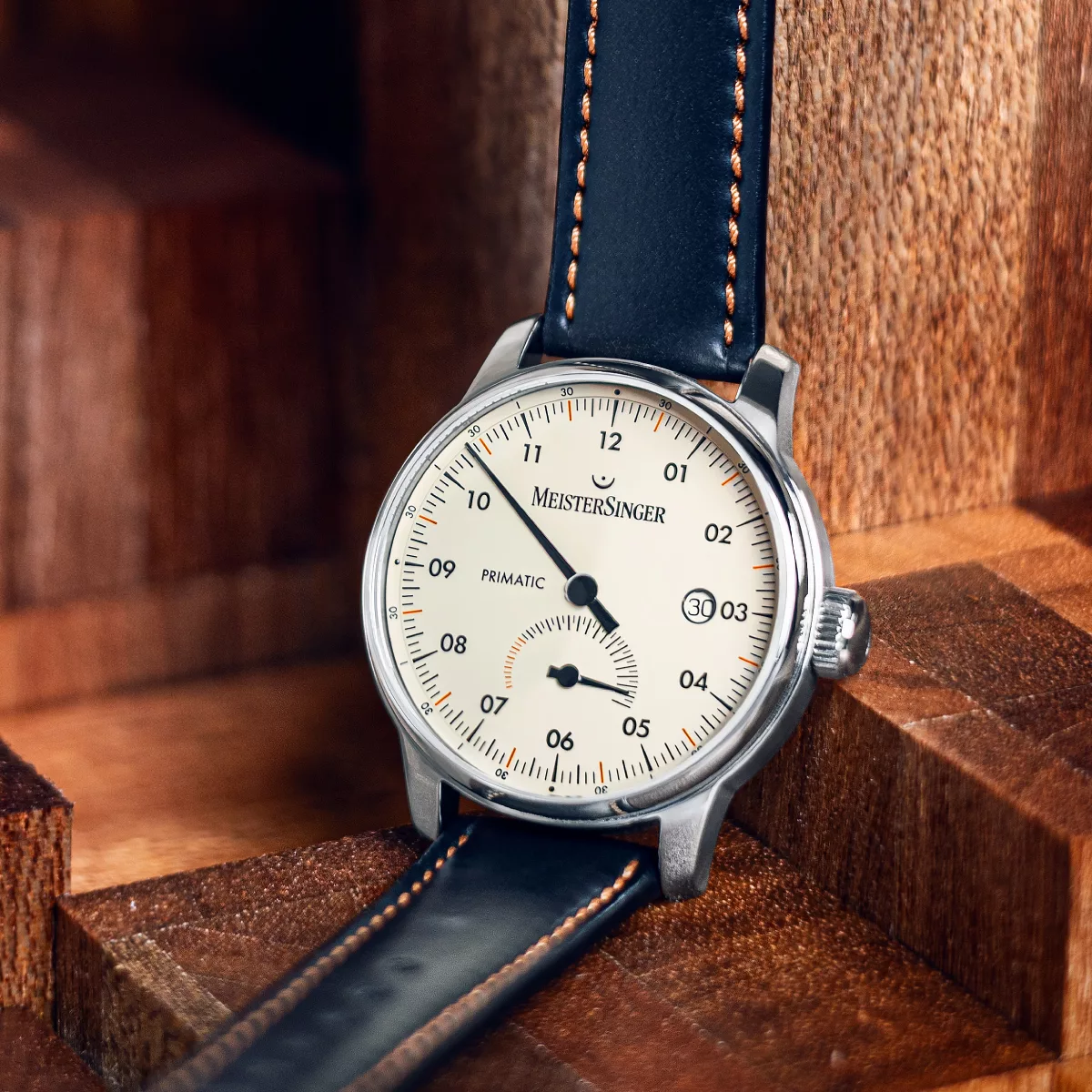 Designed in a classic ivory hue, the Primatic features black contrasts, while cognac-colored markers at the half-hours provide some subtle highlights. The outer ring of the dial gives its face a certain depth and a particularly elegant character. The typical MeisterSinger circular date window is located adjacent to 3 o’clock, while its bezel is silver-plated and highly polished. The appealing scale of the power reserve indicator is located in the lower half of the dial.