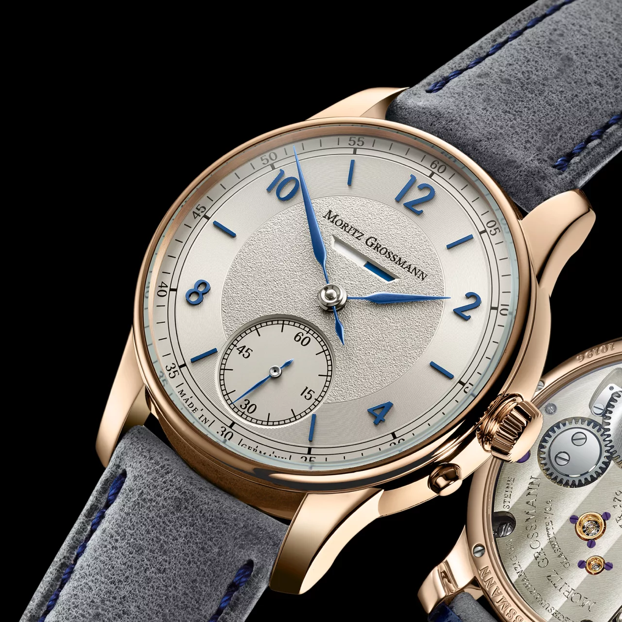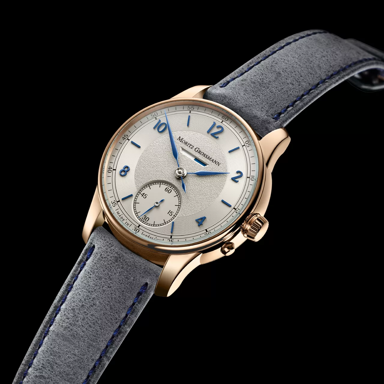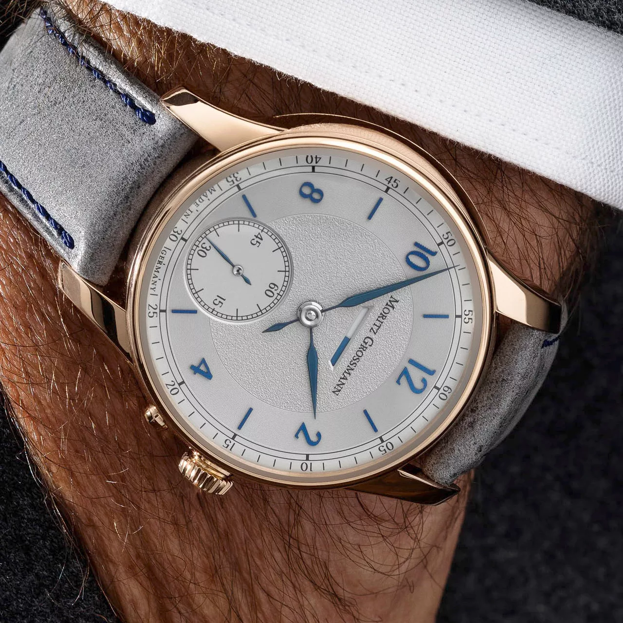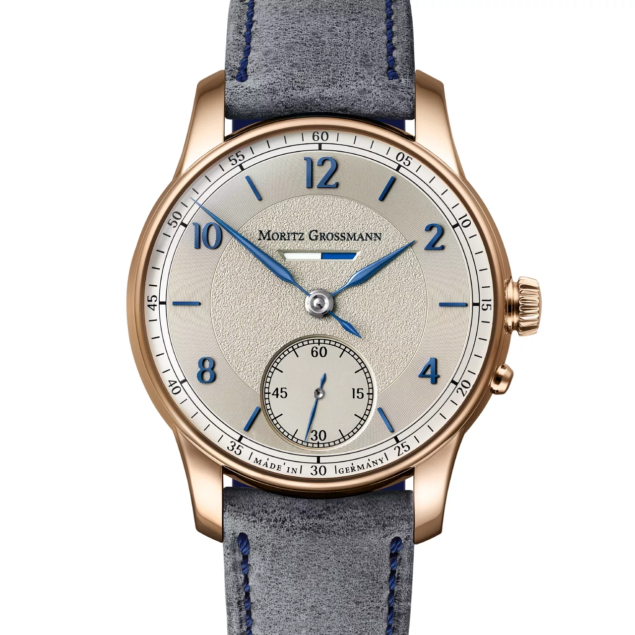 The dial of the BENU Power Reserve showcases the manufactory’s mastery of design. Presented in argenté with a circular Azurage pattern, the surface catches light in subtle, shifting ways. Blue appliqué numerals and indices enhance the refined appearance, while the newly crafted steel hands – tempered to a brilliant blue – display a delicate curvature and precision finish that highlight Moritz Grossmann’s artisanal excellence. These elements come together to create a dial that is both timeless and distinctively modern.
