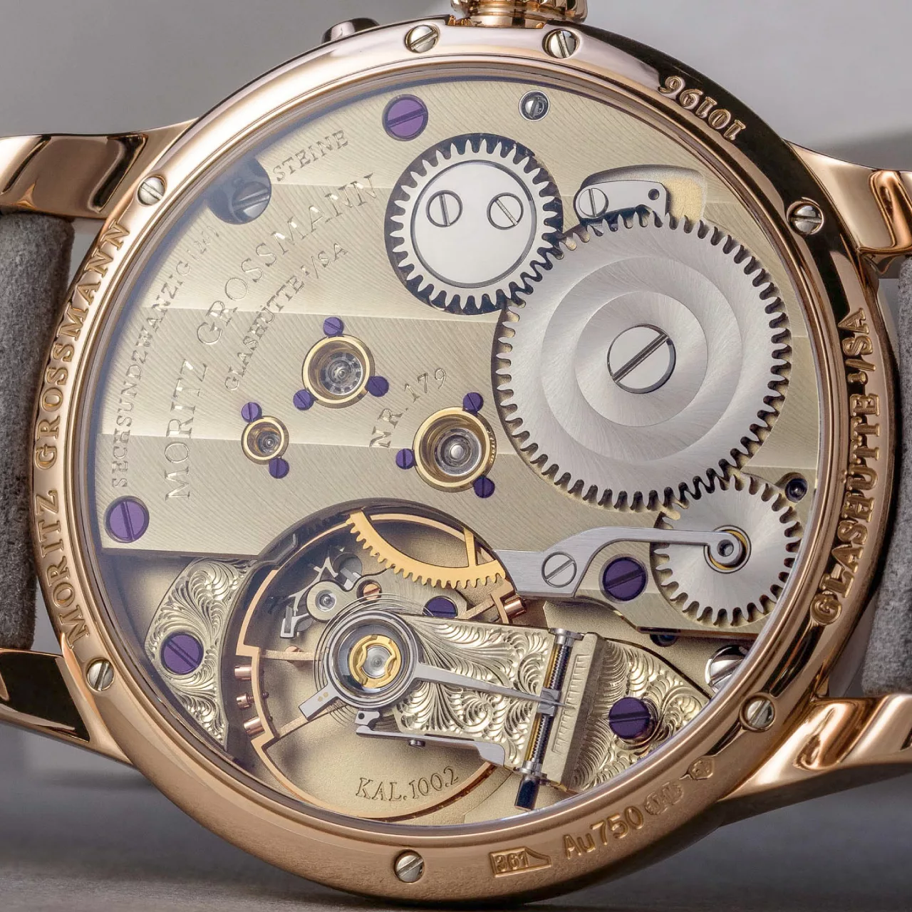 - Special Features: Grossmann balance, hand-engraved balance and escape-wheel cocks, 3-band snailing on ratchet wheel, raised gold chatons, removable clutch winder, stop seconds for precise setting
