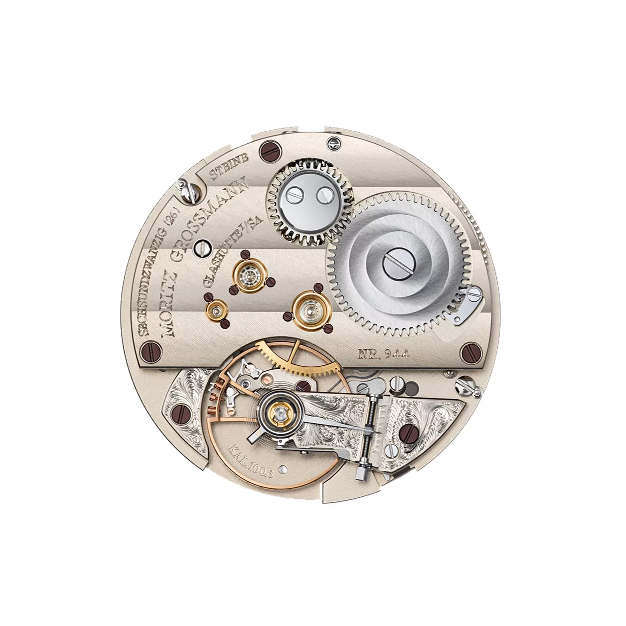 - Functions: Hours, minutes, subsidiary seconds with stop seconds, second time zone (24-hour display), Grossmann manual winder with pusher