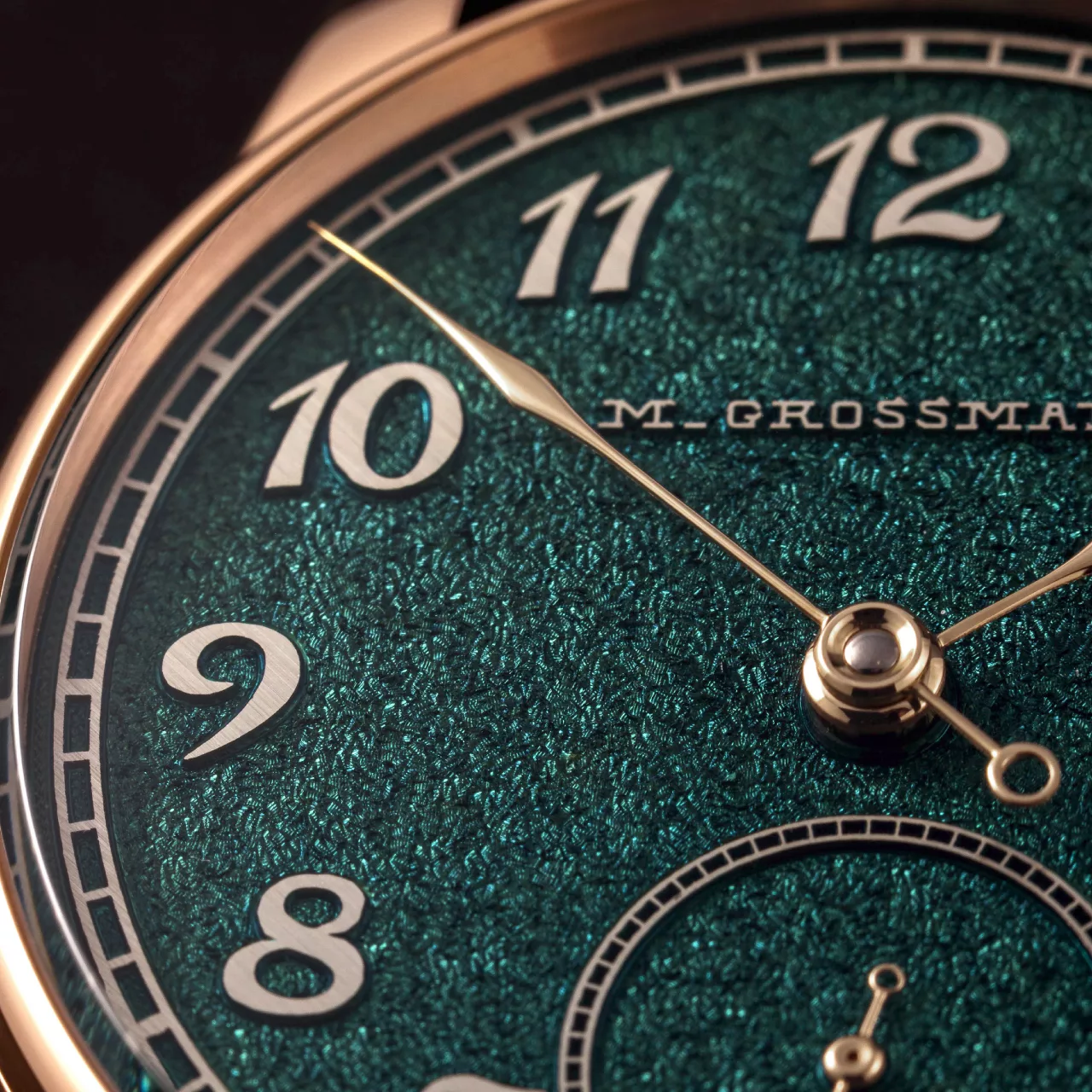 At the heart of this timepiece is a dial made from untreated German silver, painstakingly hand-engraved with a fine tremblage texture that diffuses light for a soft, matte finish. The dial’s subtle green hue, chosen for its deep symbolism of harmony, nature, and renewal, adds a contemporary yet understated flair. The hour numerals, small seconds subdial, and historical Moritz Grossmann signature rise from the dial, creating a multi-dimensional display of classic elegance.