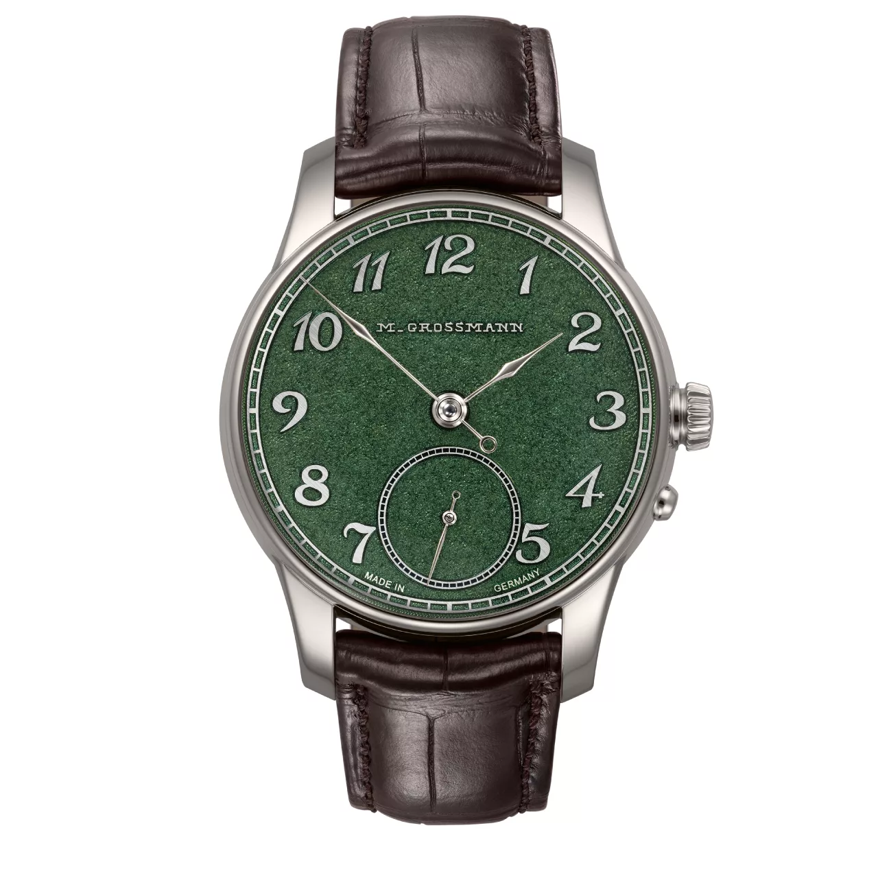 The dial’s three-dimensional structure adds to the visual experience, with raised hour numerals, a small seconds subdial, and the historical ‘M. Grossmann’ logo dating back to 1875 — a tribute to the Glashütte pioneer himself. All indices and inscriptions are finely brushed, adding refinement and character to the dial’s surface.