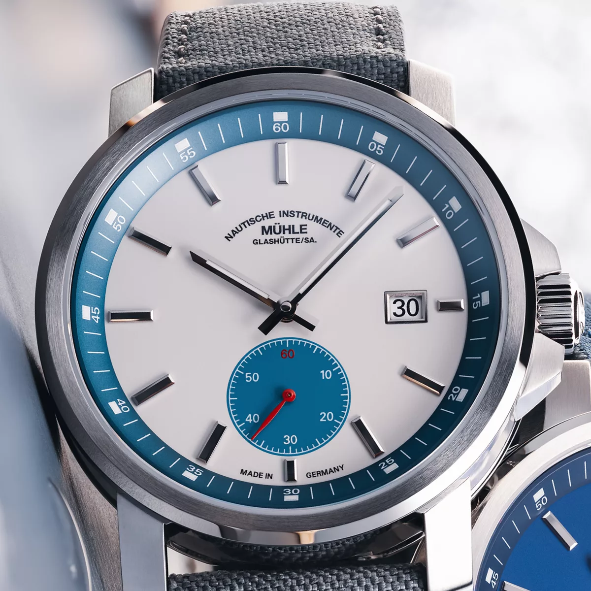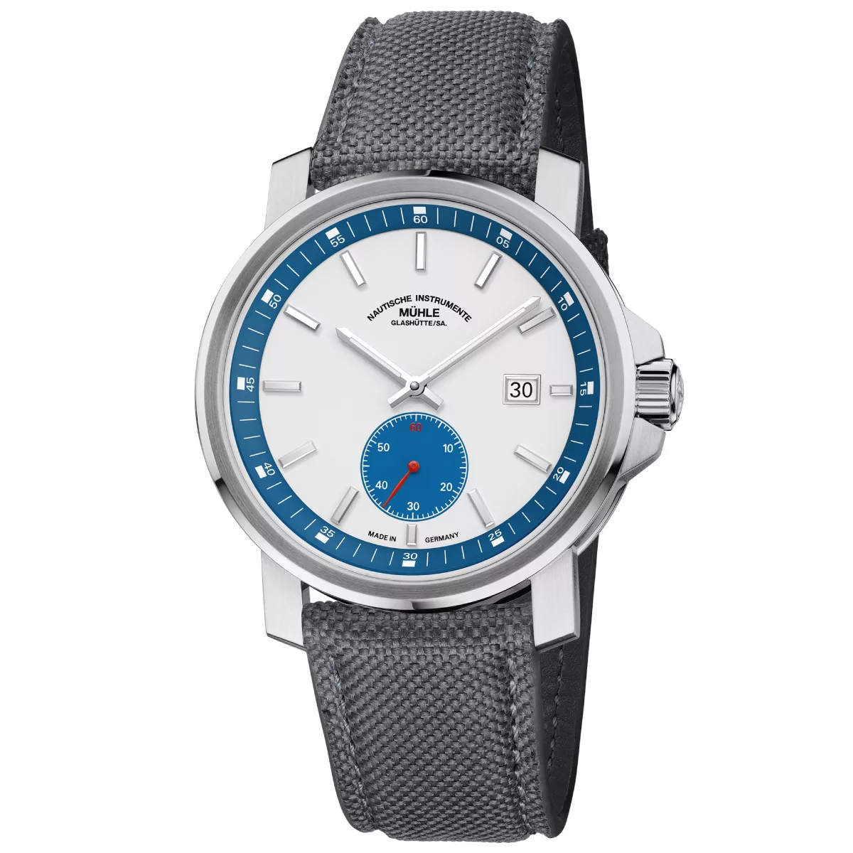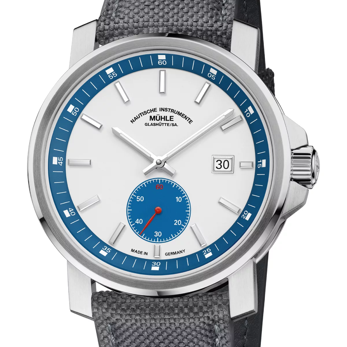 Secured by a dark grey canvas strap with Mühle’s pin buckle, the watch rests on a high-quality stainless steel case. This case features various surface finishes that create a dynamic array of light reflections, akin to sunlight dancing on the waves. The bezel combines a brushed top surface with finely polished sides, while the vertical-finished sides are framed by both the bezel and the screwed-on back.