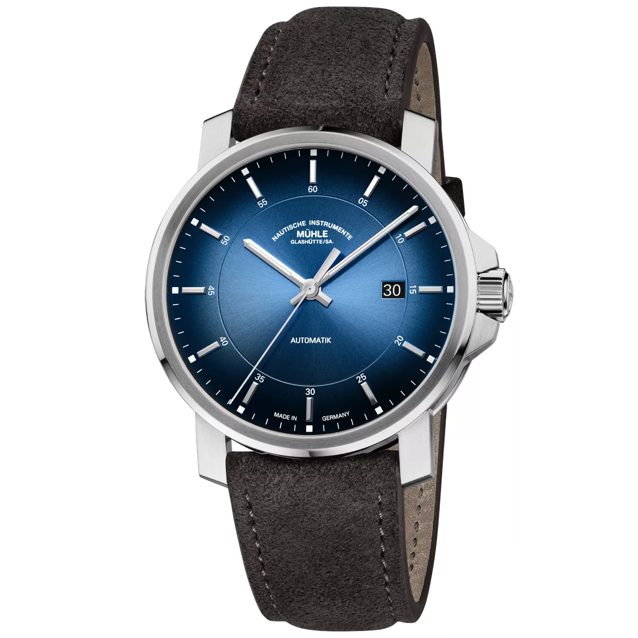 The dial is both stylish and practical, featuring a fine sunburst finish and a gradient tone that darkens towards the edge, providing excellent contrast for legibility. Applied indices and luminous-coated hands ensure clarity in all lighting conditions, reflecting Mühle’s long-standing reputation for precision and readability.