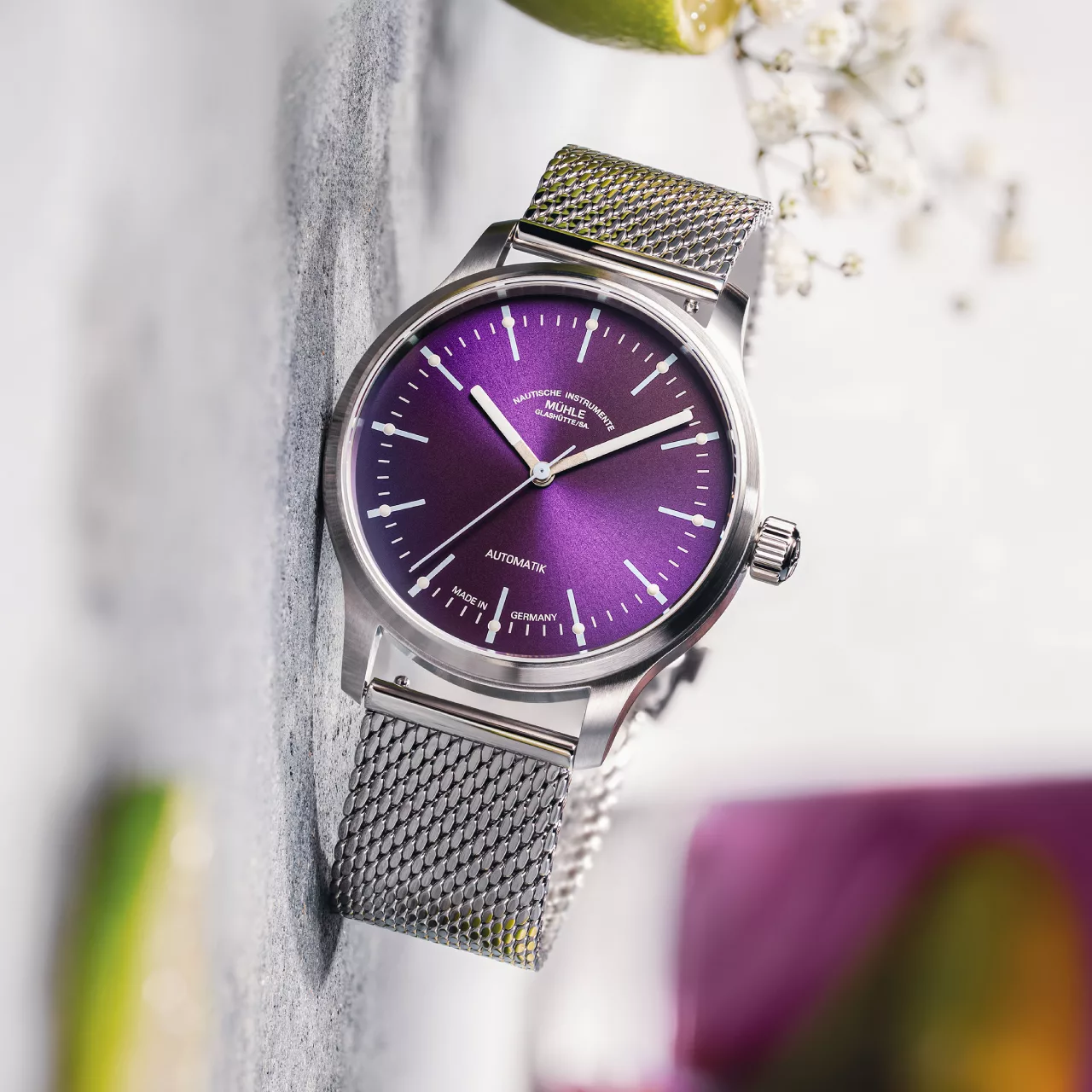 Inside, the SW 200-1 Mühle-modified automatic movement keeps precise time, featuring Mühle’s signature woodpecker neck regulation. This system allows fine adjustment in six positions, achieving a rate between 0 and +8 seconds per day – in line with chronometer standards. The Panova Violet Milanese is a watch designed for those who appreciate striking design, German precision, and a watch that makes every day feel like a summer escape.