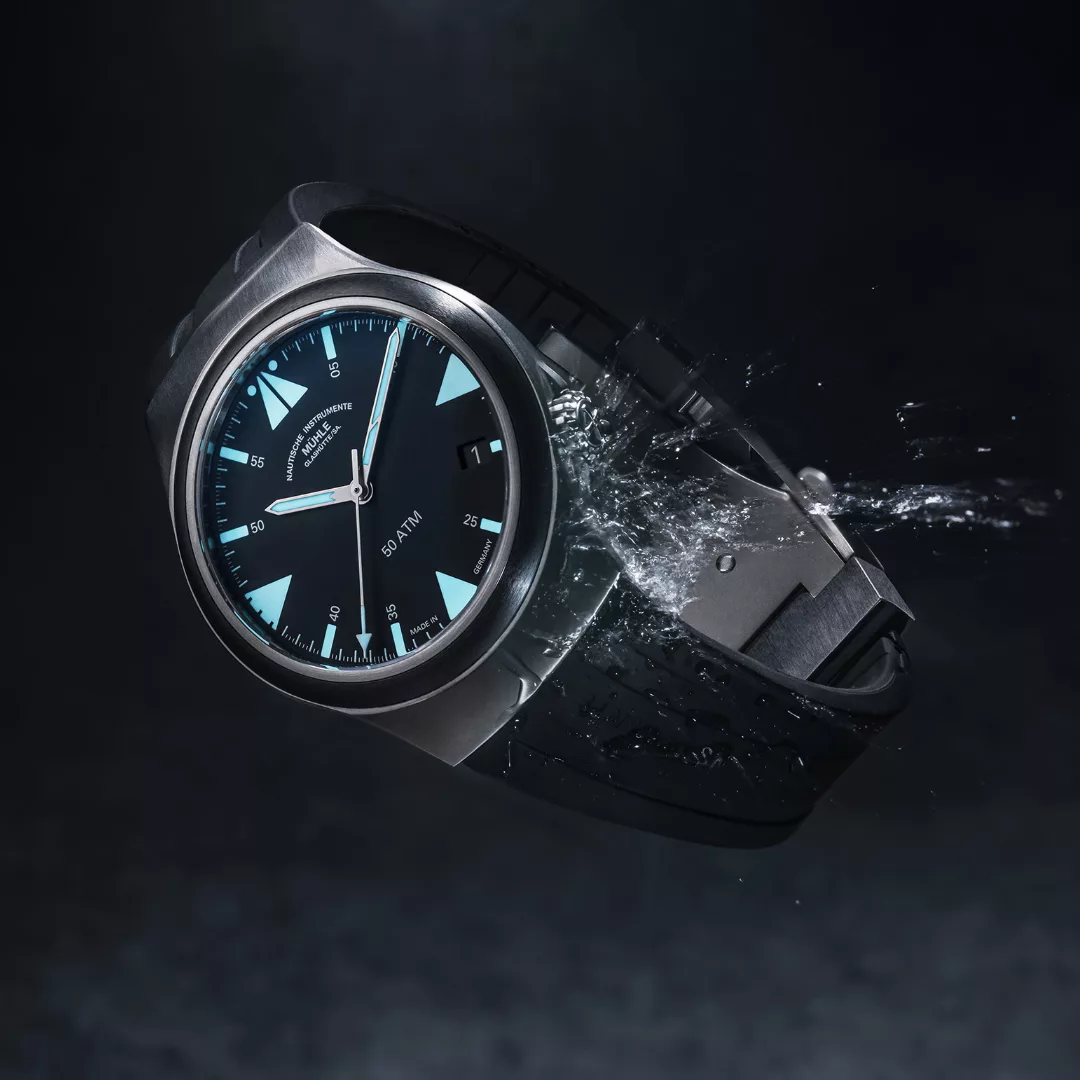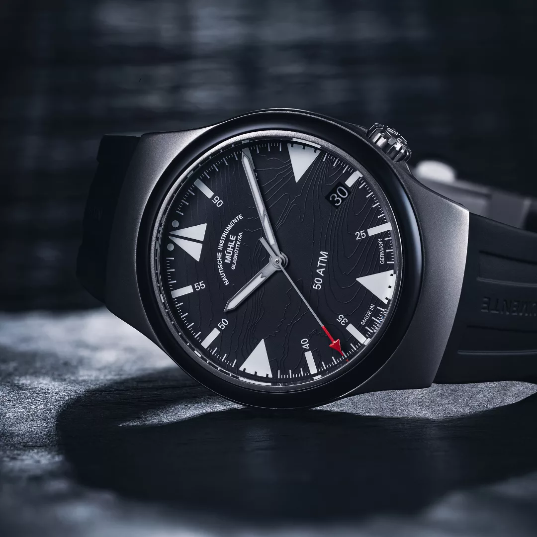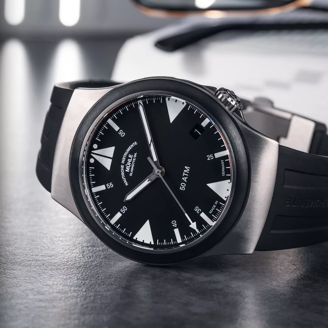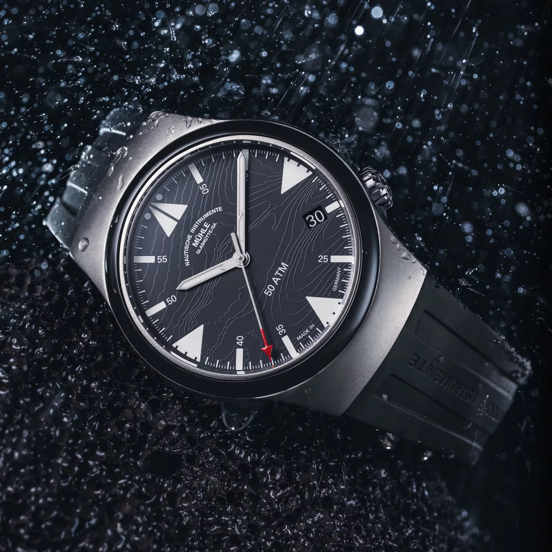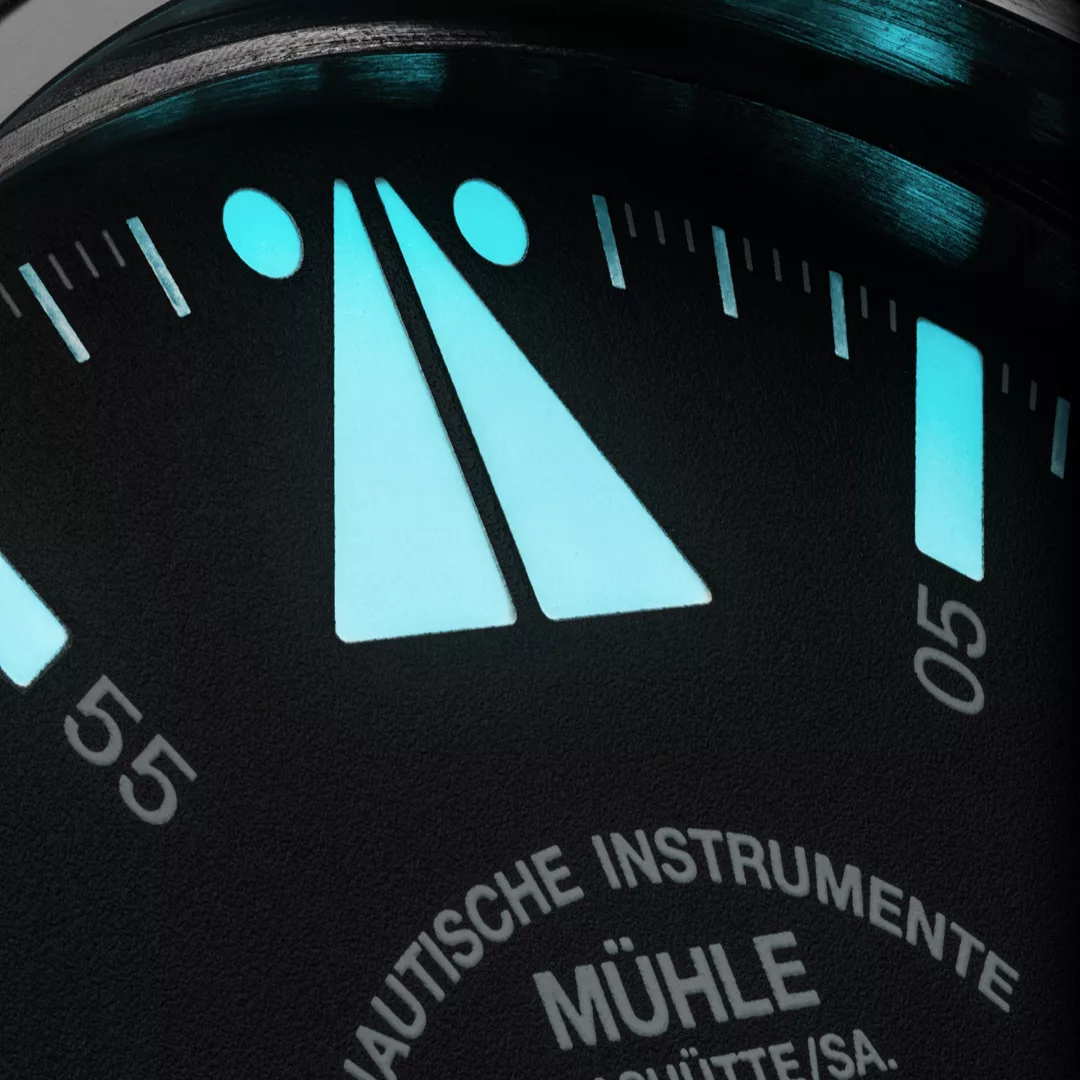 Built with the same robust reliability as Mühle’s renowned S.A.R. line, this Mission-Timer boasts a 43 mm titanium case and a ceramic bezel, offering 50 bar water resistance and supreme legibility. The double anti-reflective sapphire crystal, oversized date window, and shock-resistant woodpecker neck regulation reinforce its professional-grade construction. A rubber strap with titanium folding clasp ensures comfort and durability, even in harsh sea conditions.