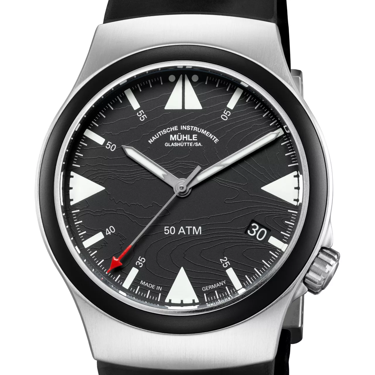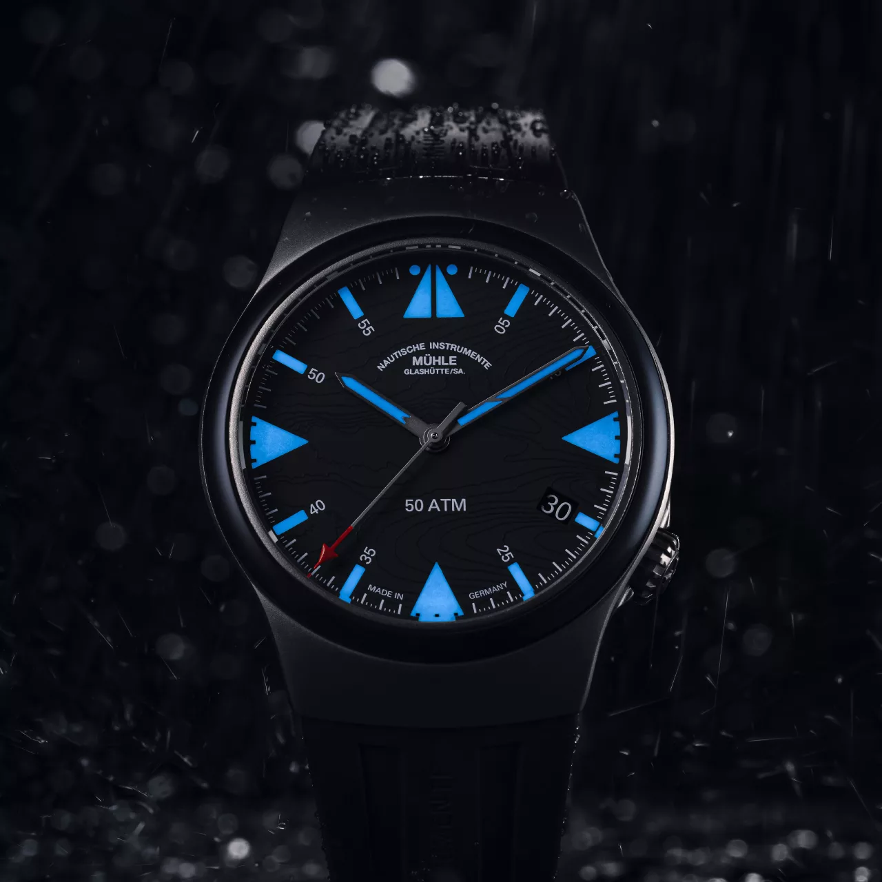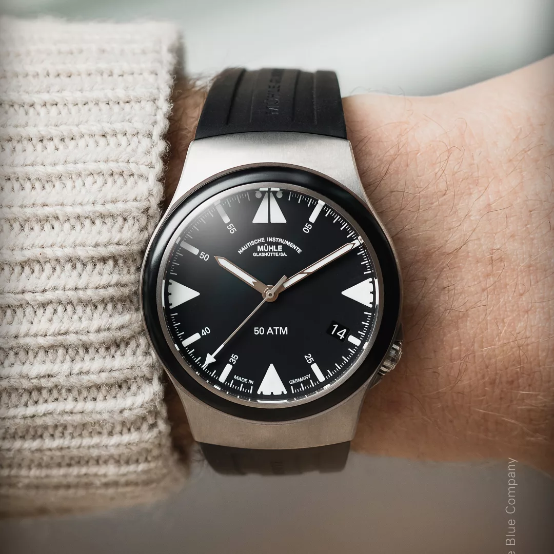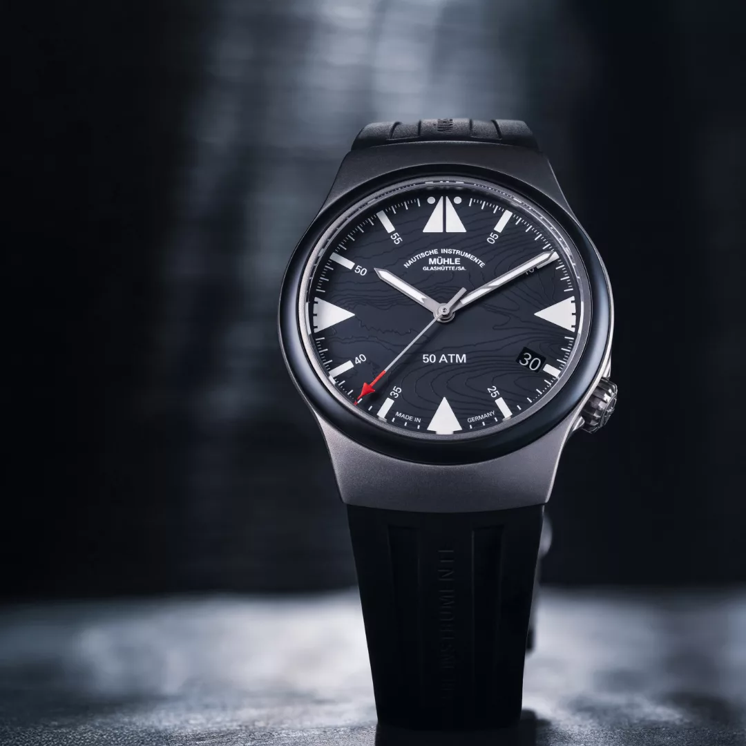 Built with the same robust reliability as Mühle’s renowned S.A.R. line, this Mission-Timer boasts a 43 mm titanium case and a ceramic bezel, offering 50 bar water resistance and supreme legibility. The double anti-reflective sapphire crystal, oversized date window, and shock-resistant woodpecker neck regulation reinforce its professional-grade construction. A rubber strap with titanium folding clasp ensures comfort and durability, even in harsh sea conditions.